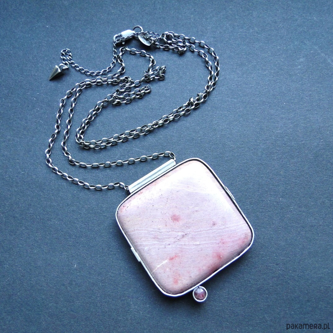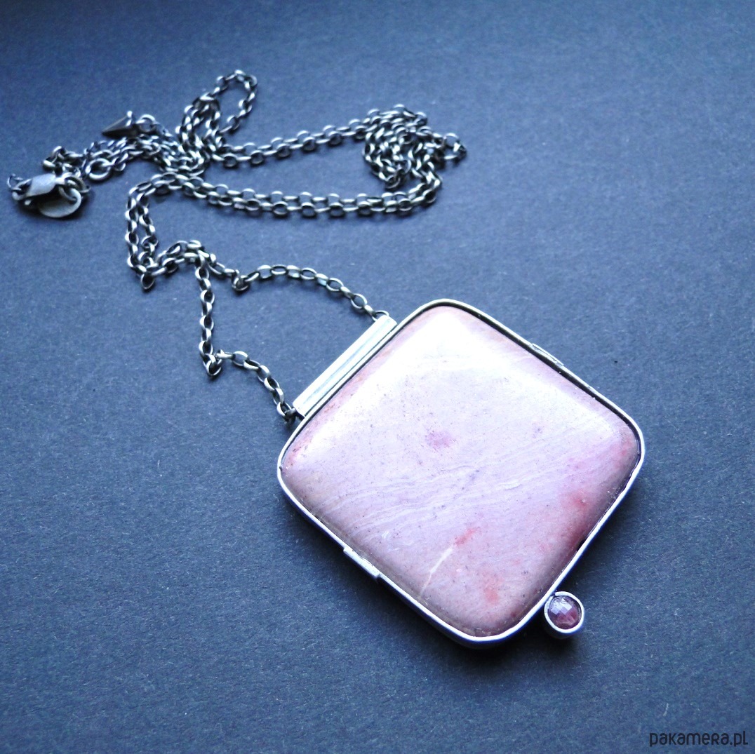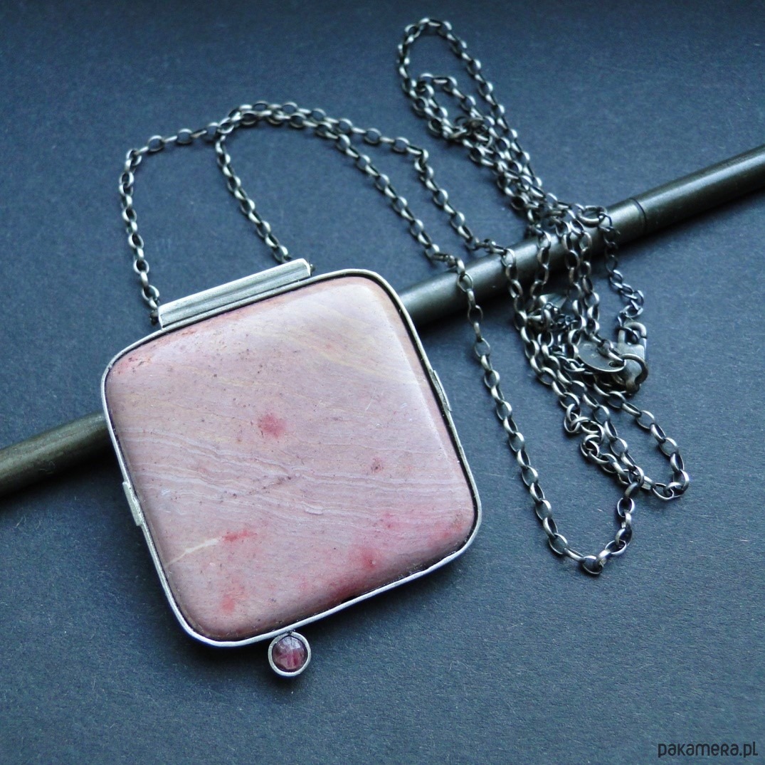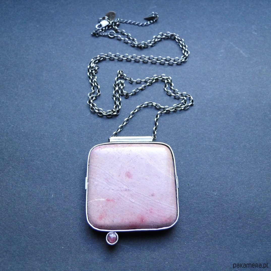 Surowy, masywny wisior w pudowym różu. Wykonany ręcznie wg tradycyjnych technik jubilerskich. Srebro 930,oksydowane i szorowane. Kamienie: duży, gładki rodonit 4x4 cm w odcieniach zgaszonego różu,doł ciemniejszy; mały spinel w malinowym kolorze,fasetowany śr. 4mm. Grubszy łańcuch z owalnyhc oczek 2x3mm.Łańcuch dł. 70 cm plus przedłużka 7 cm. Nie moczyć w wodzie. Do zestawu kolczyki (jedyny egzemplarz).