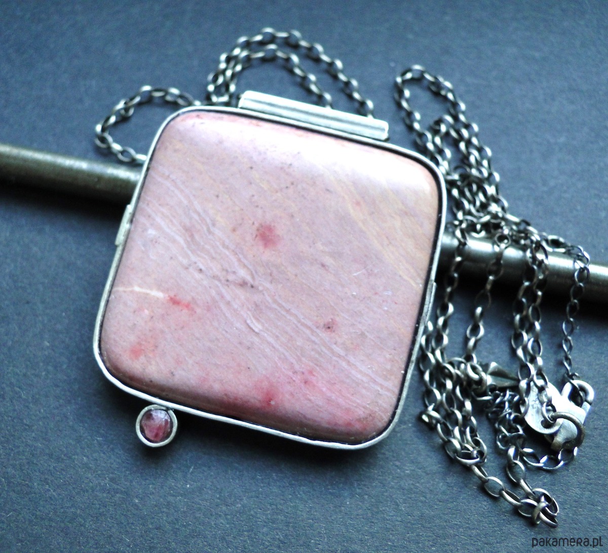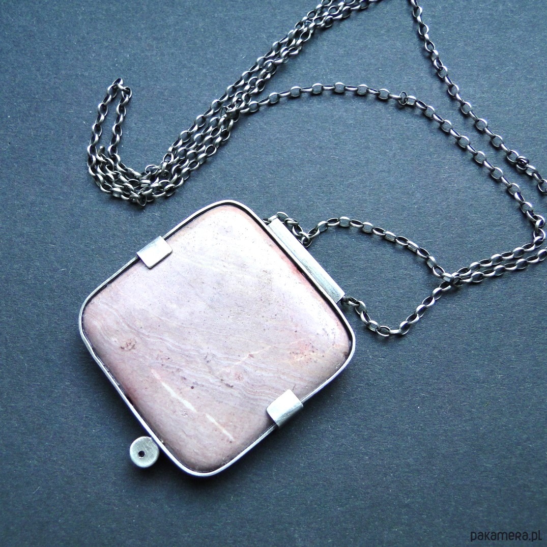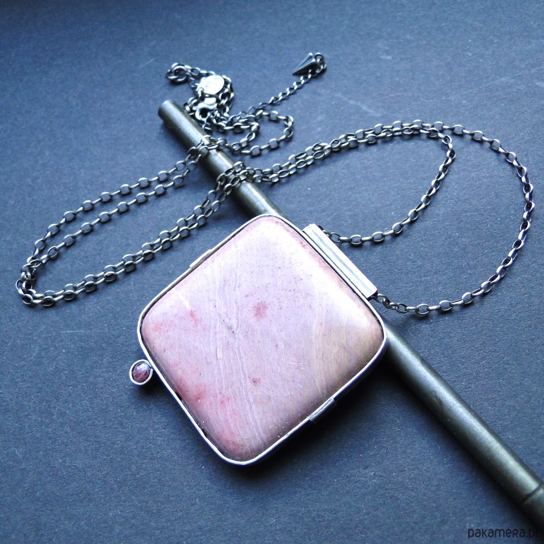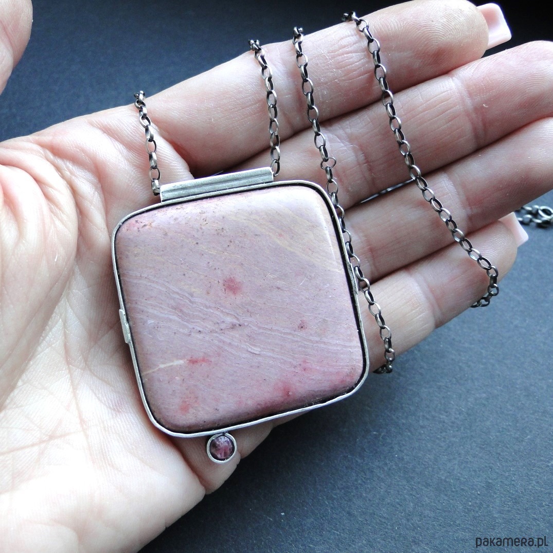 Surowy, masywny wisior w pudowym różu. Wykonany ręcznie wg tradycyjnych technik jubilerskich. Srebro 930,oksydowane i szorowane. Kamienie: duży, gładki rodonit 4x4 cm w odcieniach zgaszonego różu,doł ciemniejszy; mały spinel w malinowym kolorze,fasetowany śr. 4mm. Grubszy łańcuch z owalnyhc oczek 2x3mm.Łańcuch dł. 70 cm plus przedłużka 7 cm. Nie moczyć w wodzie. Do zestawu kolczyki (jedyny egzemplarz).