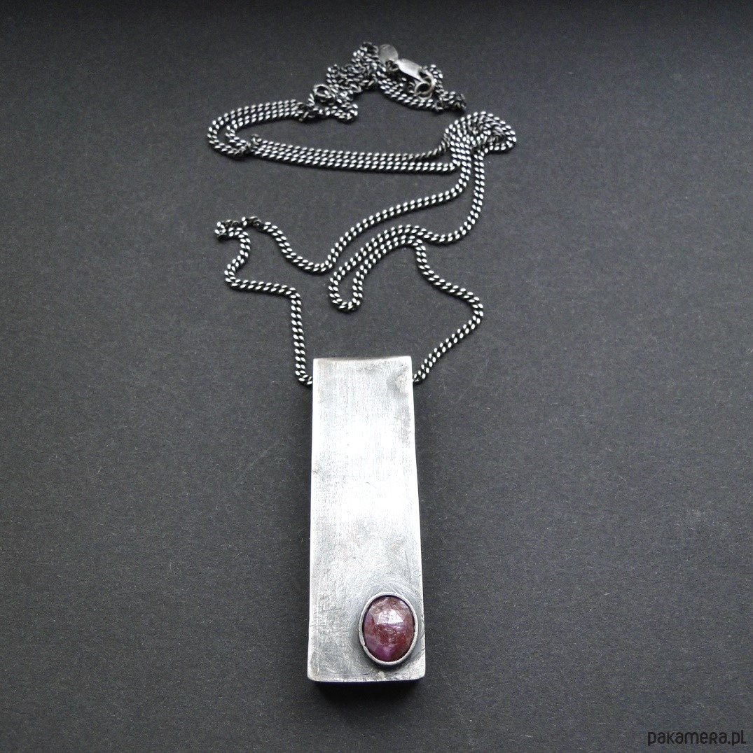 Surowy, okazały wisior z unikatowym naturalnym rubinem. Modny design. Srebro pr.925,oksydowane i szorowane. Surowe wykończenie. Rubin należy do klasy kamieni szlachetnych. Ten jest w formie owalnej, fasetowany dł.11mm. Waga wisiora 31 g. Łańcuch dość masywny dł 77 cm. Do kompletu dodaje rzemień brązowy w ręcznie wykonanej oprawie, dł.90 cm (możliwe skrócenie). Sama zawieszka ma 6 cm,jest pusta w środku,lekko zwęża się ku górze. Nie moczyć w wodzie.