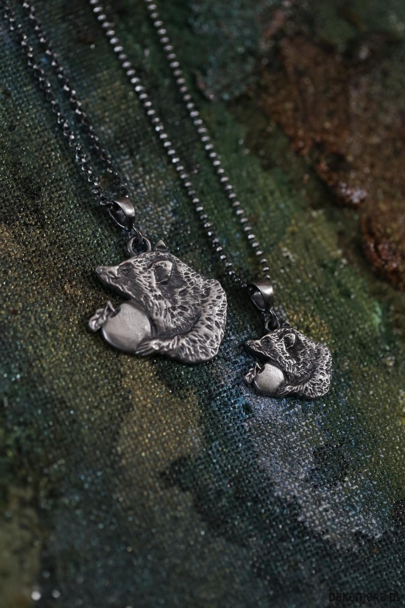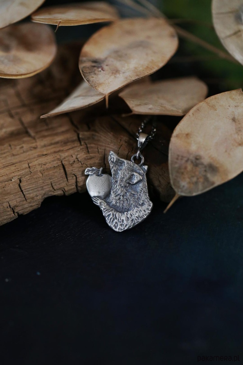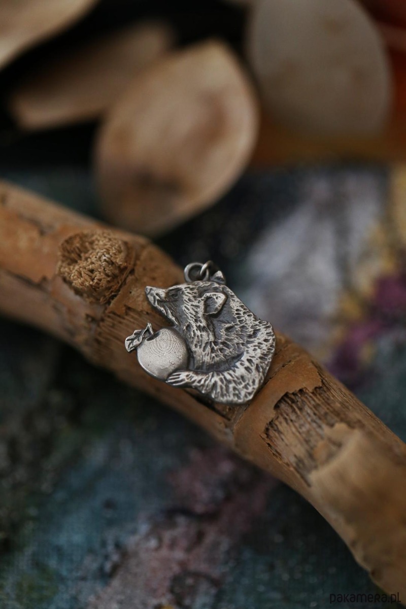 Szop jest jednym ze zwierzaków spod znaku marki Cztery Humory. Wisiorek powstał według autorskiego projektu. Srebro pokryto oksydą, nadającą mu stalowo - szary odcień i przetarto dla wydobycia szczegółów zawieszki.