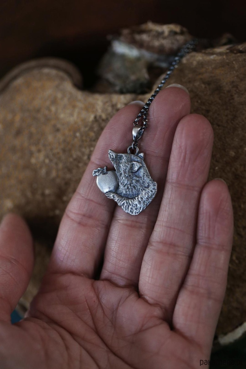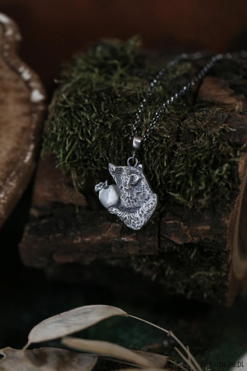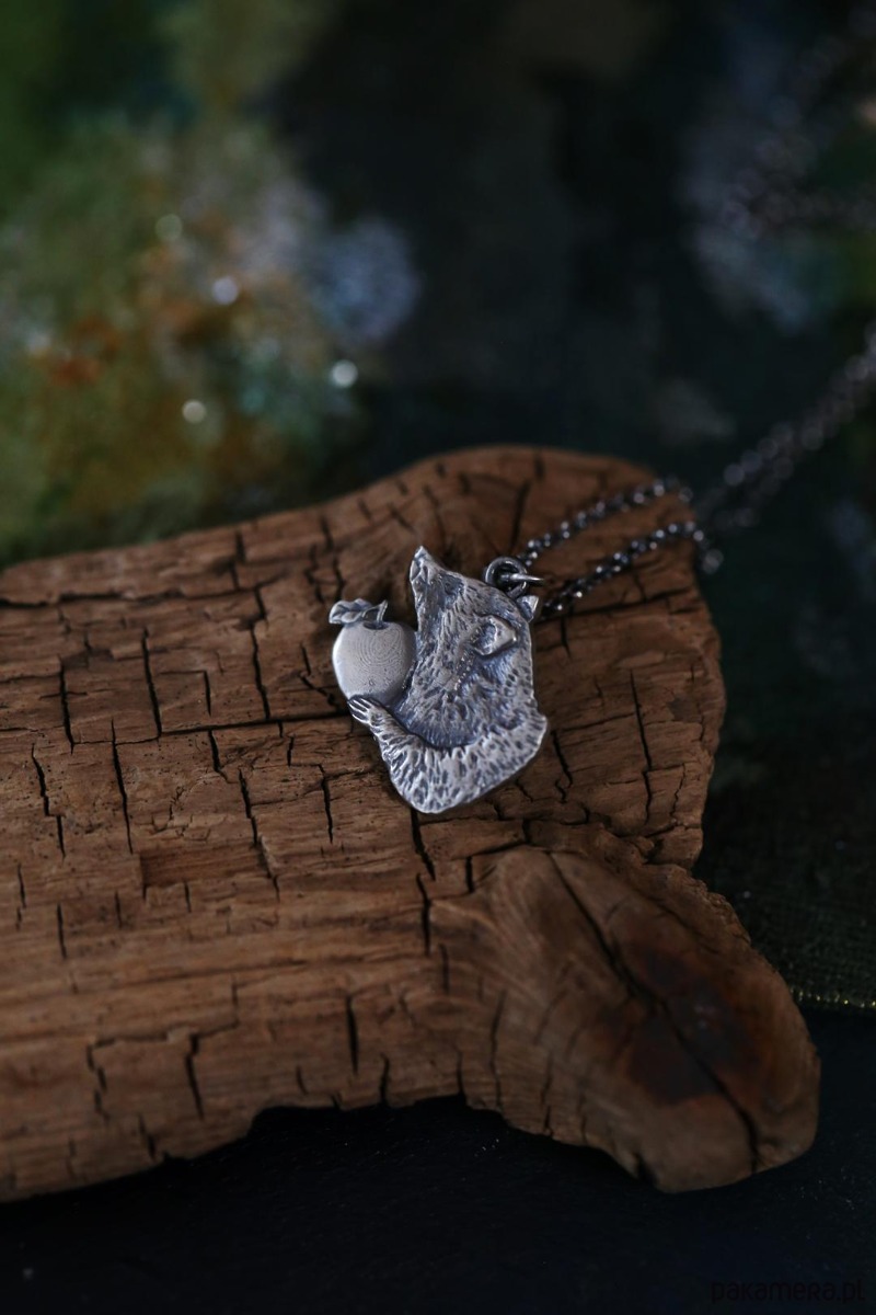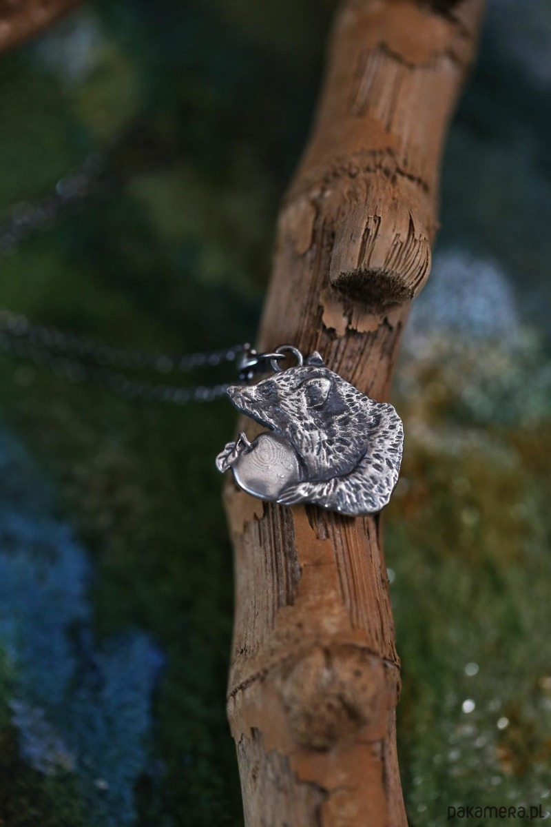 Szop jest jednym ze zwierzaków spod znaku marki Cztery Humory. Wisiorek powstał według autorskiego projektu. Srebro pokryto oksydą, nadającą mu stalowo - szary odcień i przetarto dla wydobycia szczegółów zawieszki.