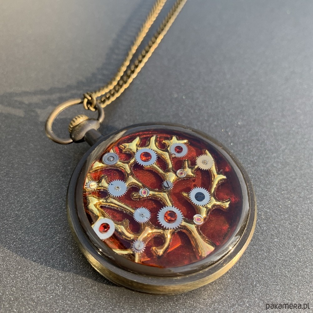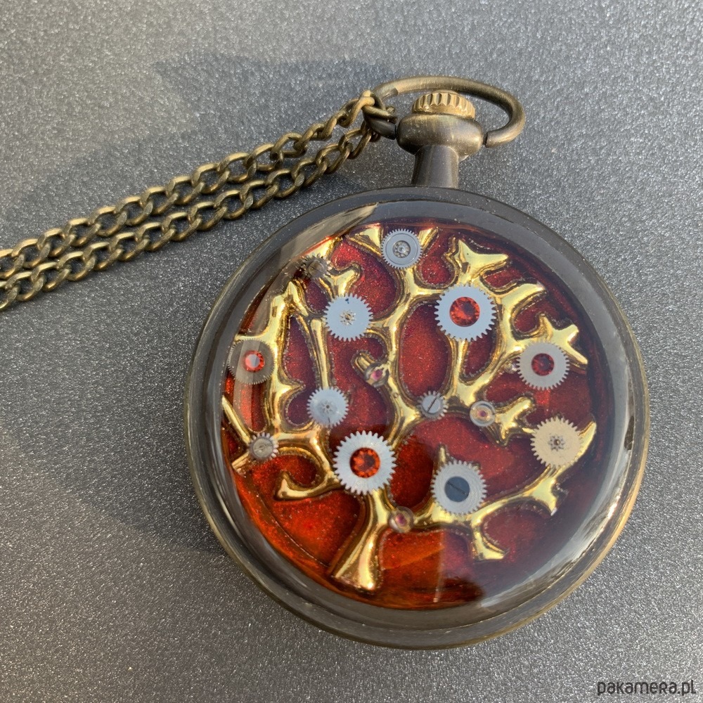 Unikat! Jedna sztuka!Wisior dwustronny, bez względu na to jak się ułoży na piersi jest magiczny. Układany ręcznie w autorskiej technice trójwymiarowej. Czerwone tło i złote drzewo ozdobione trybikami.