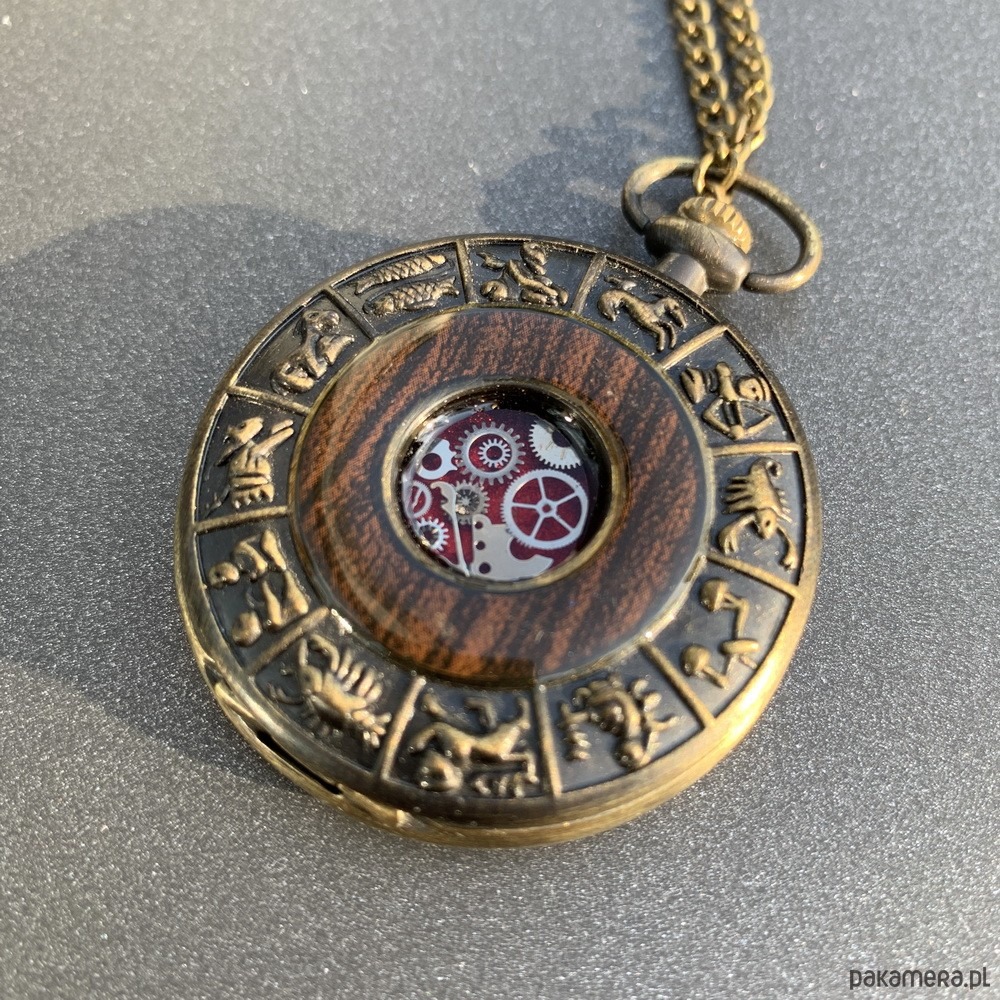 - Materiał: trybiki i elementy ze starego mechanizmu zegarka- Średnica: ok 5 cm- Zawieszka: łańcuszek na szyję 65 cm