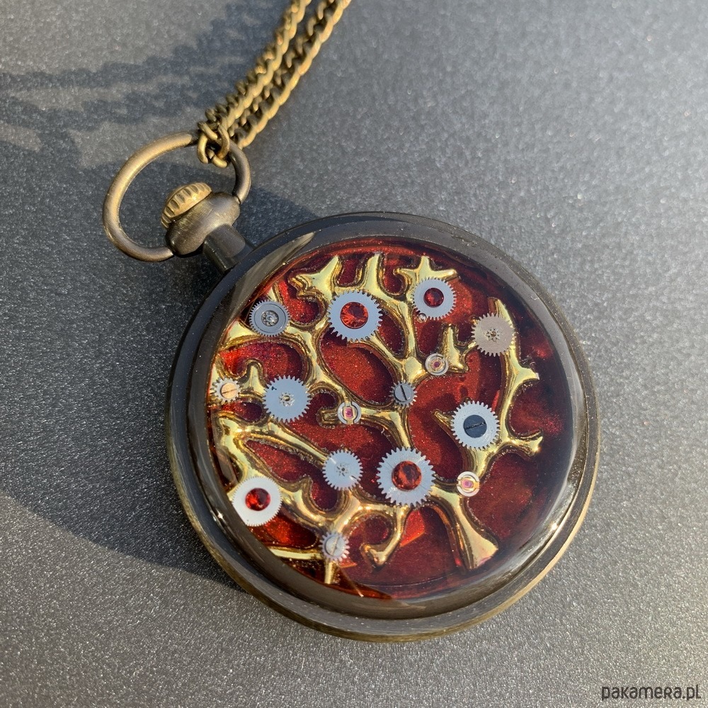 Unikat! Jedna sztuka!Wisior dwustronny, bez względu na to jak się ułoży na piersi jest magiczny. Układany ręcznie w autorskiej technice trójwymiarowej. Czerwone tło i złote drzewo ozdobione trybikami.