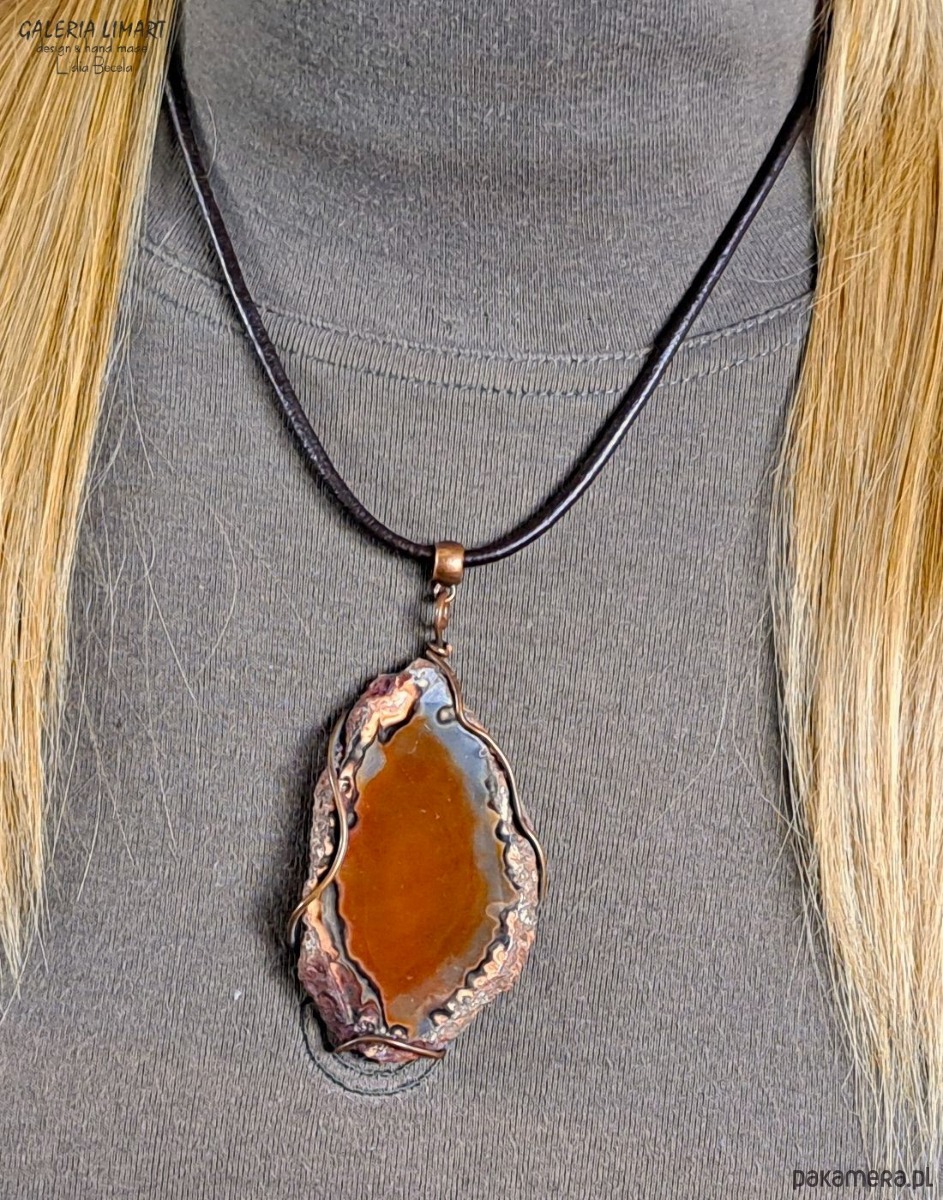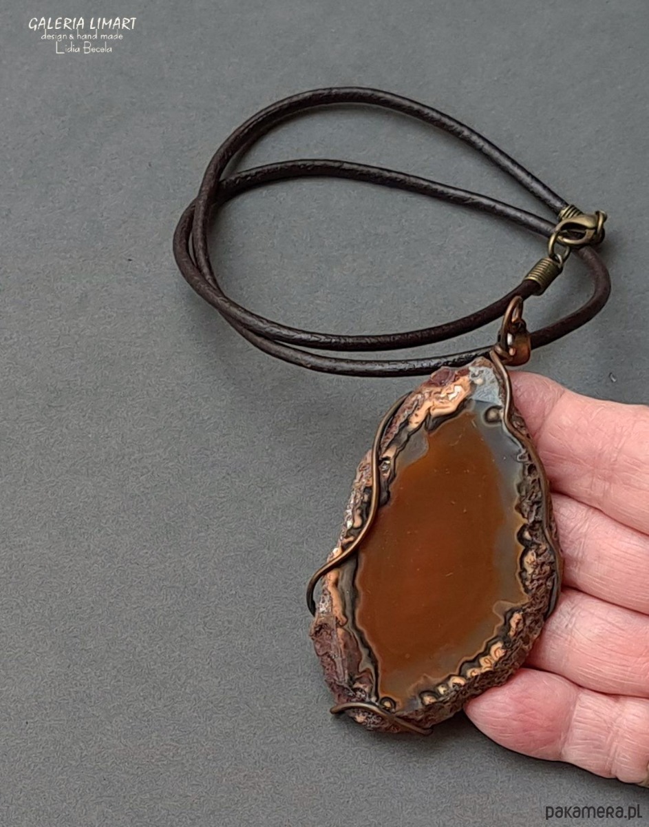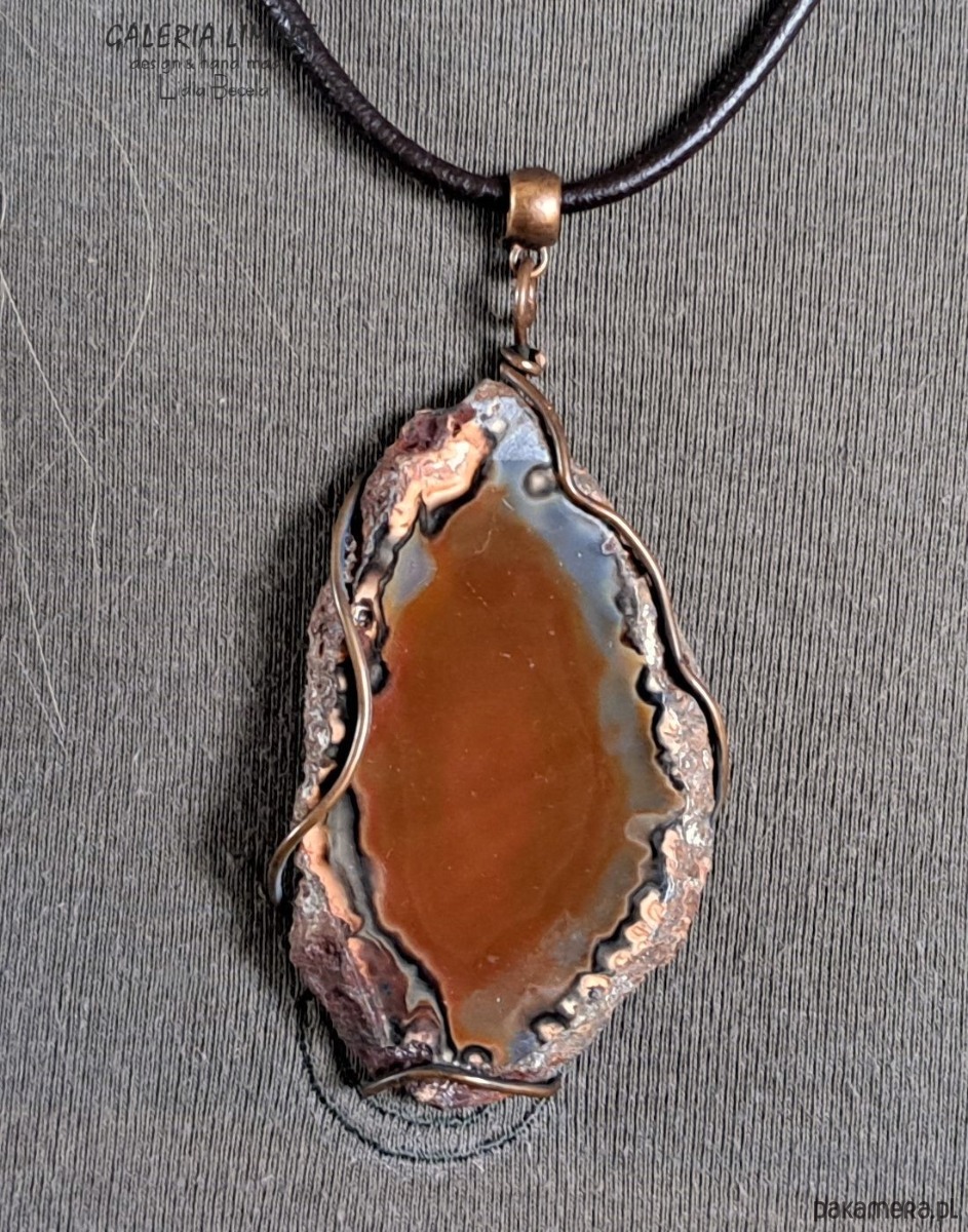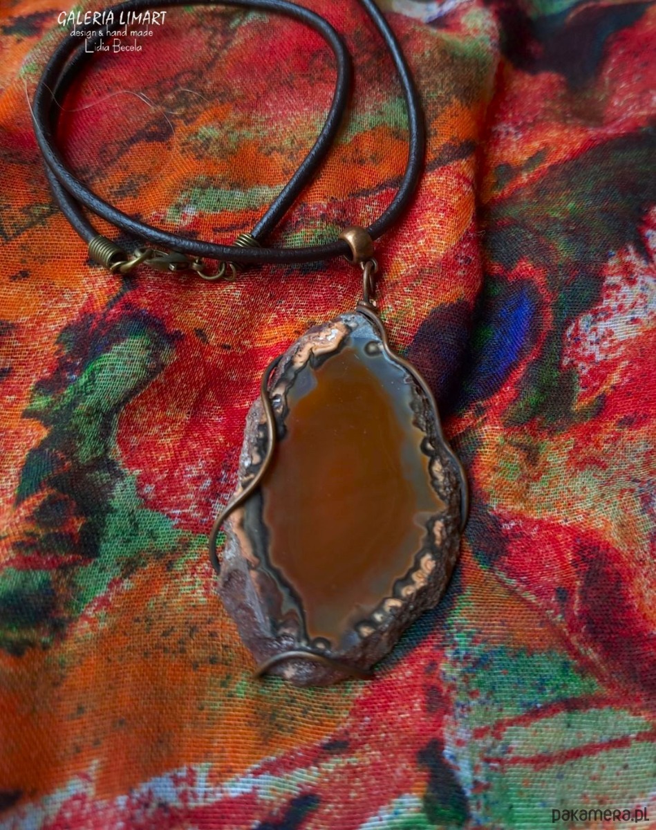Cudny, surowy niezwykle ubarwiony duży (ok. 7,5x4,5 cm) agat brazylijski w rudo-beżowo-brązowej tonacji. Obrzeże wisiora zostały pozostawione w jego naturalnej formie jedynie delikatnie oprawione w taki sposób, żeby zachować maksymalną oryginalność tego pięknego minerału. Autorska i ekologiczna oprawa w technologii Tiffany. Zawieszony na eleganckim okrągłym jubilerskim rzemieniu (GRATIS!) długości ok. 50 cm.