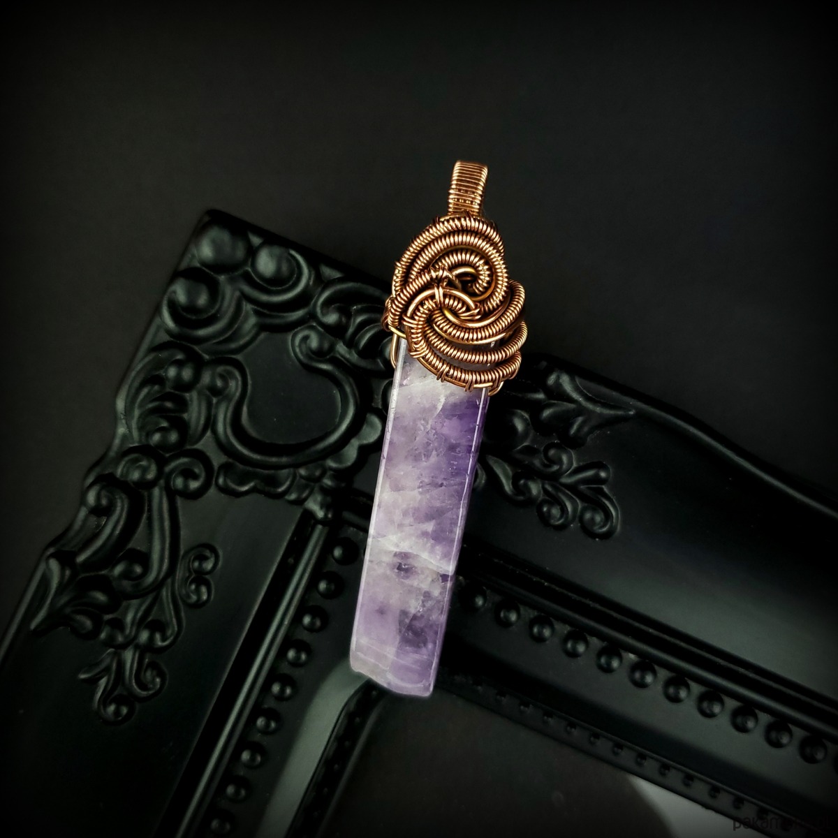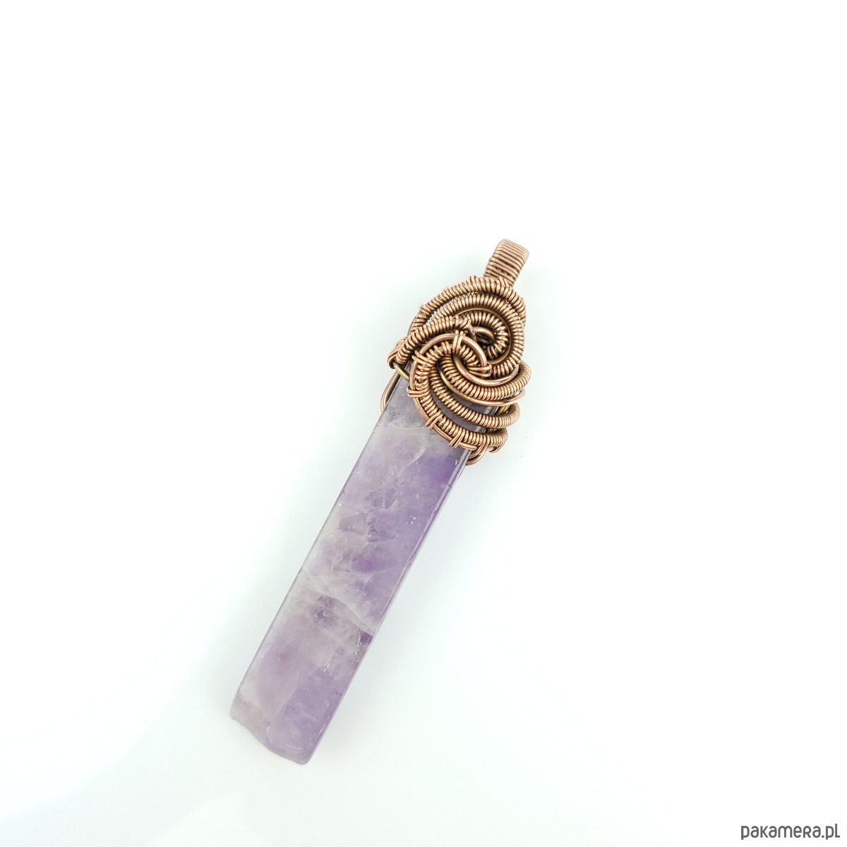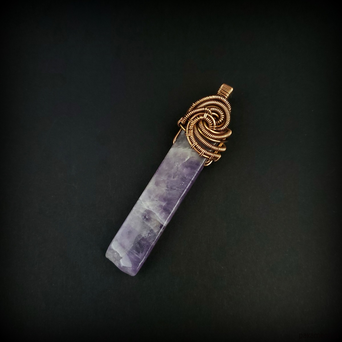 Wisiorek powstał z długiego nieregularnego ametystu. Całość misternie opleciono miedzią. Biżuteria oksydowana.