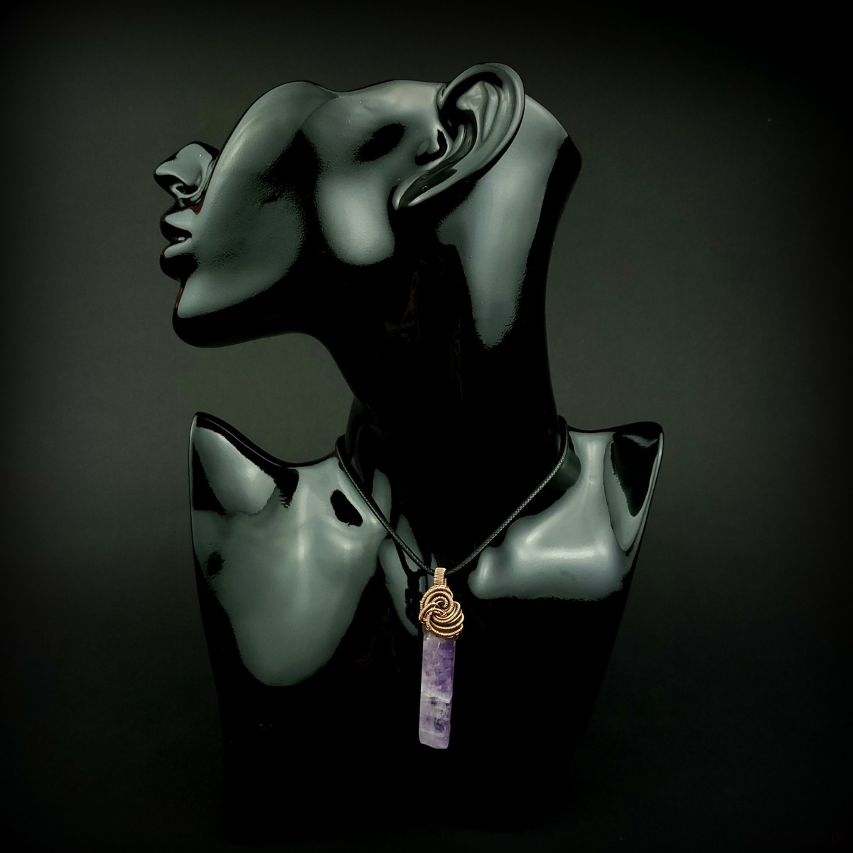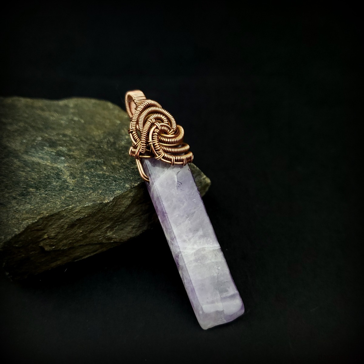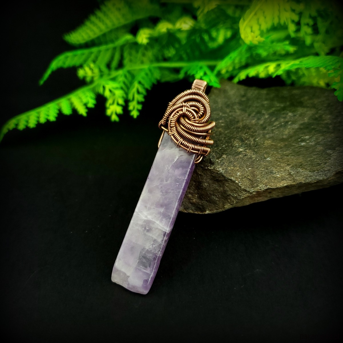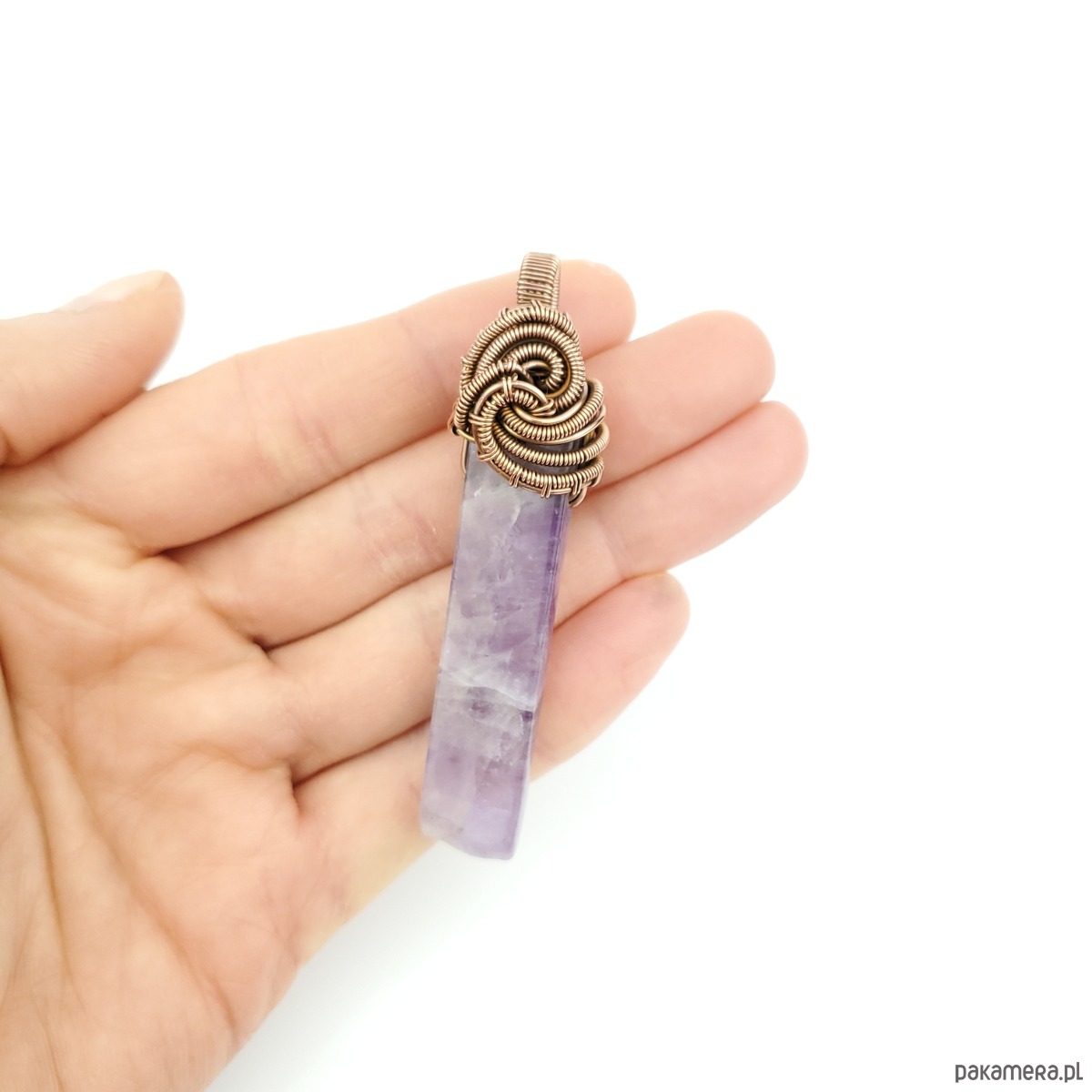 Wisiorek powstał z długiego nieregularnego ametystu. Całość misternie opleciono miedzią. Biżuteria oksydowana.