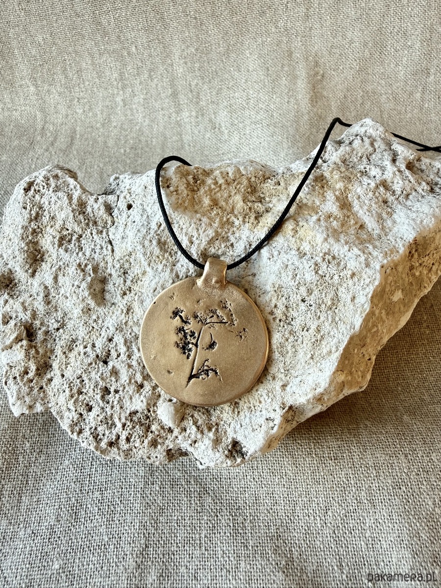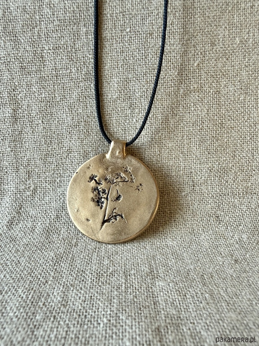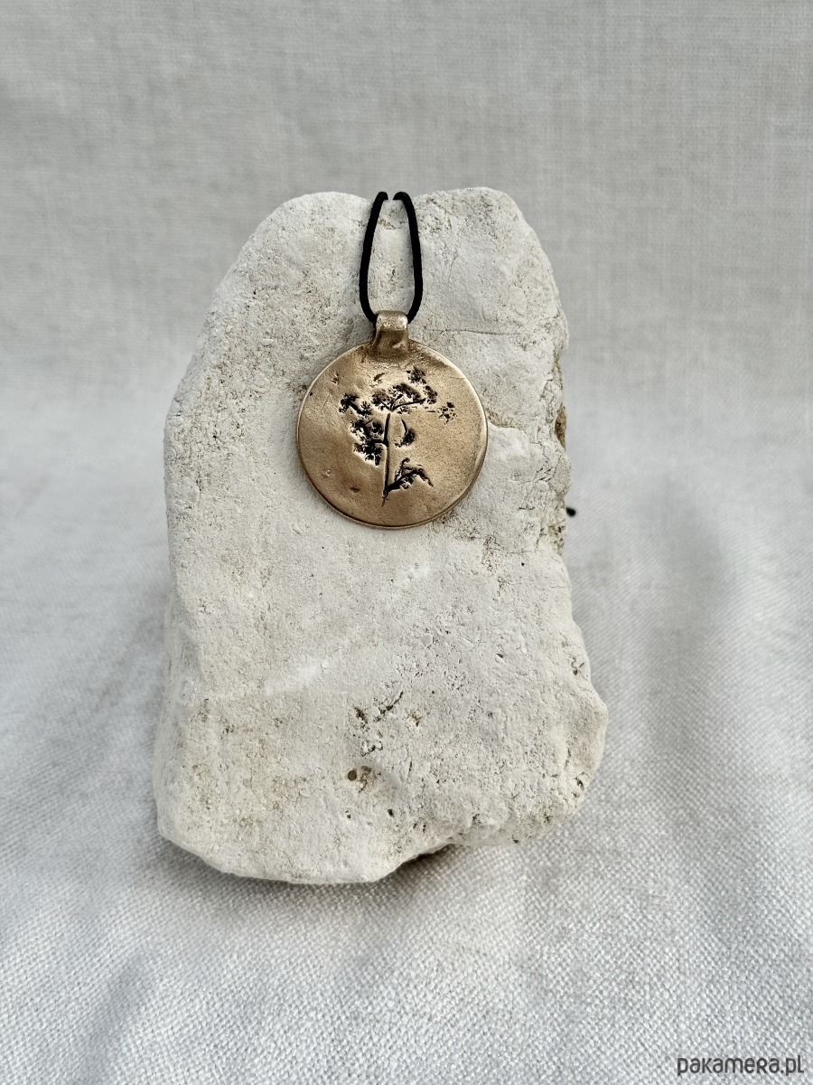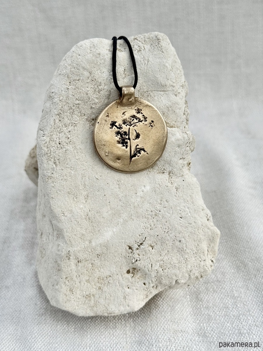 Ręcznie wykonany wisior z brązu, w którym utrwalony jest odcisk prawdziwych roślin.