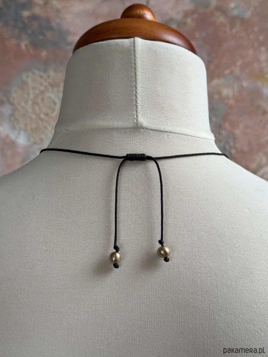 Wisior zawieszony jest na czarnym, regulowanym sznurku, zakończonym kulkami z brązu.