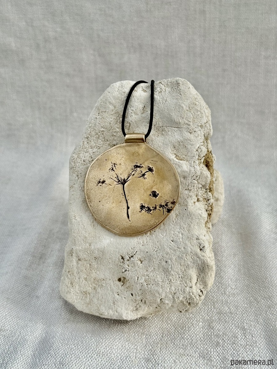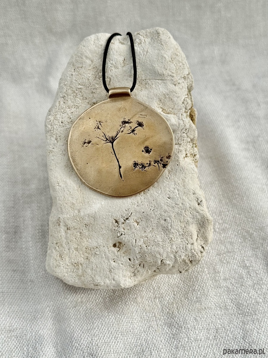 Ręcznie wykonany wisior z brązu, w którym utrwalony jest odcisk prawdziwych roślin.