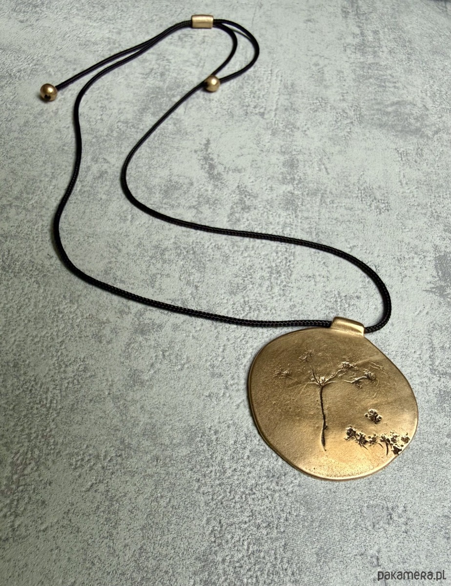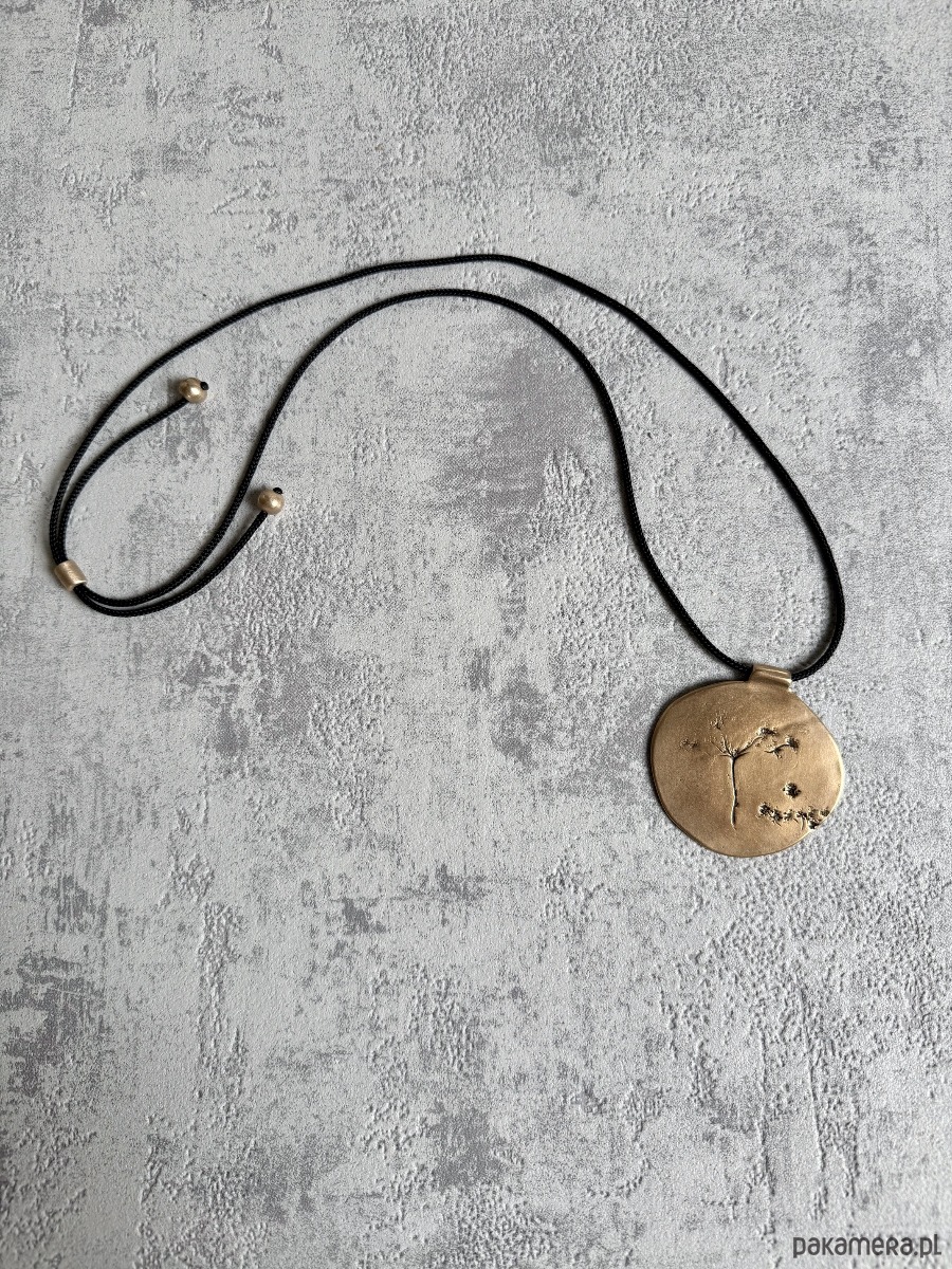 Wisior zawieszony jest na czarnym, regulowanym sznurku, zakończonym kulkami z brązu.