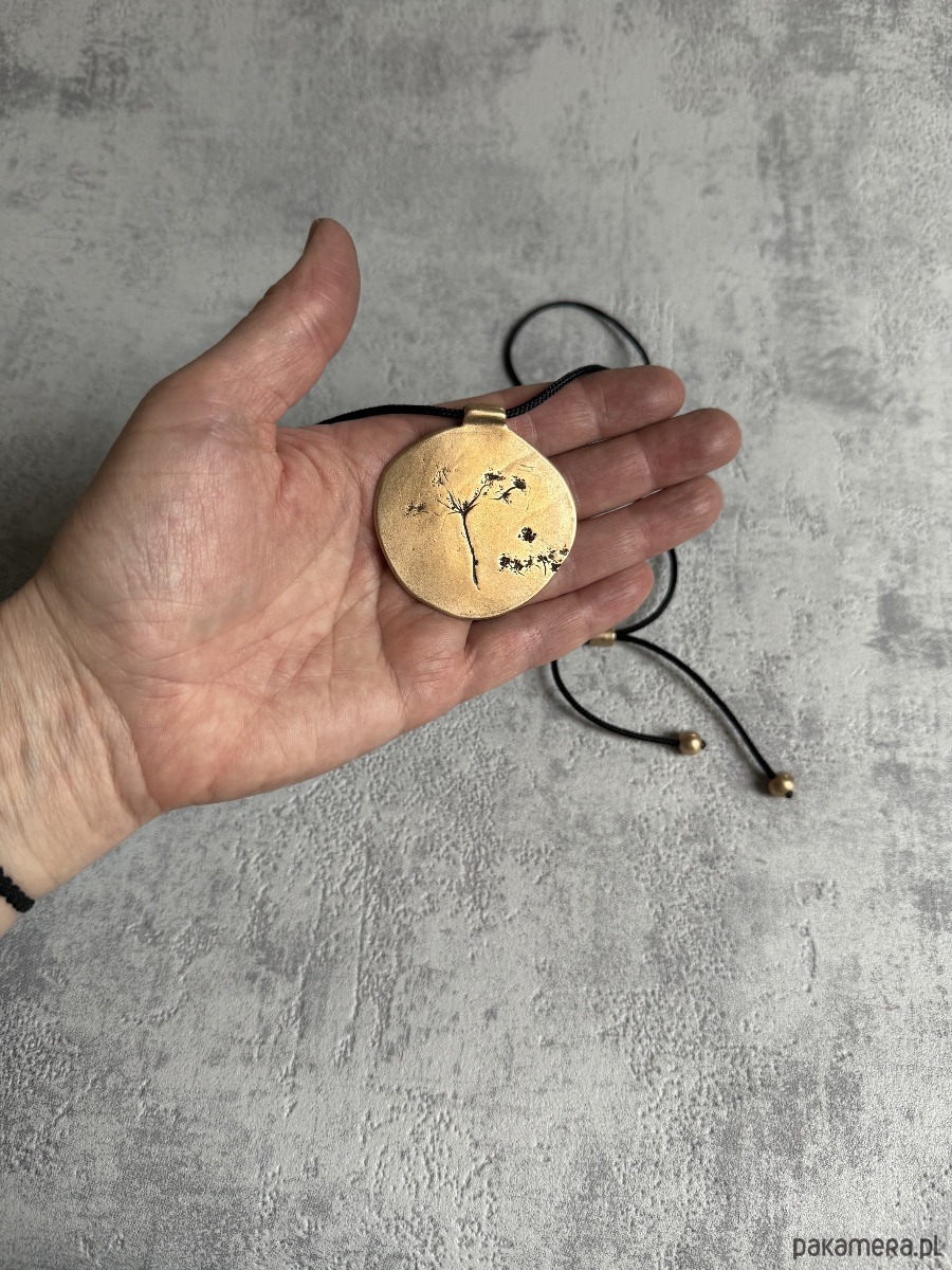 Ręcznie wykonany organiczny, minimalistyczny wisior z brązu, w którym utrwalony jest odcisk prawdziwych roślin.