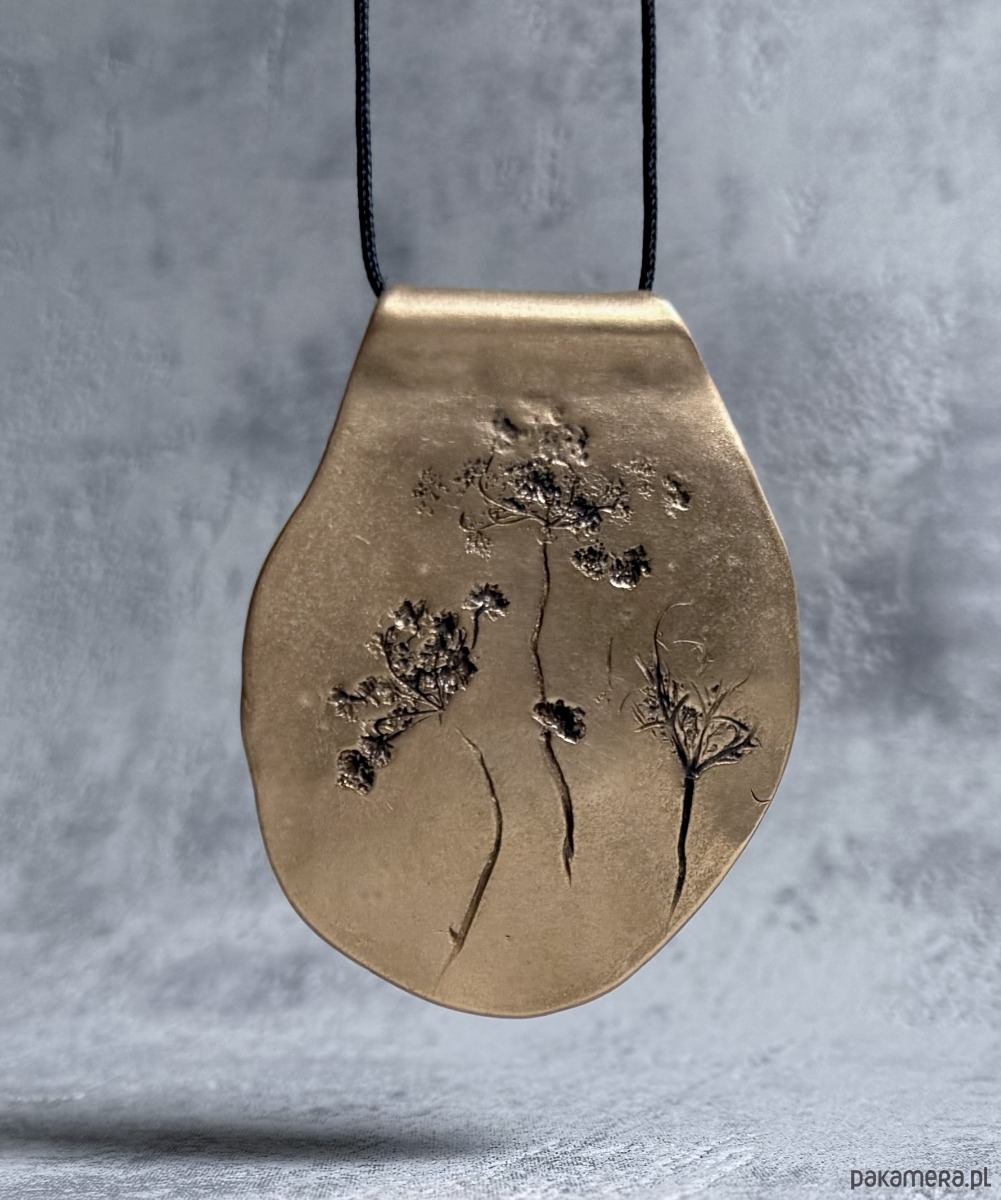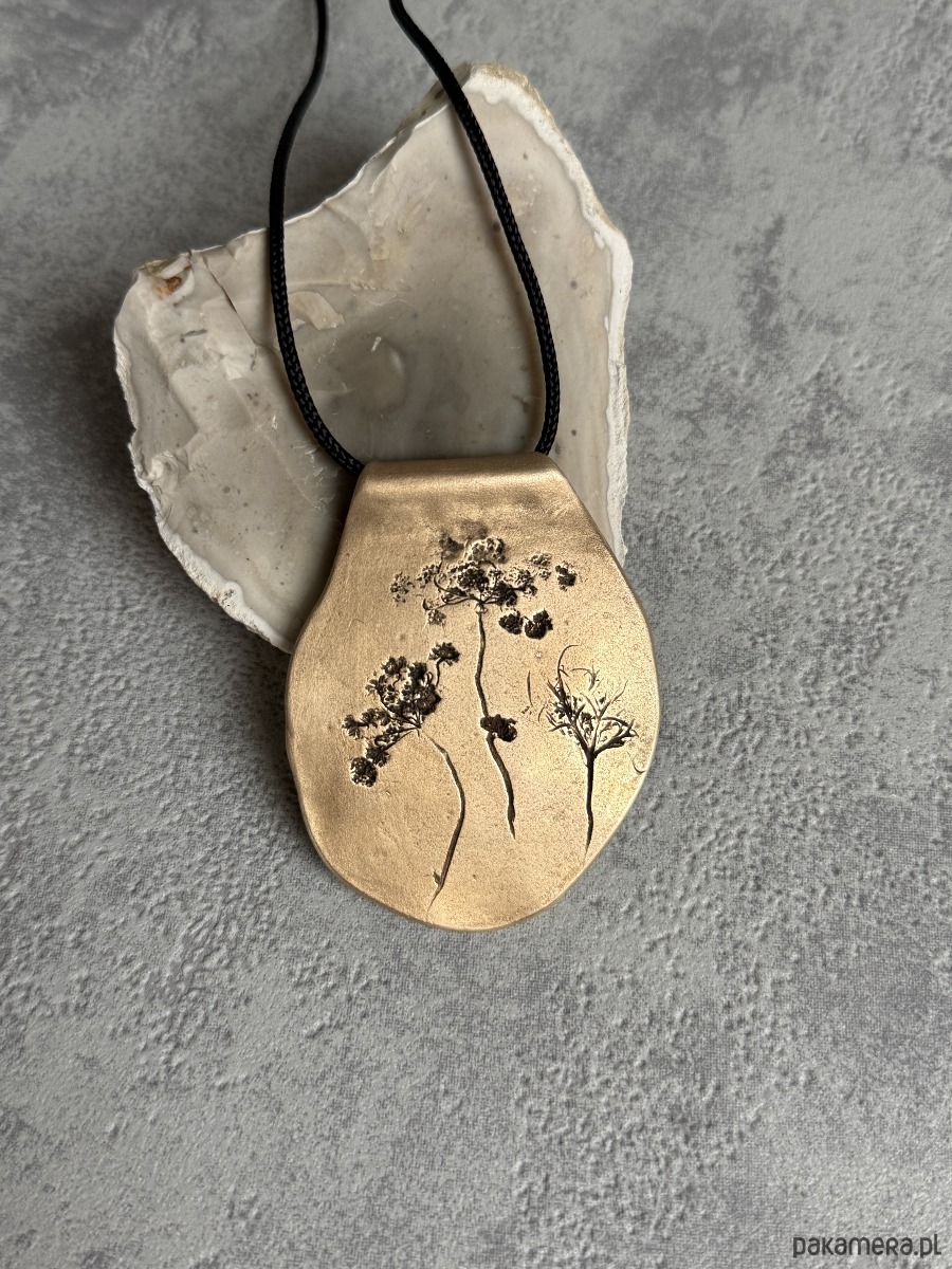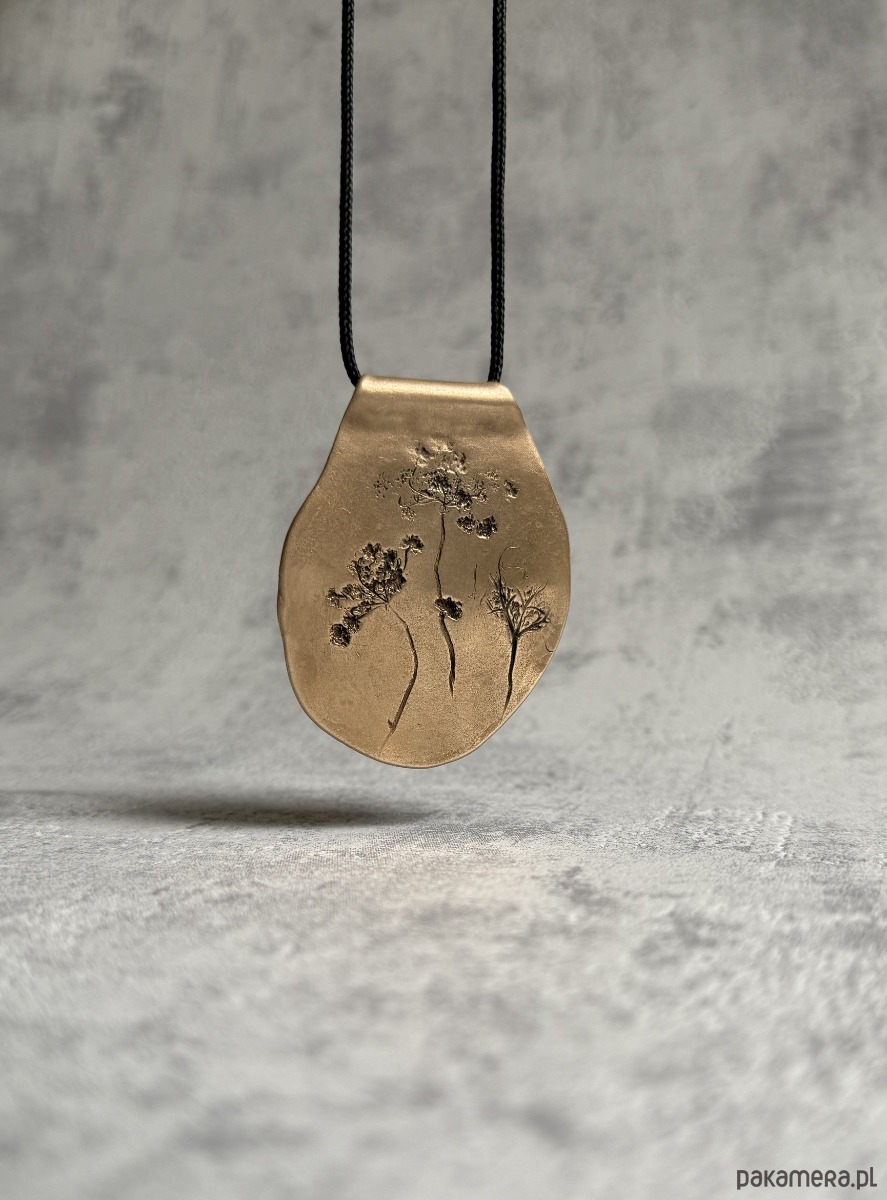 Ręcznie wykonany, organiczny wisior z brązu, w którym utrwalony został odcisk prawdziwych roślin, tworzących niepowtarzalną kompozycję. Kształt wisiora jest również jedyny w swoim rodzaju.