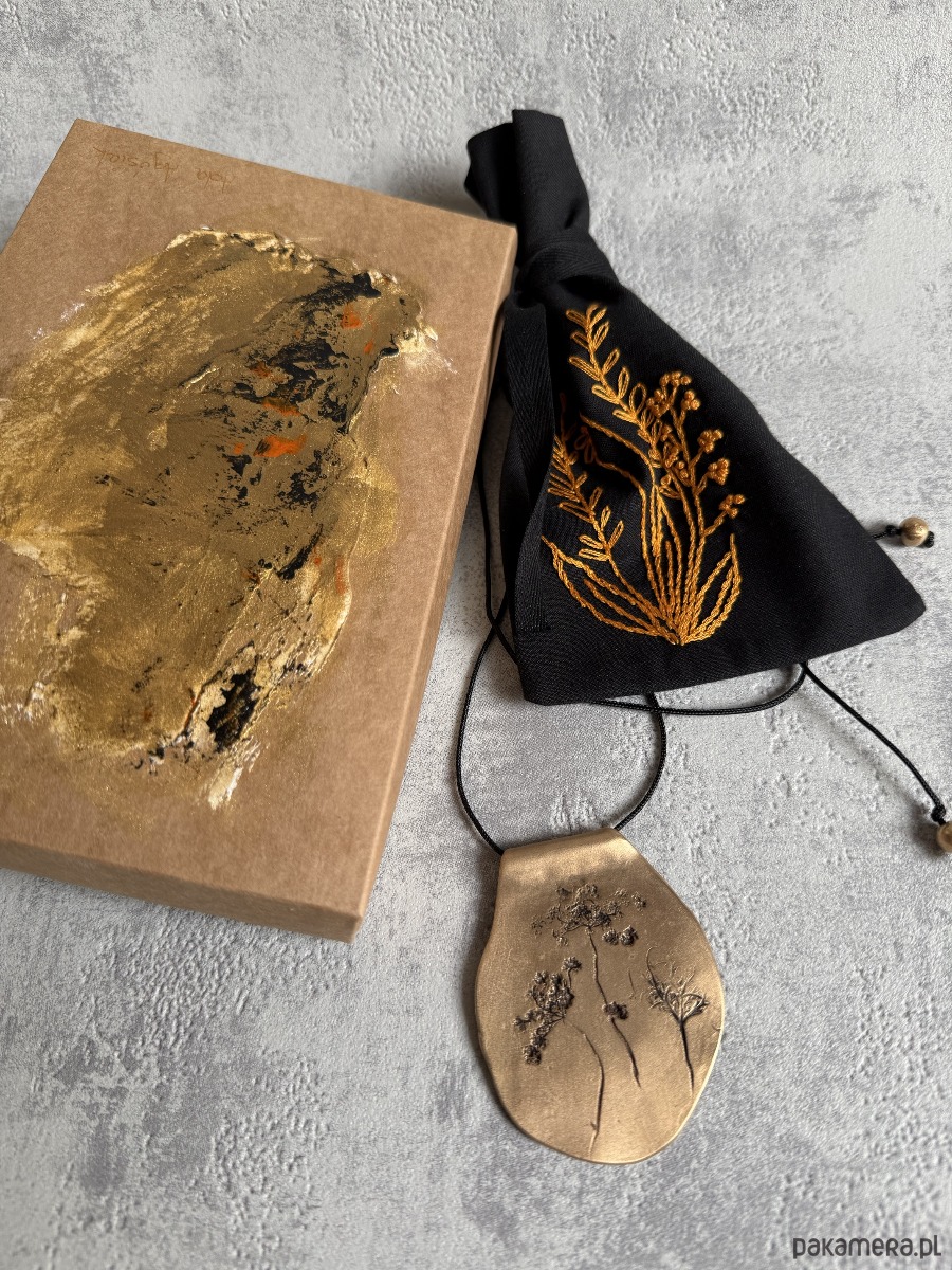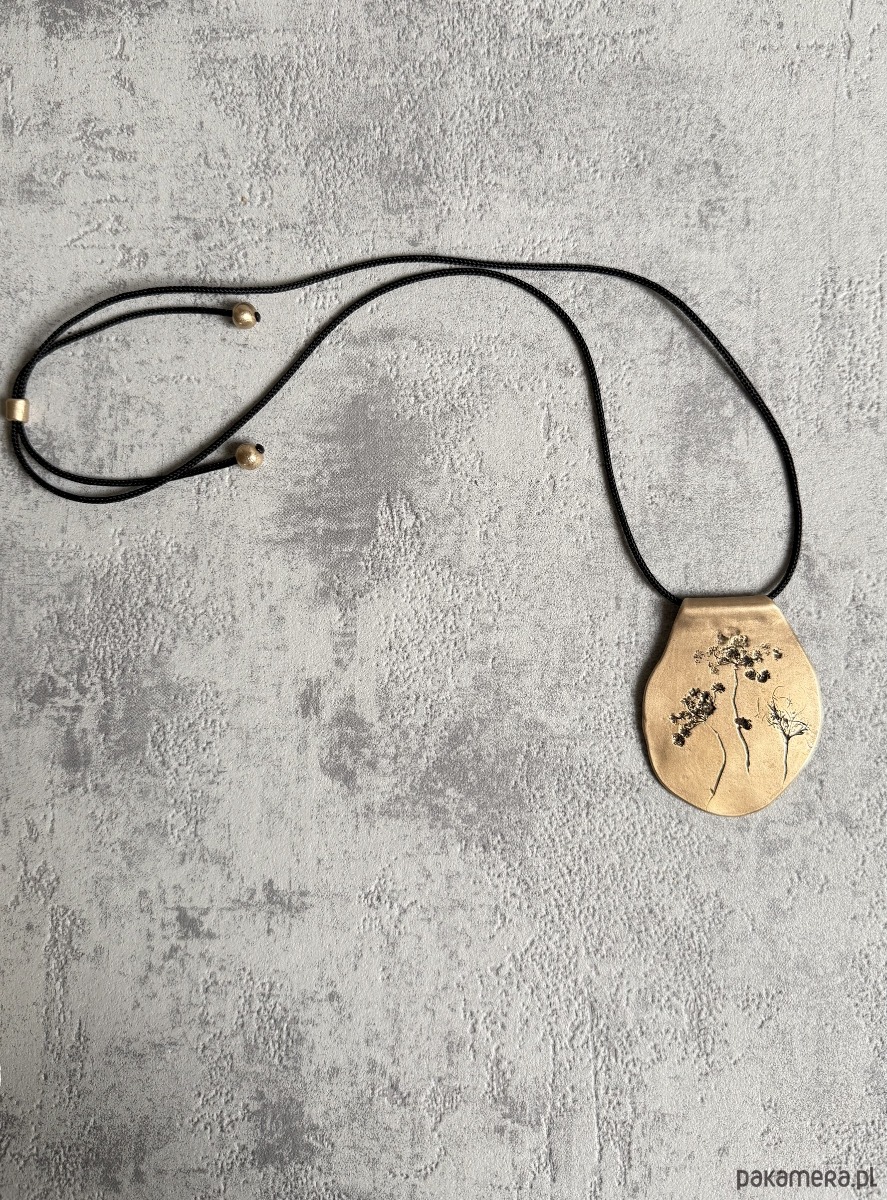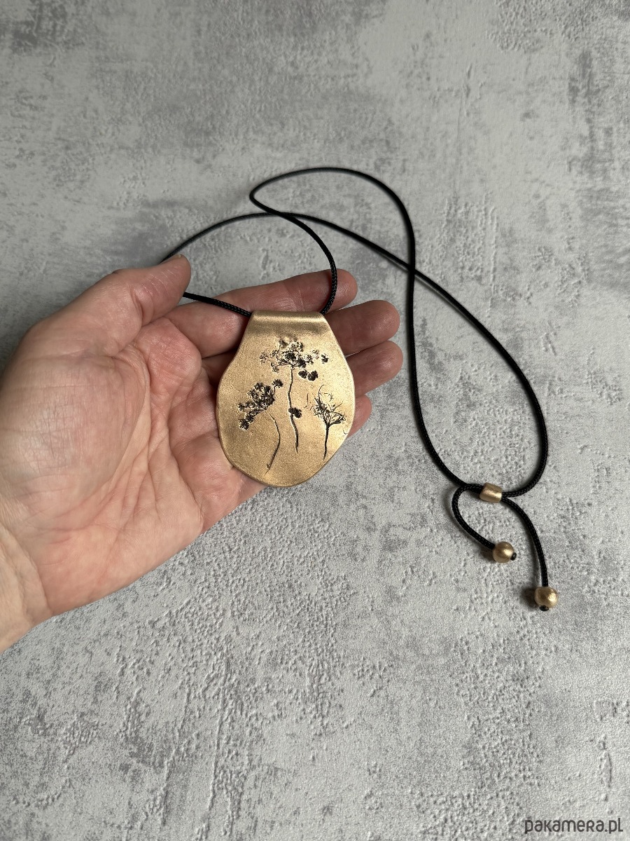 Ręcznie wykonany, organiczny wisior z brązu, w którym utrwalony został odcisk prawdziwych roślin, tworzących niepowtarzalną kompozycję. Kształt wisiora jest również jedyny w swoim rodzaju.