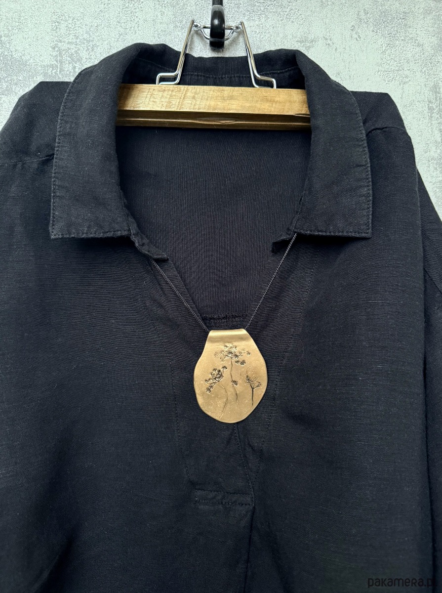 W zależności od oświetlenia wisior może wyglądać jaśniej lub ciemniej - od ciepłych, złotych tonów po spokojny beż brązu. Z czasem metal może delikatnie zmieniać odcień, co jest jego naturalną cechą. Zdjęcia oddają charakter biżuterii, jednak kolor w rzeczywistości może się nieznacznie różnić.