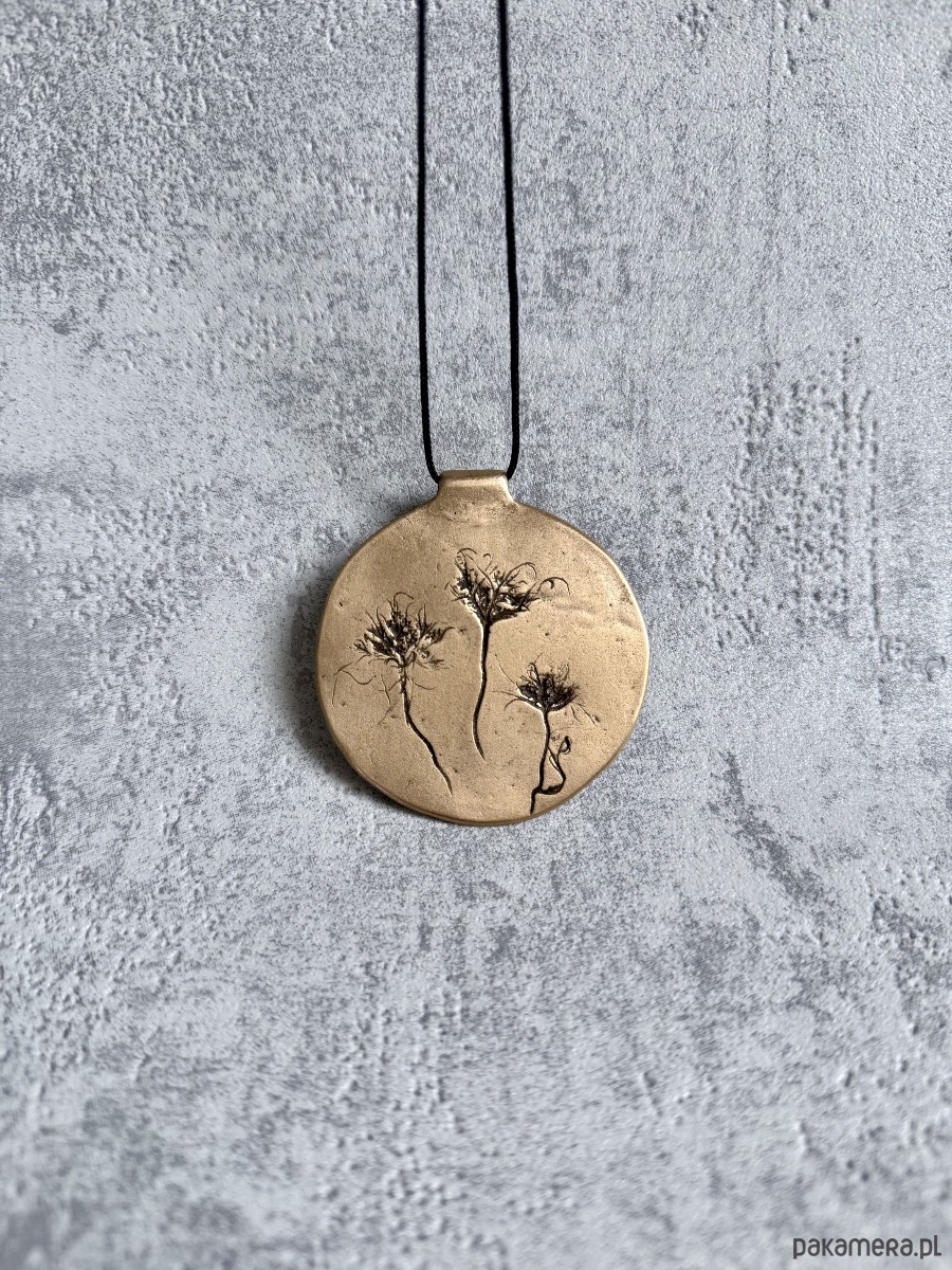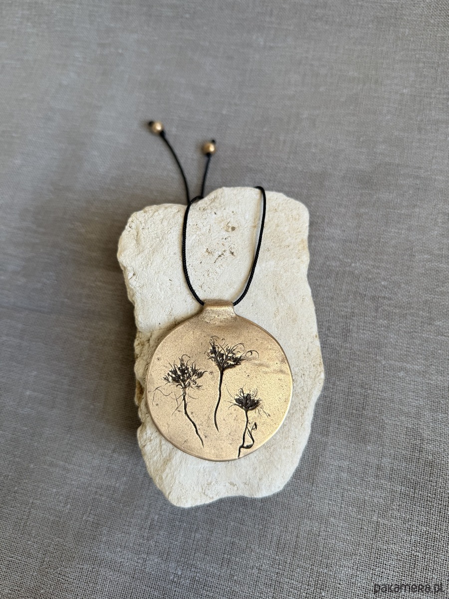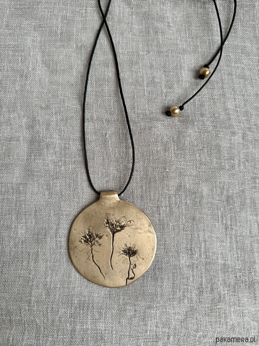 Ręcznie wykonany wisior z brązu, w którym utrwalony został odcisk prawdziwych roślin, tworzących niepowtarzalną kompozycję.