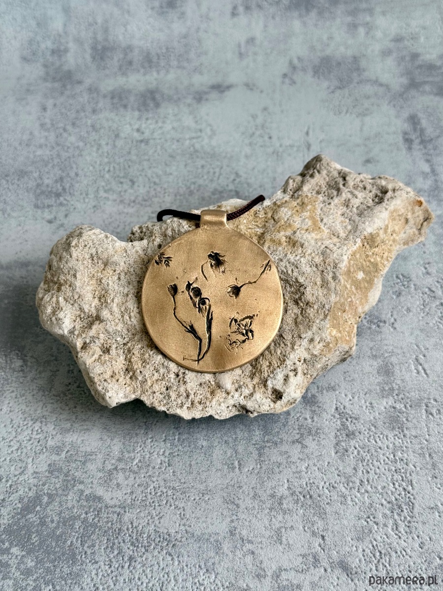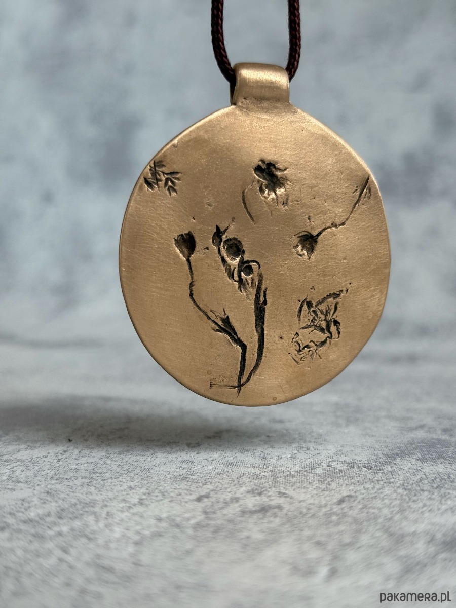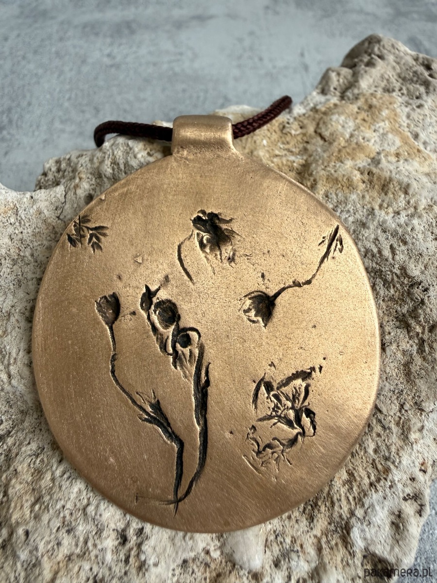 Ręcznie wykonany wisior z brązu, w którym utrwalony został odcisk prawdziwych roślin, tworzących niepowtarzalną kompozycję.