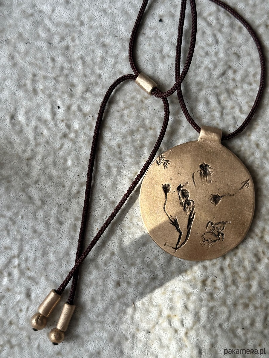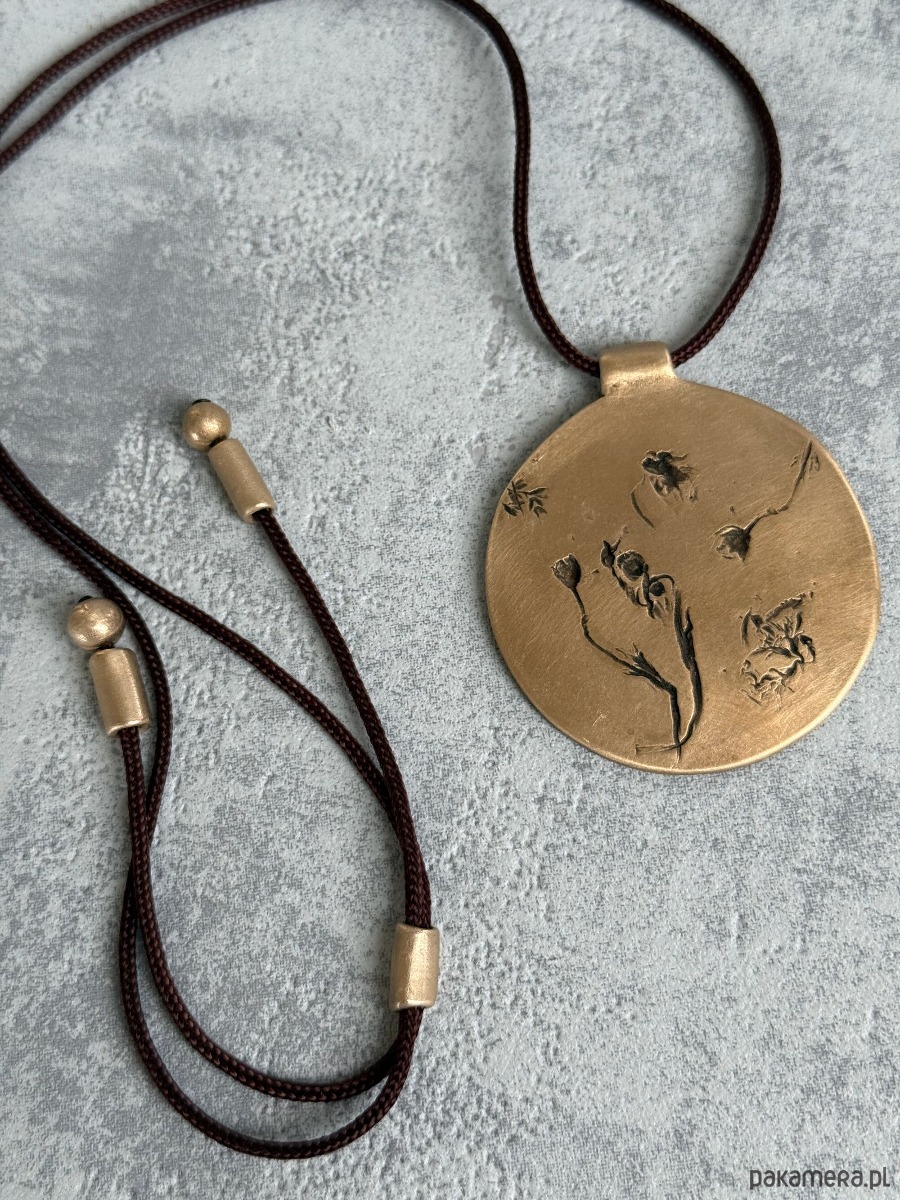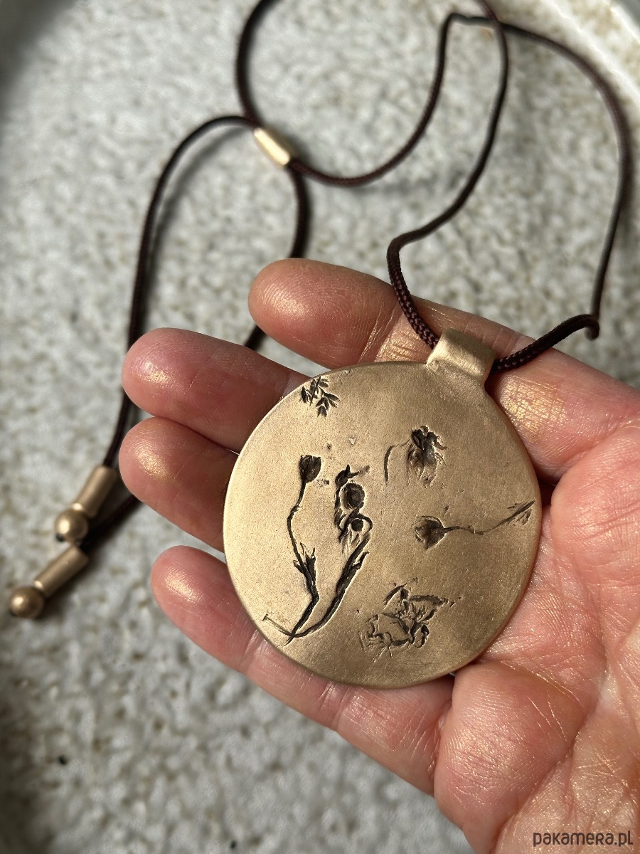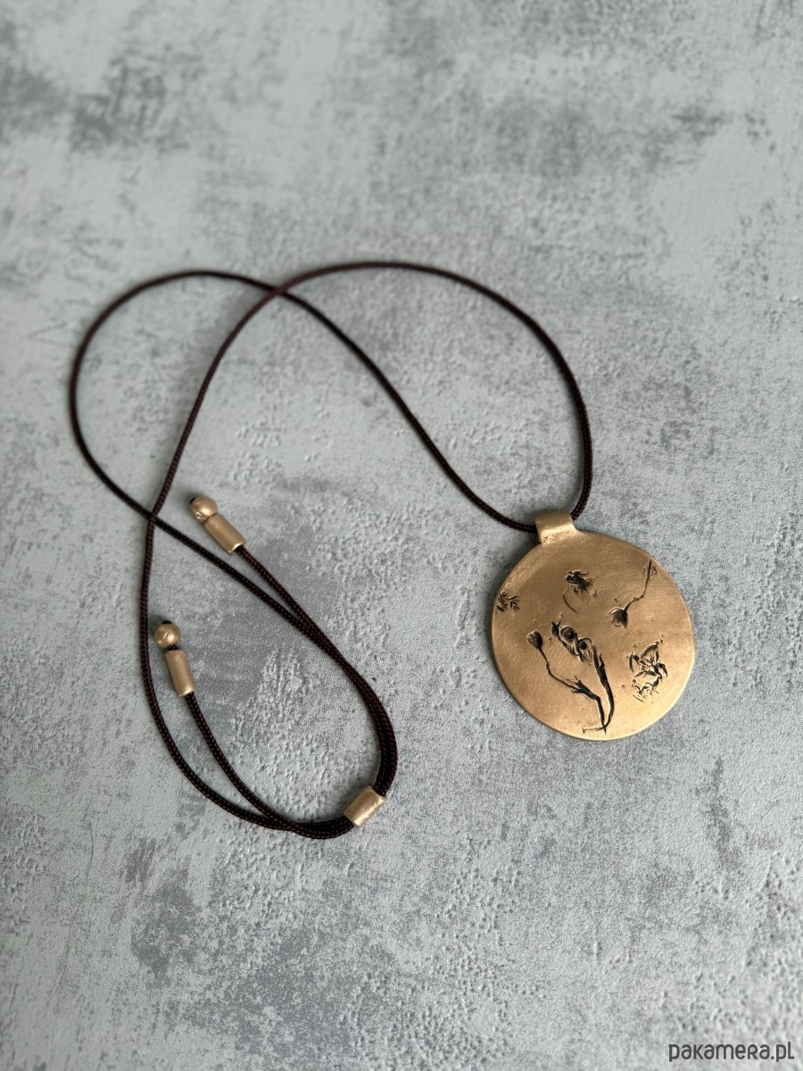 Ręcznie wykonany wisior z brązu, w którym utrwalony został odcisk prawdziwych roślin, tworzących niepowtarzalną kompozycję.