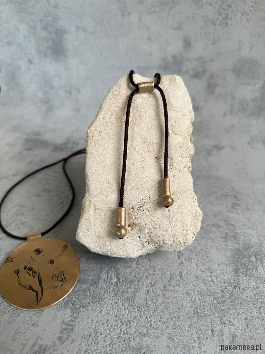 Wisior zawieszony jest na cienkim, brązowym, regulowanym sznurku, zakończonym elementami z brązu.