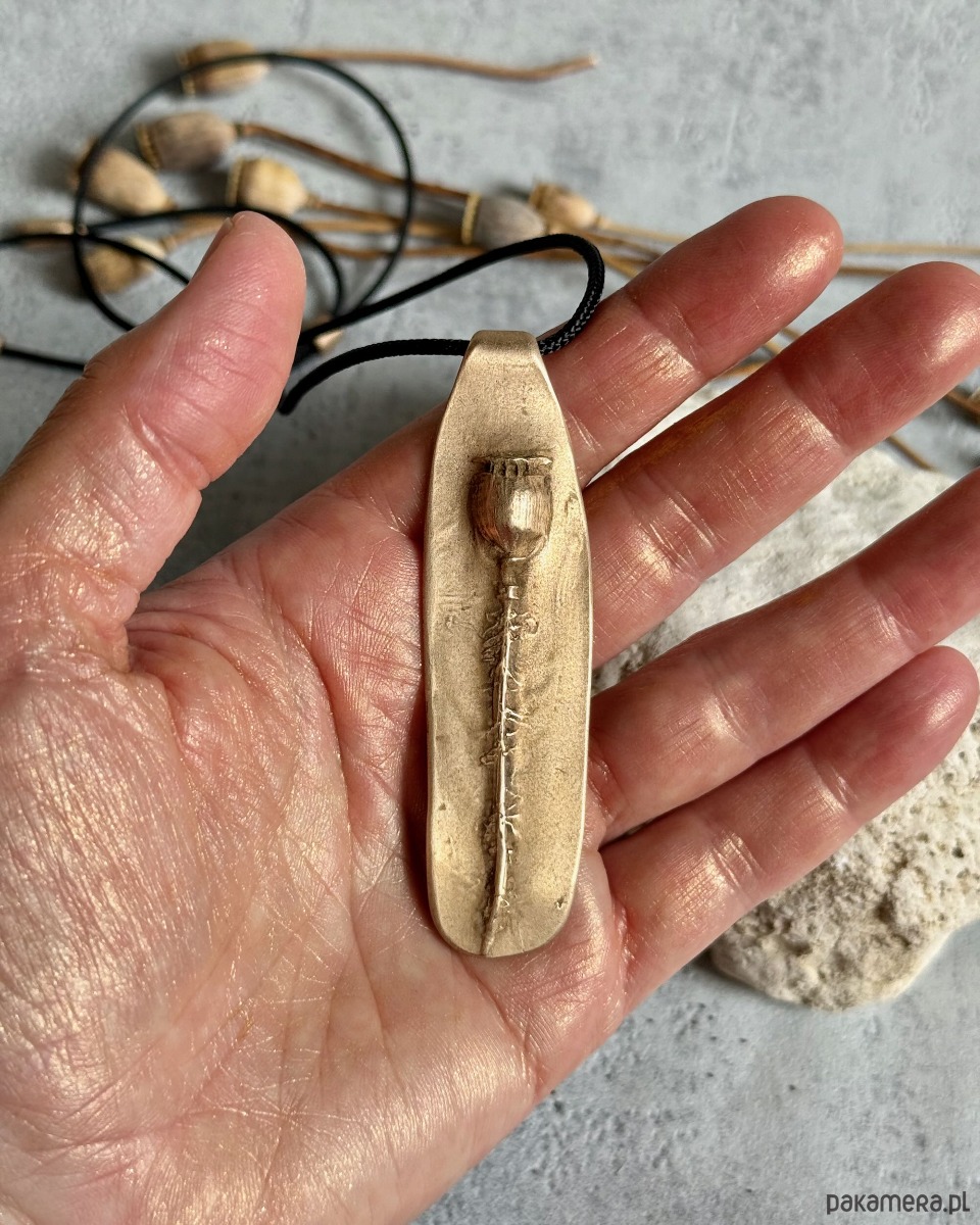 Wisior wykonany ręcznie z glinki brązu, z motywem makówki powstałym na bazie autorskiej formy stworzonej z odcisku prawdziwej rośliny.