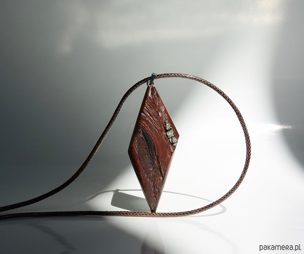 Naszyjnik wykonany został z drewna bardzo starego dębu uderzonego piorunem oraz pokruszonego pirytu. Zabezpieczony naturalnymi woskami i wypolerowany. Ciemny kolor drewna jest jego naturalną barwą, która powstała pod wpływem wysokiej temperatury (uderzenie pioruna) i nie jest bejcowane, ani malowane. Wisiorek jest zawieszony na sznurku jubilerskim w kolorze brązowy, zawiązany w ten sposób, aby po założeniu można było regulować jego długość przez przesuwanie węzełków i nosić na dowolnej długości.