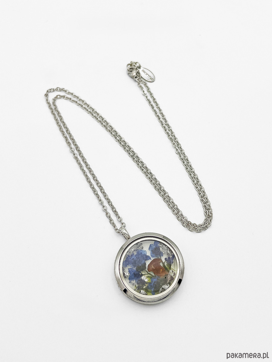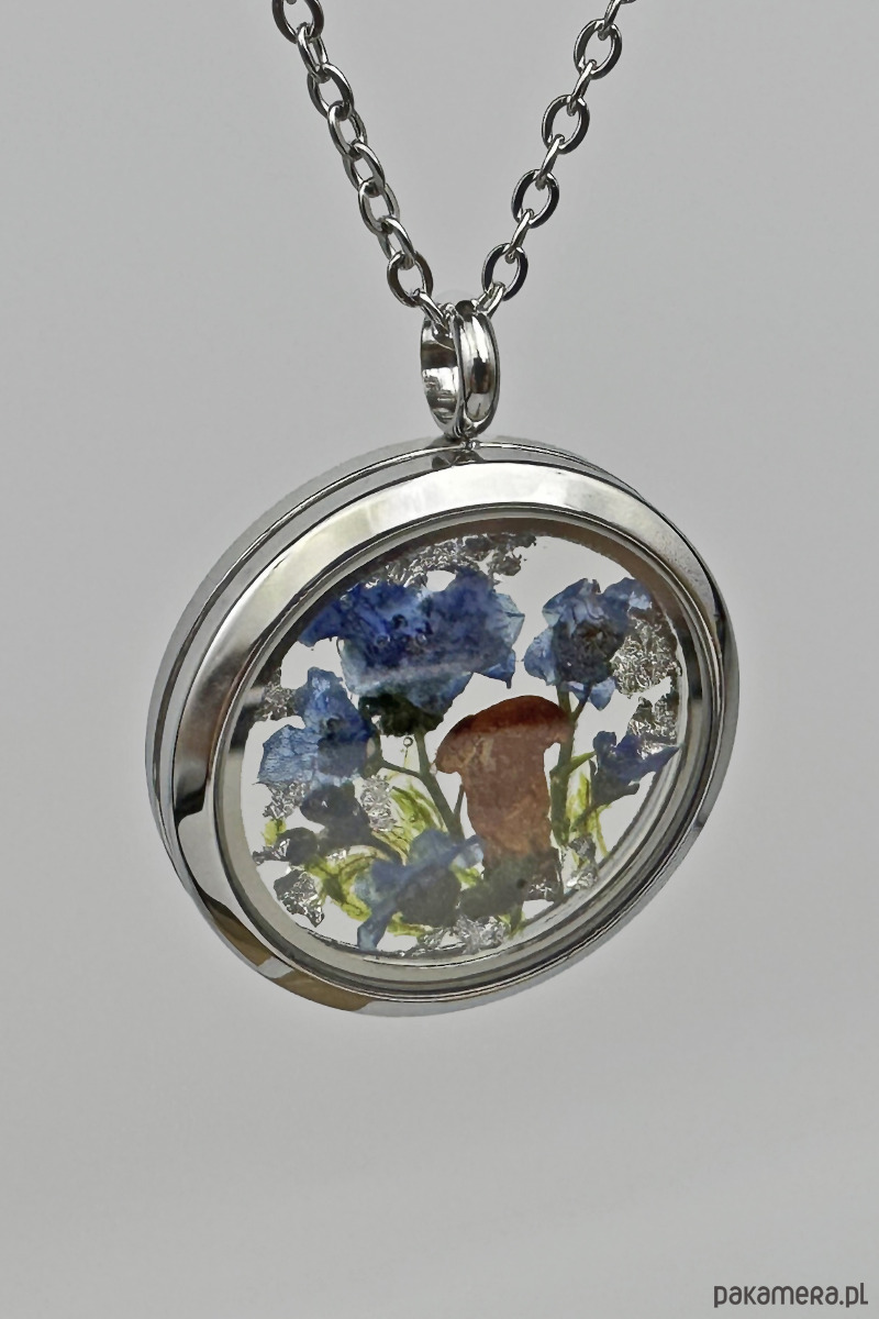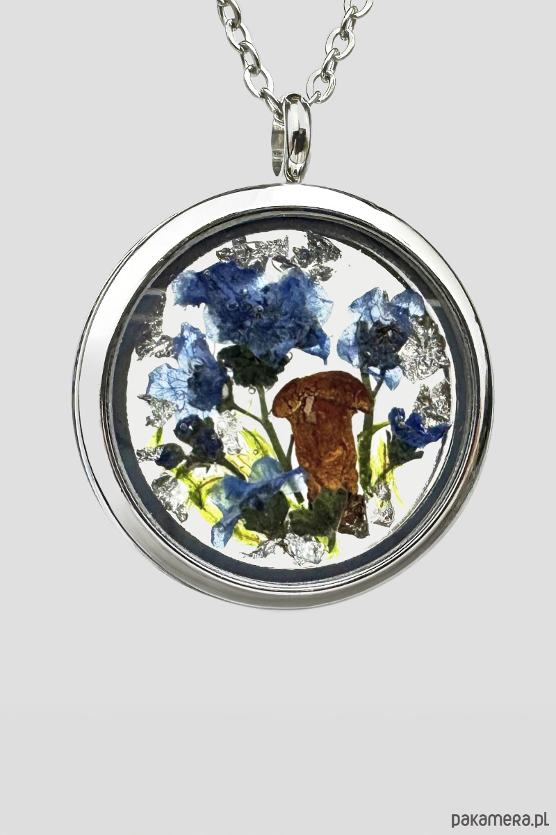 Niepowtarzalny wisior z bajeczną, leśną kompozycją, wykonaną ręcznie z prawdziwych niezapominajek i grzybków. Wyjątkowy unikat, w którym za szklanym puzderkiem utrwalona została cząstka natury.