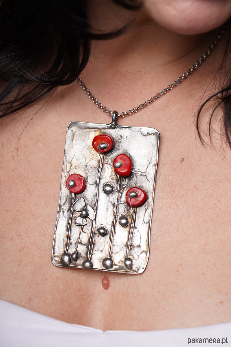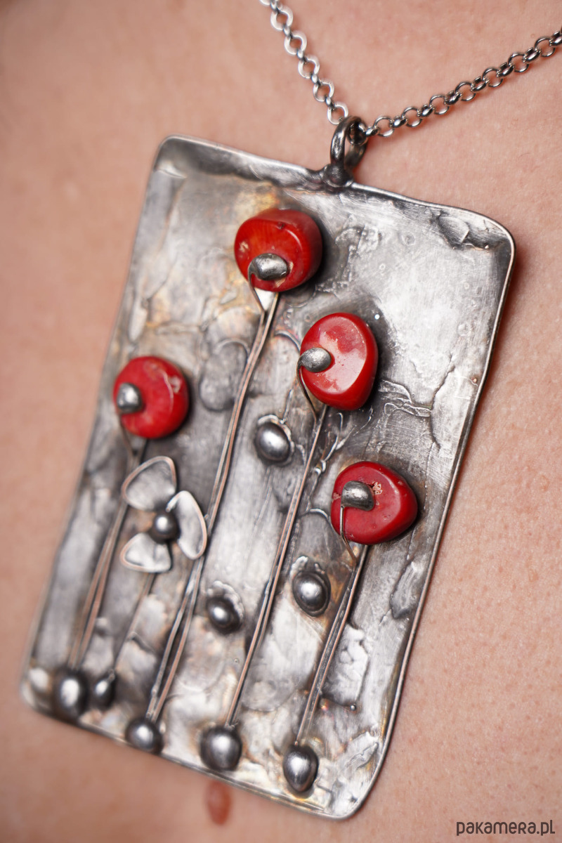 Lato za pasem,warto na dekoledzie zawiesic atrakcyjny wisior z miedzi oksydowanej z kwiatami z korala naturalnego .