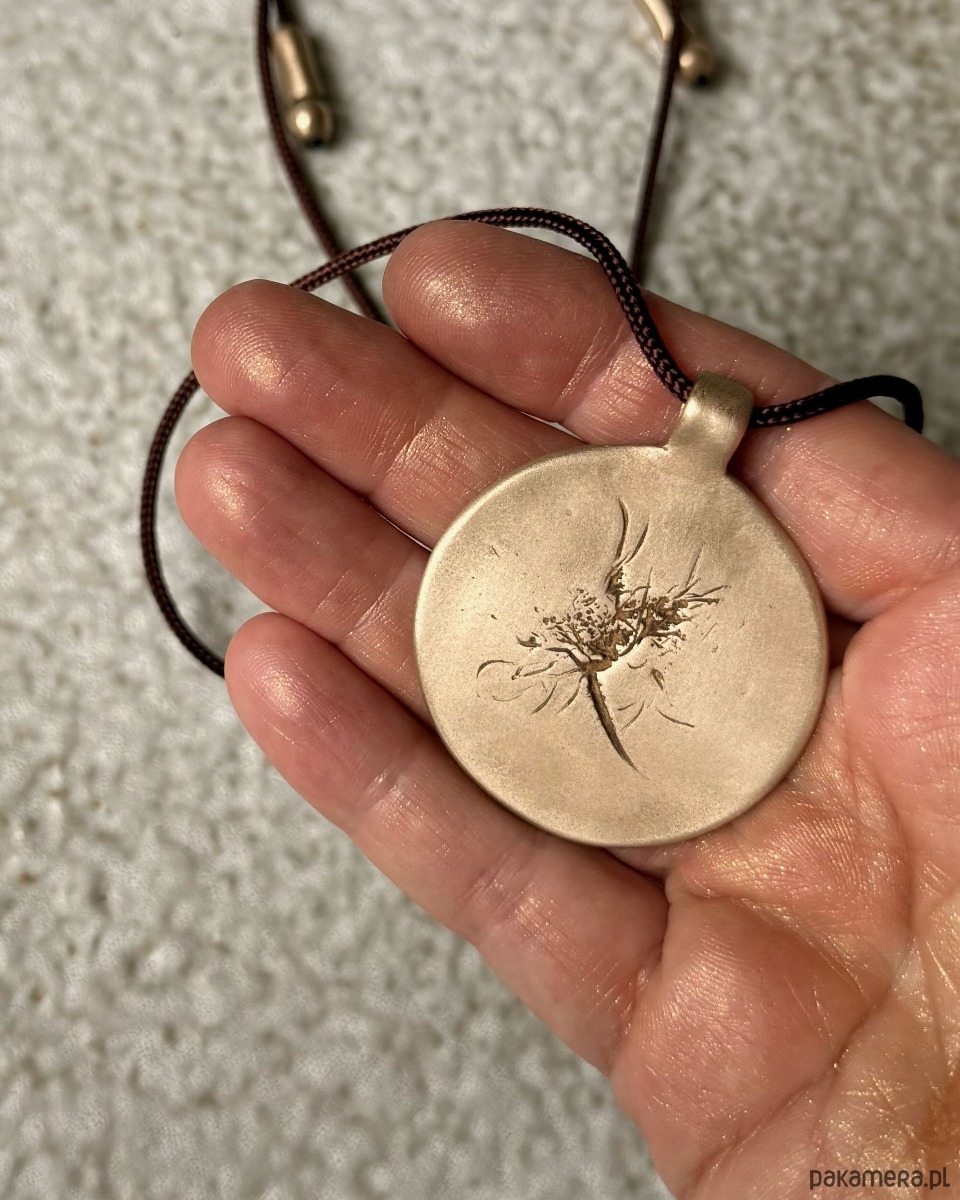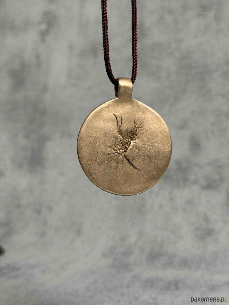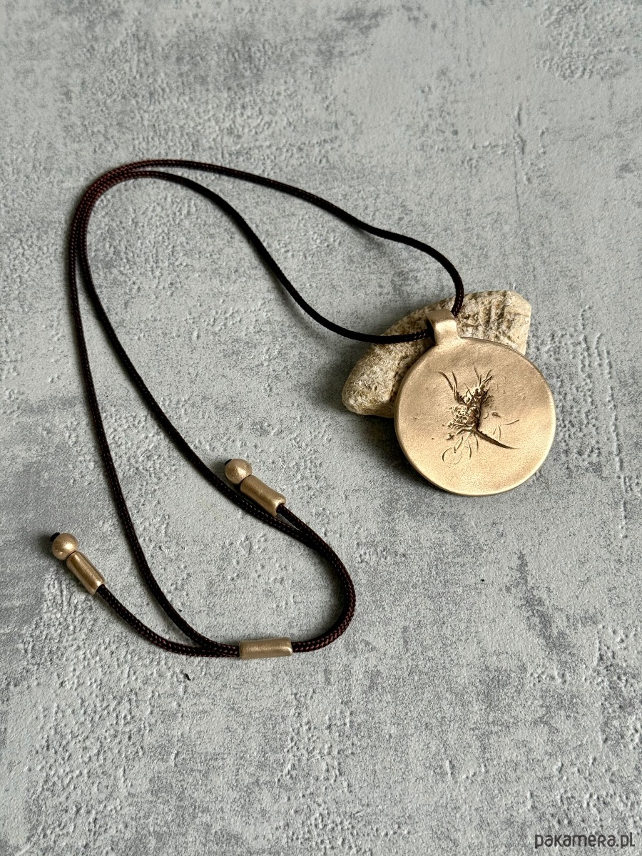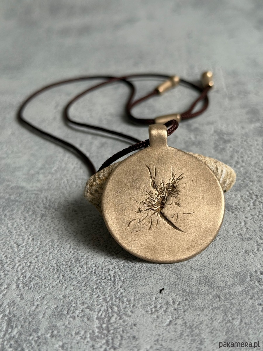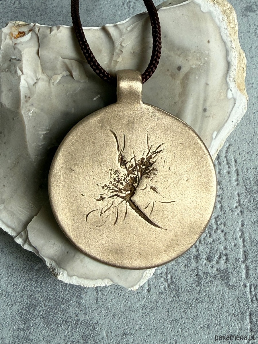 Ręcznie wykonany wisior z brązu, w którym utrwalony został odcisk prawdziwej rośliny.
