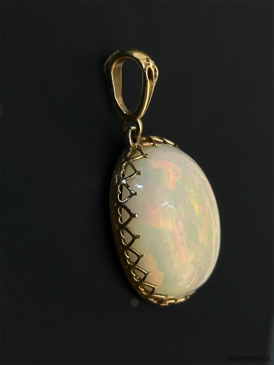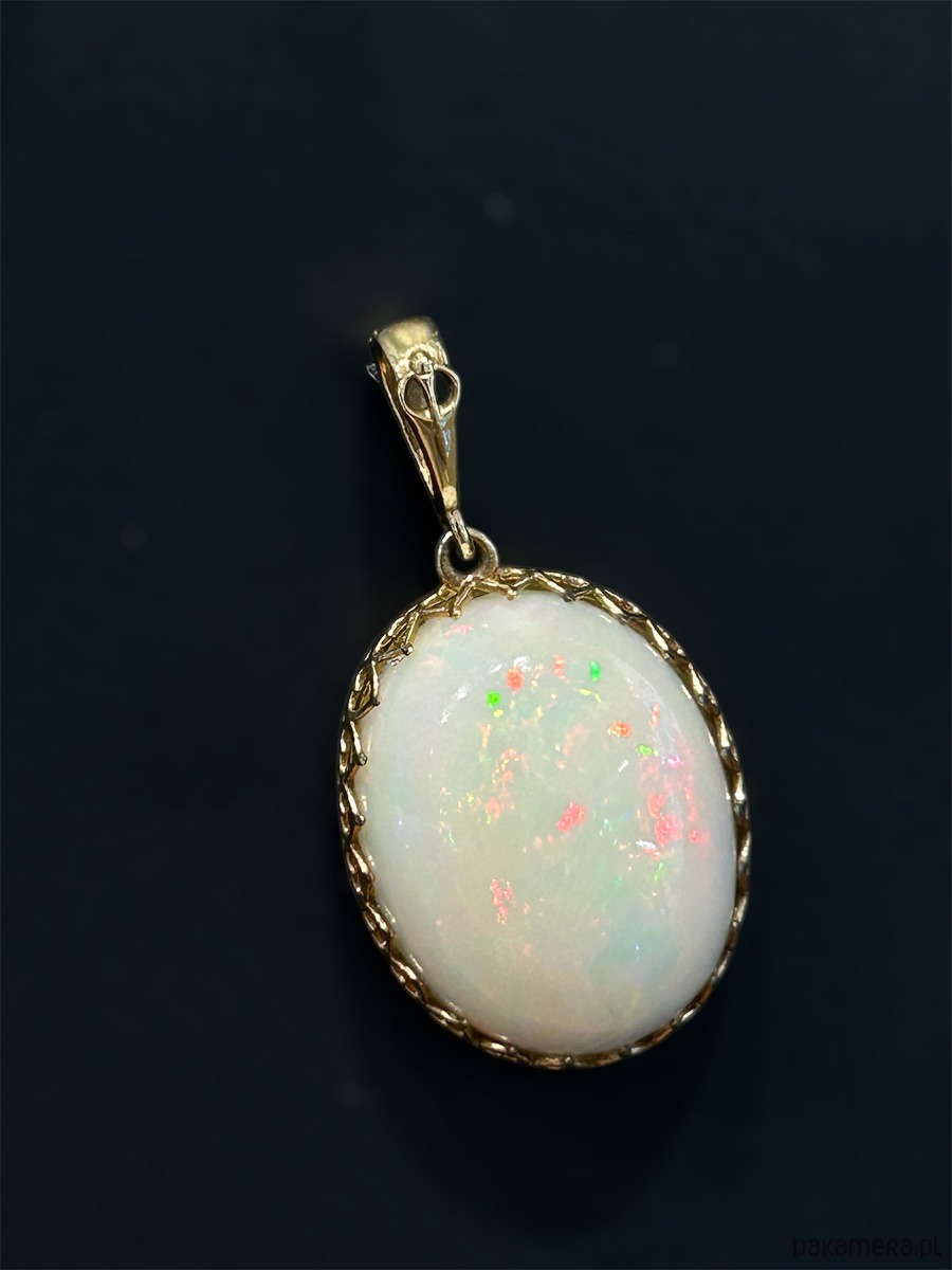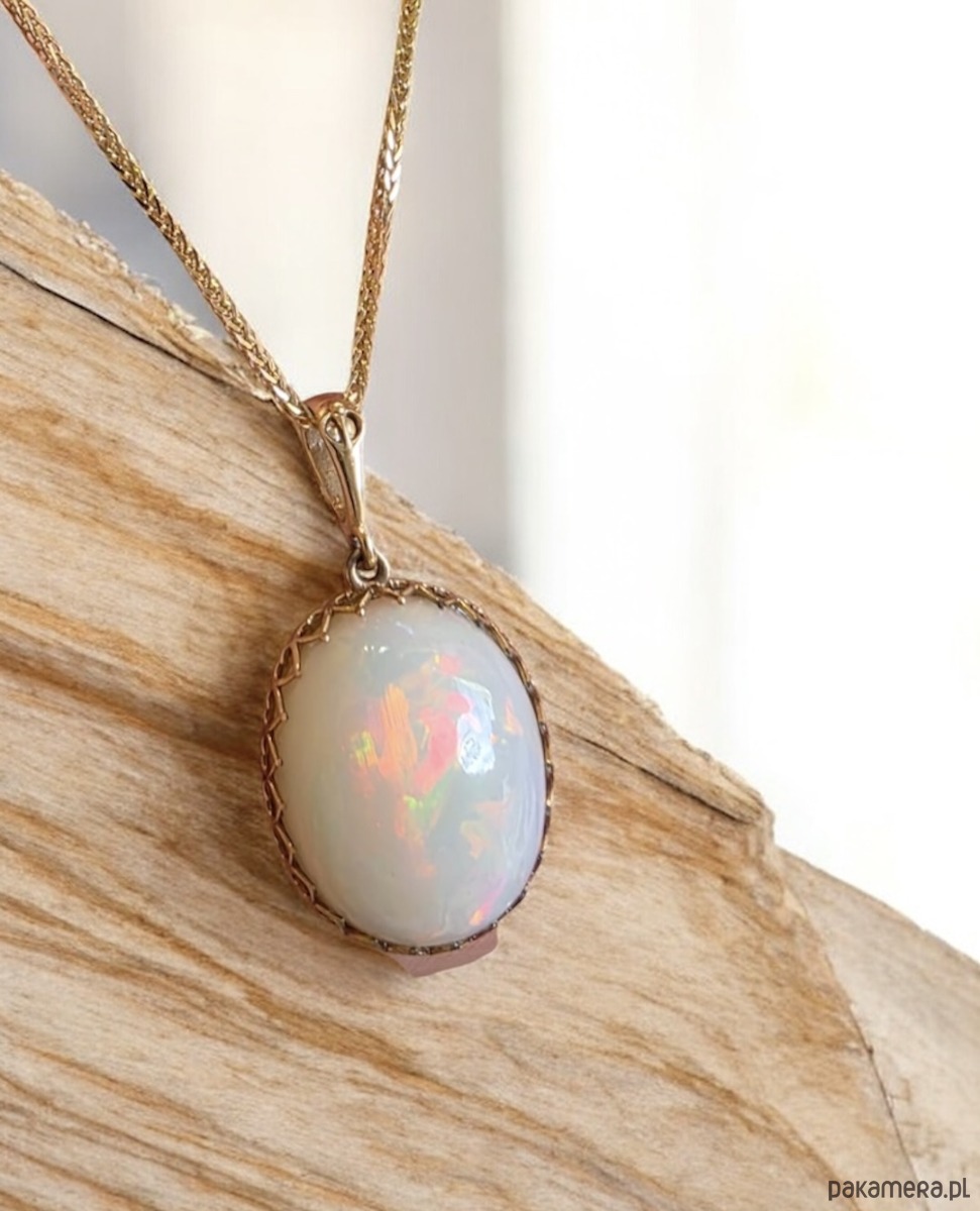 Zjawiskowy wisiorek z naturalnym opalem etiopskim, oprawiony w delikatne złoto, które podkreśla szlachetny charakter kamienia. Opal mieni się intensywną grą barw — od ognistych pomarańczy po zielone i różowe refleksy — tworząc niepowtarzalny efekt głębi i światła.