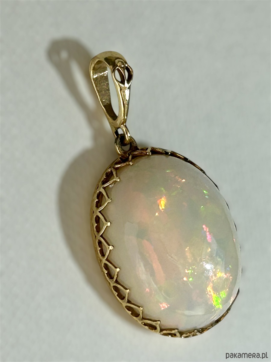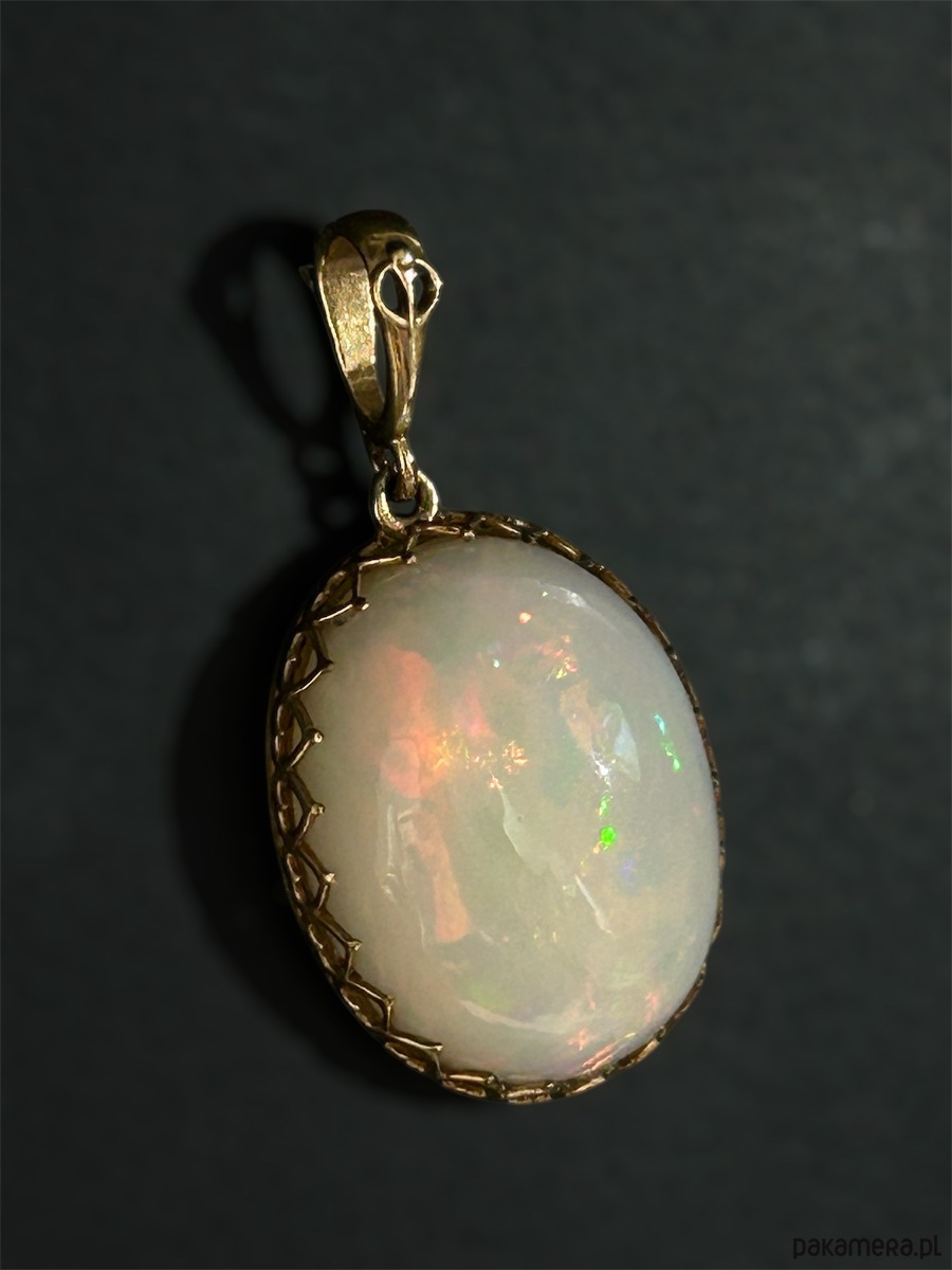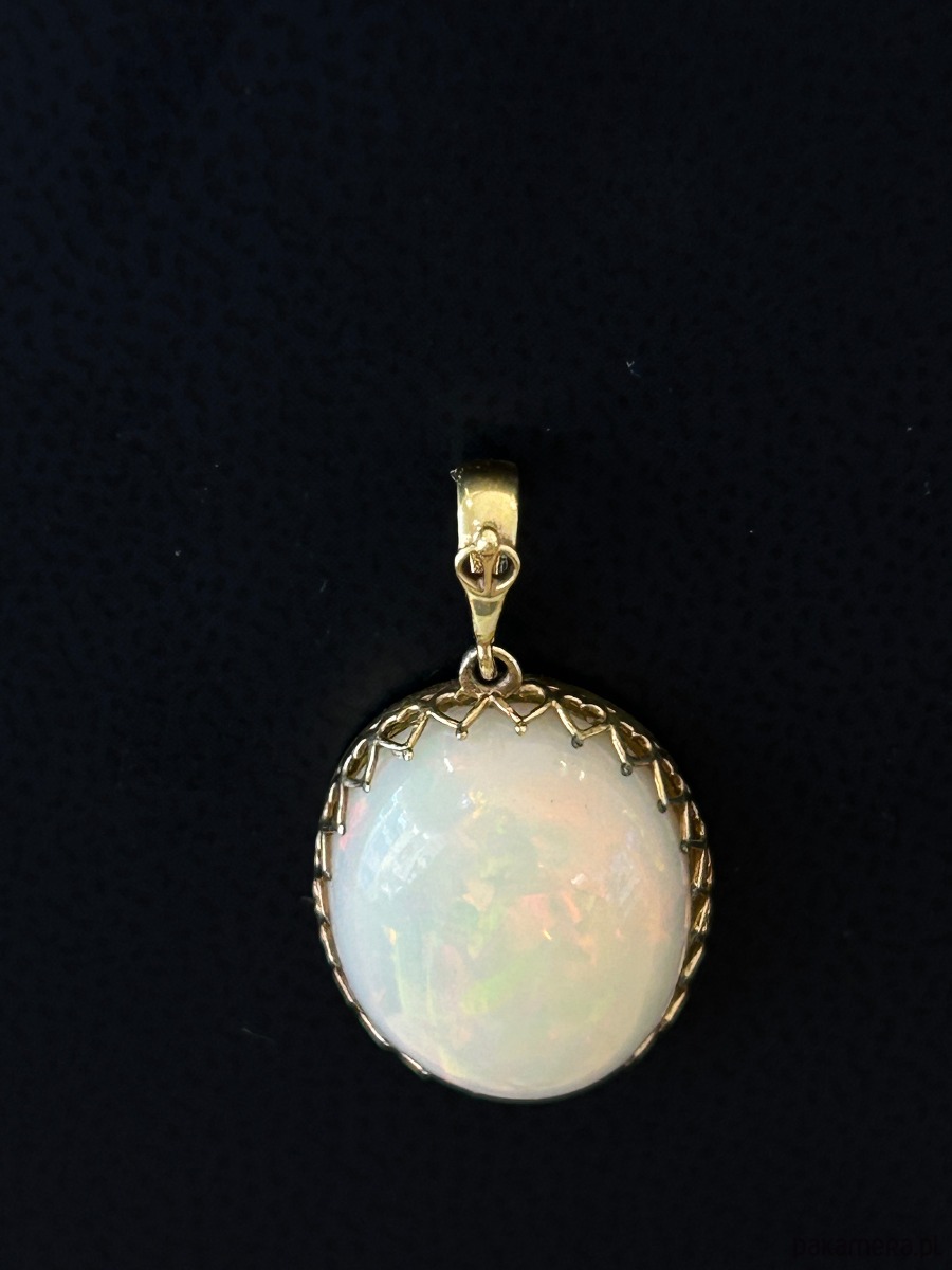 Zjawiskowy wisiorek z naturalnym opalem etiopskim, oprawiony w delikatne złoto, które podkreśla szlachetny charakter kamienia. Opal mieni się intensywną grą barw — od ognistych pomarańczy po zielone i różowe refleksy — tworząc niepowtarzalny efekt głębi i światła.