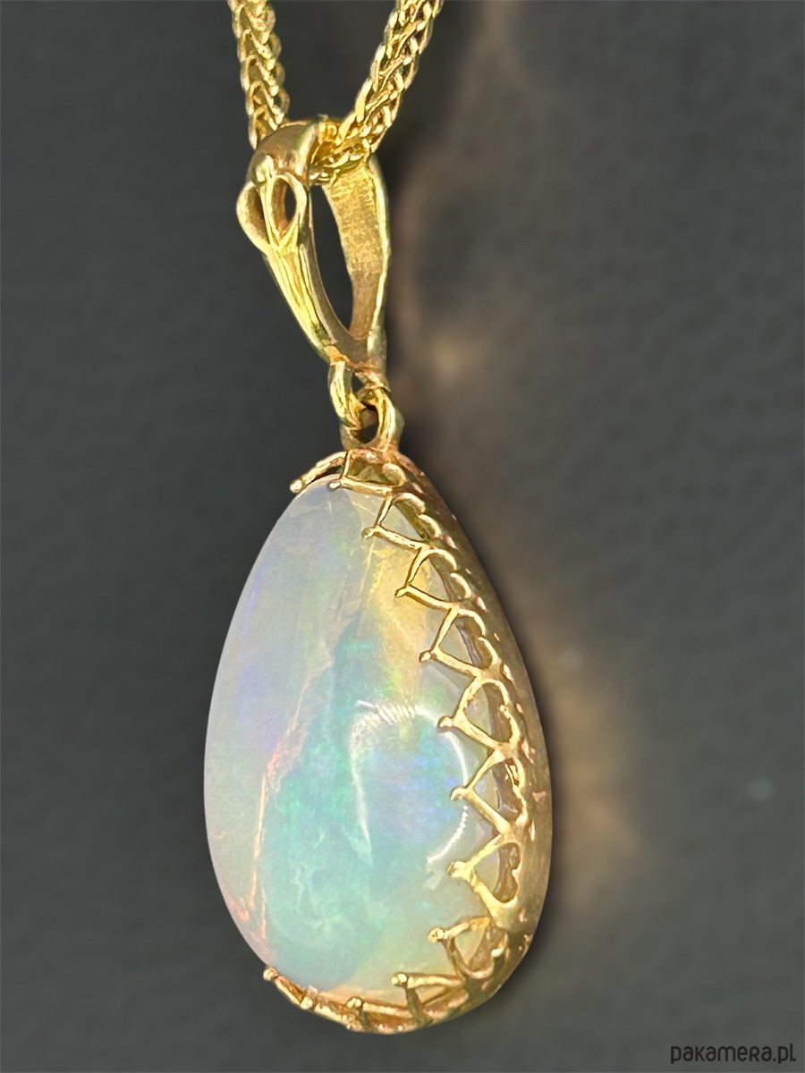 Unikatowa kropla naturalnego opalu zachwyca ognistą grą barw — od żółci i pomarańczy po błękitne refleksy, które pięknie rozświetlają kamień w każdym świetle. Oprawa z żółtego złota z delikatnym, ażurowym wykończeniem dodaje całości szlachetności i lekkości.