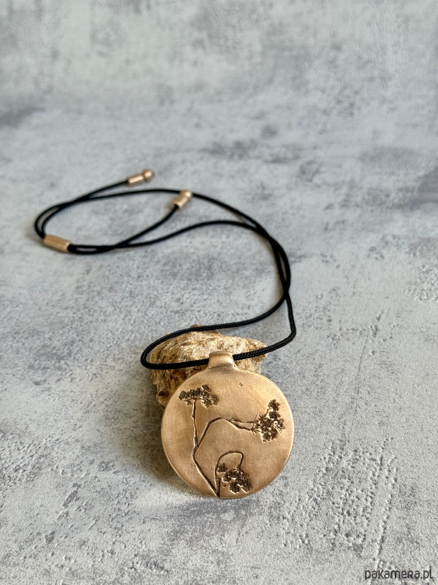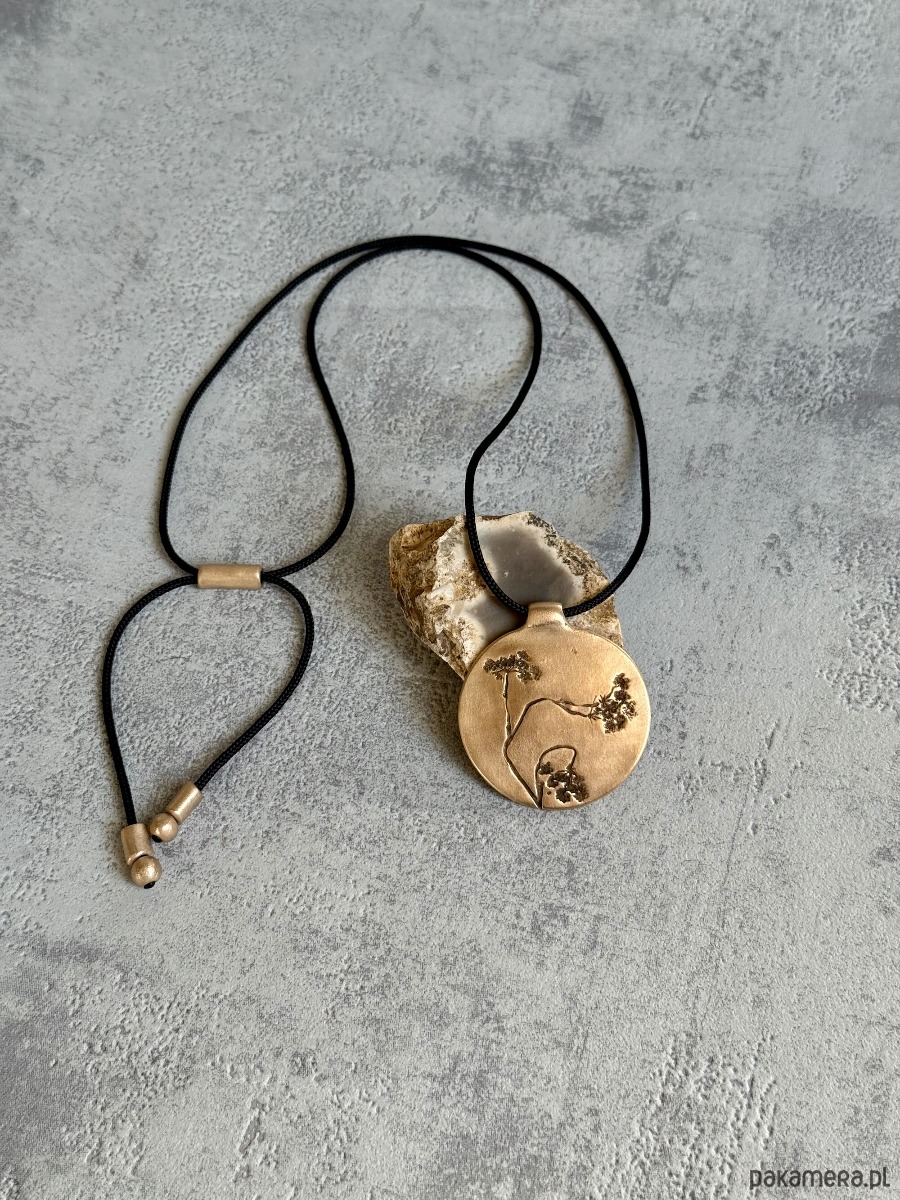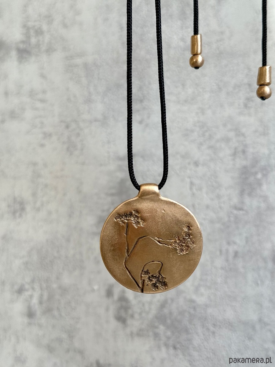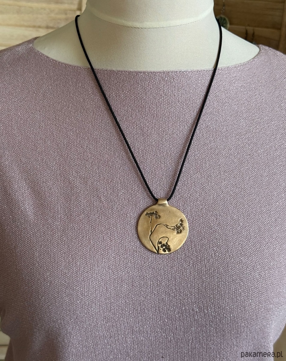 Ręcznie wykonany wisior z brązu, w którym utrwalony został odcisk prawdziwej rośliny.