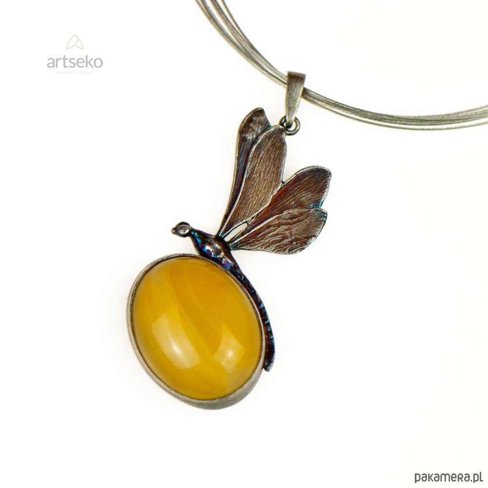 Wisior w kształcie ważki. Centrum wisiora jest żółty agat, który swoim odcieniem przywodzi na myśl promienie letniego słońca. Agat oprawiony jest w czernione, a następnie polerowane i przecierane srebro próby 925. Piękna, ręcznie formowana ważka ze srebra dodaje wisiorowi lekkości. Wisior może być eleganckim dodatkiem do stylizacji wieczorowej lub trafionym prezentem dla bliskiej osoby.