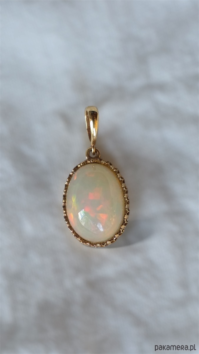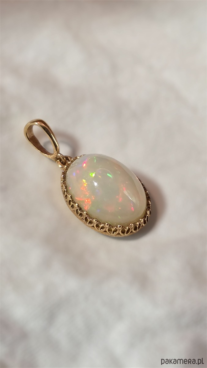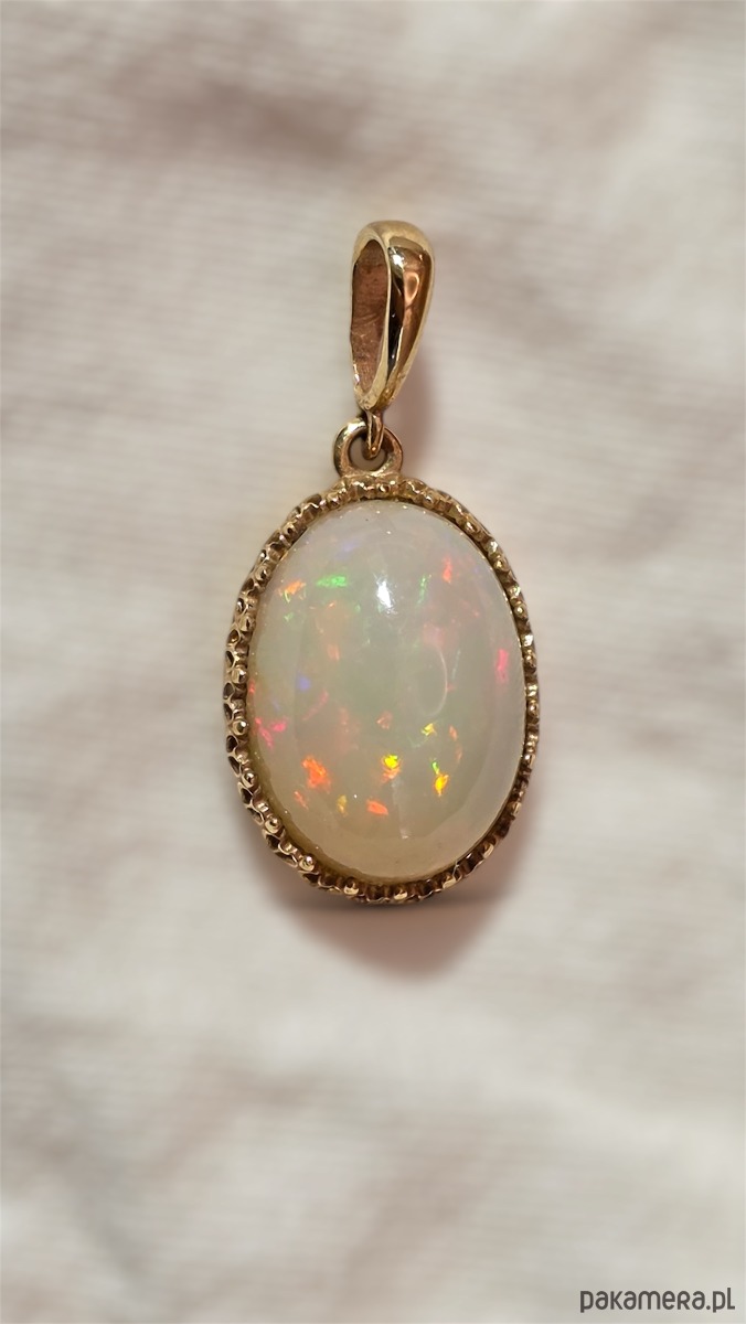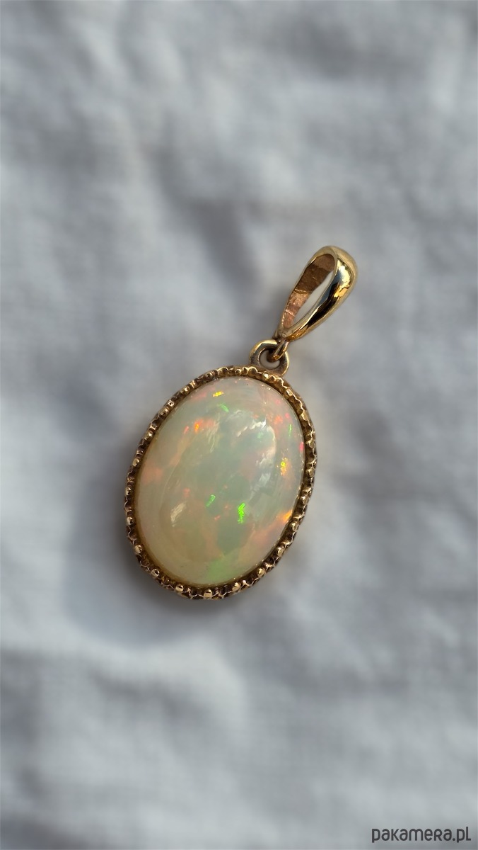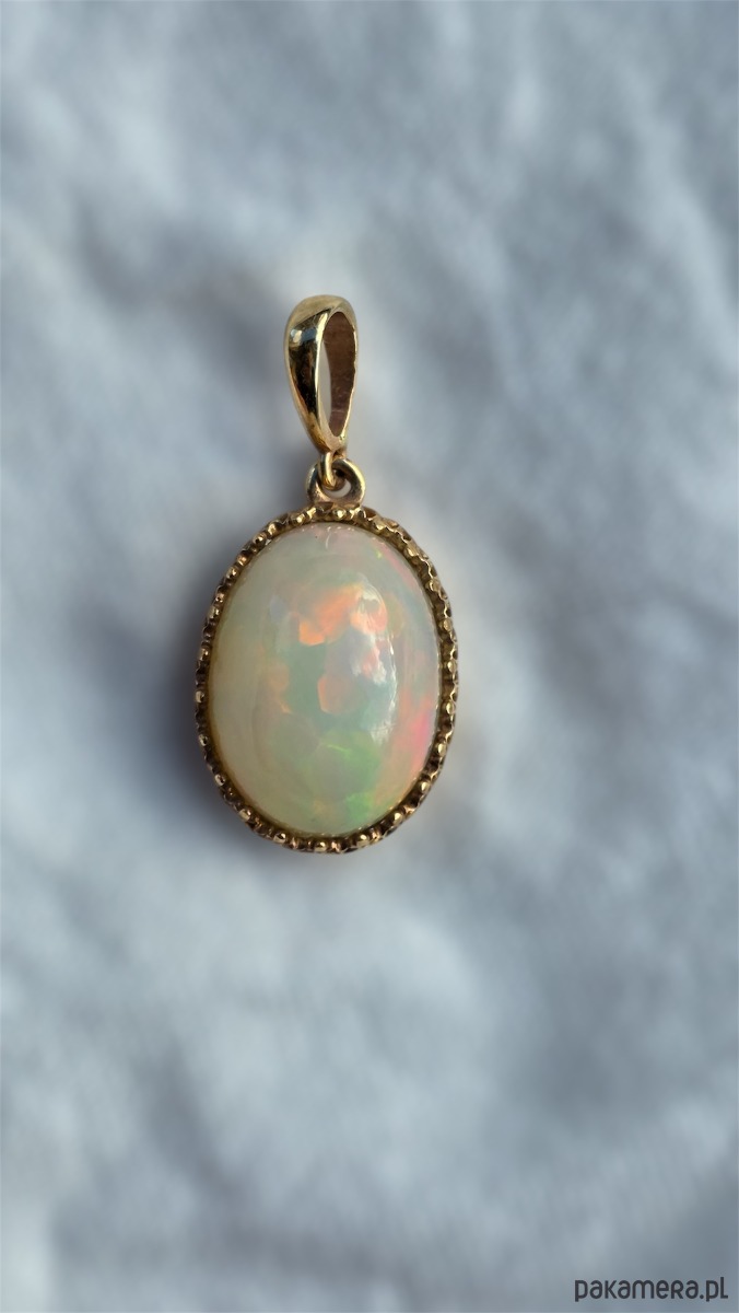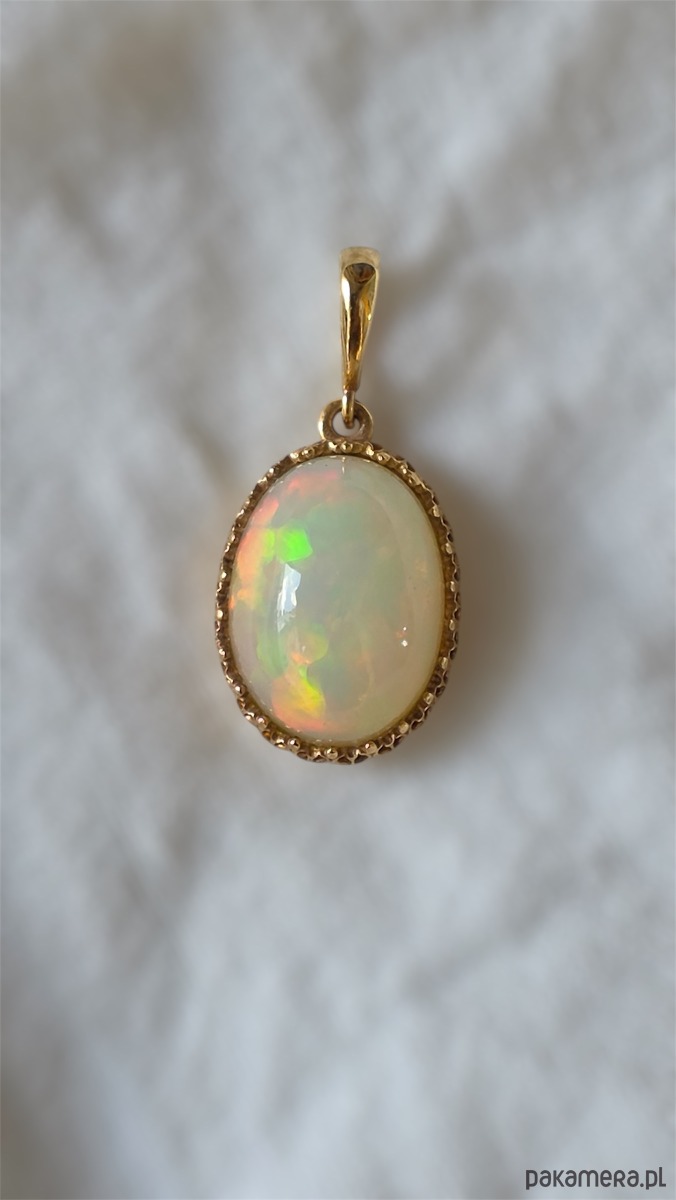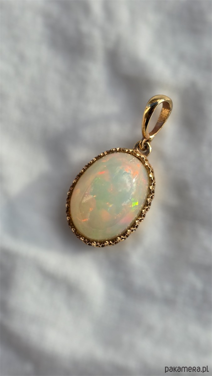 Ten wisiorek z etiopskim opalem oprawionym w złoto zachwyca subtelnym blaskiem i naturalną magią kamienia. Opal mieni się ciepłymi refleksami różu, zieleni i pomarańczu, tworząc efekt delikatnej, świetlistej tęczy zamkniętej w mlecznej głębi. Złota oprawa o dekoracyjnej, organicznej fakturze podkreśla jego szlachetność i nadaje całości wyjątkowego charakteru.