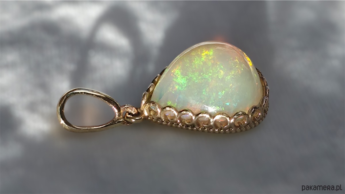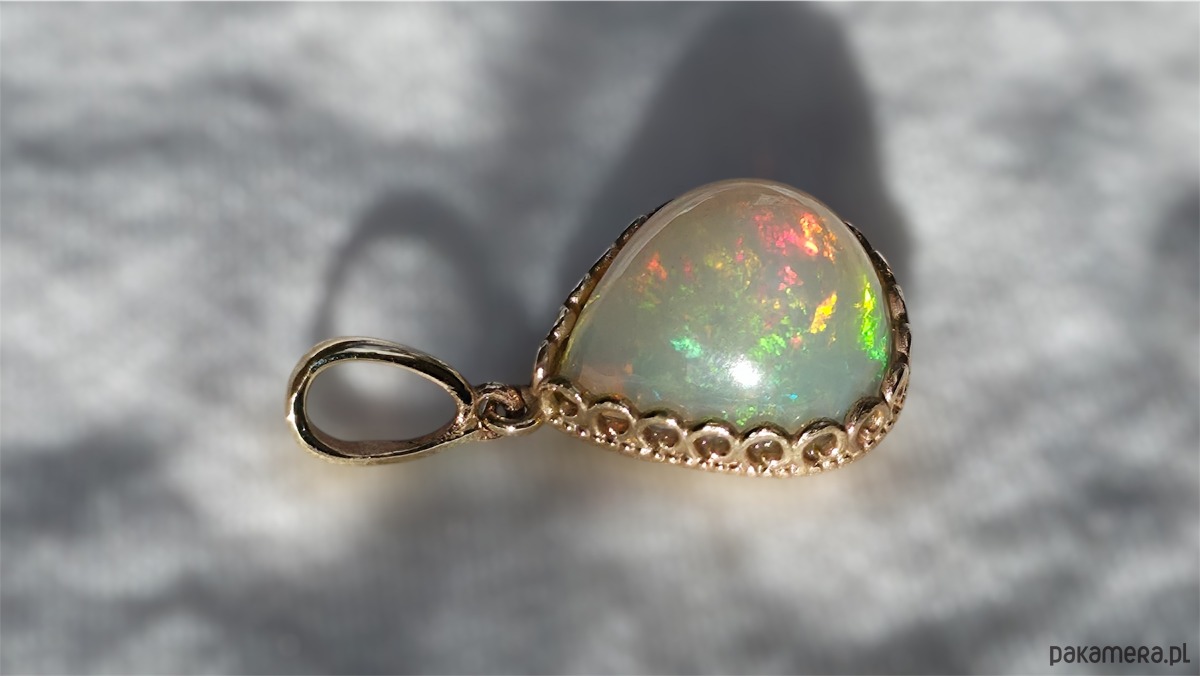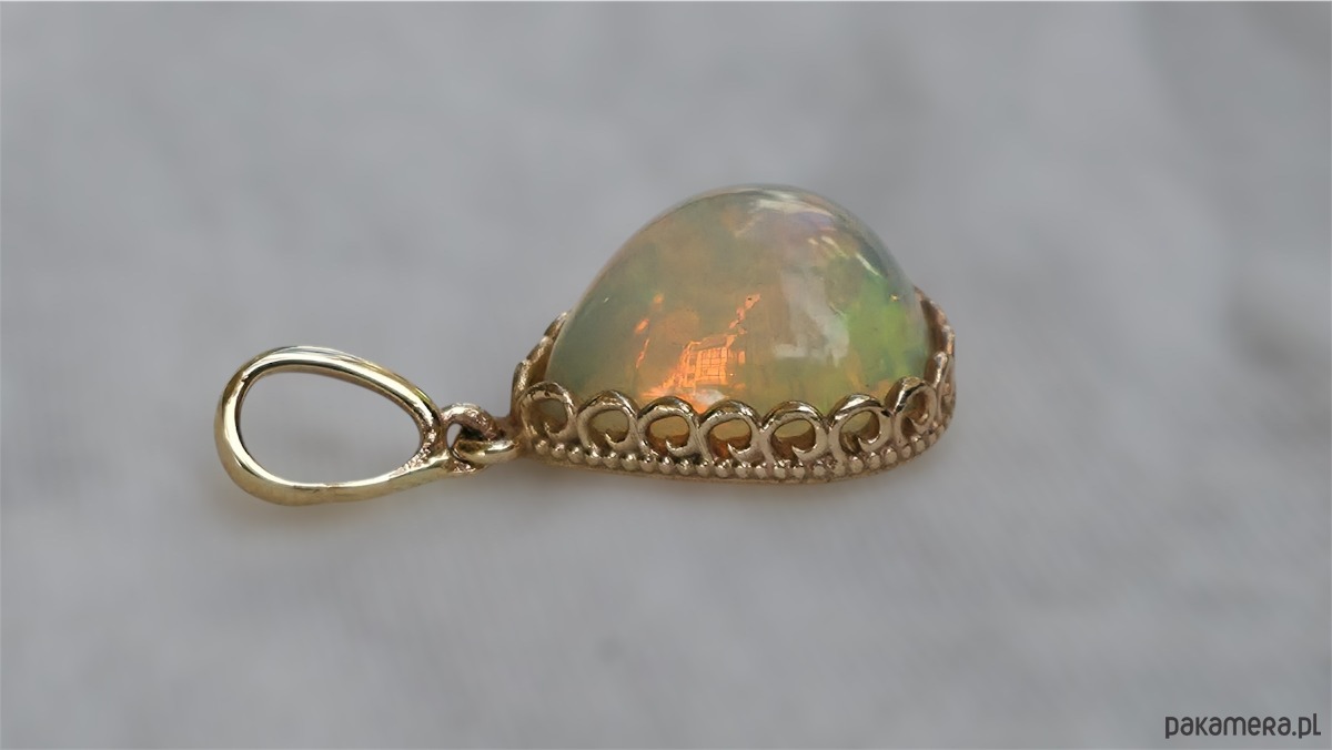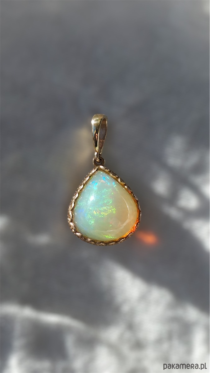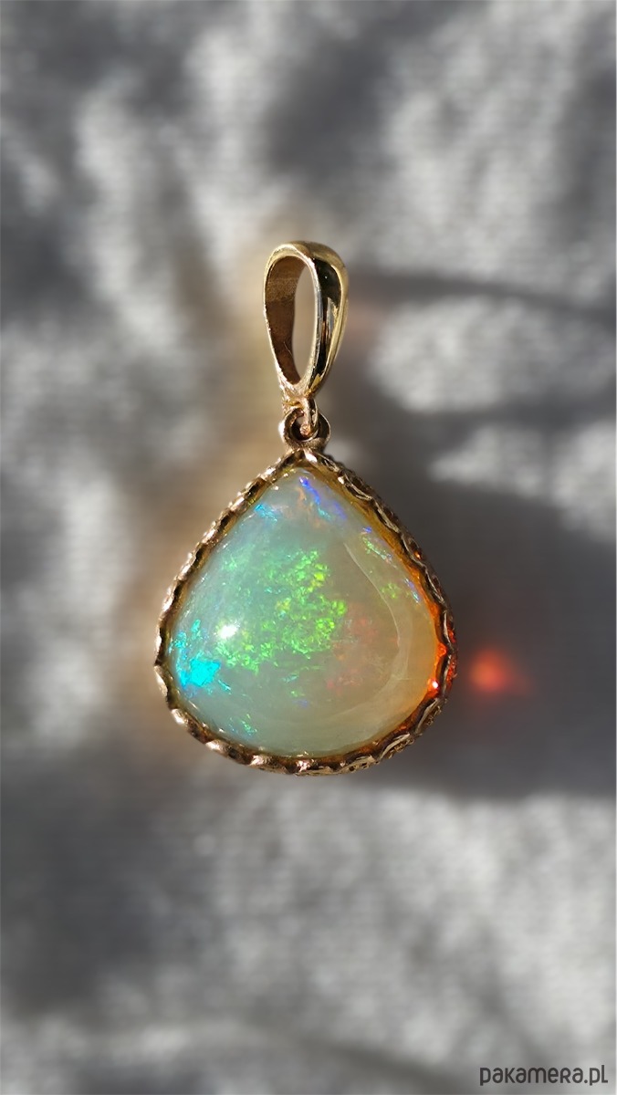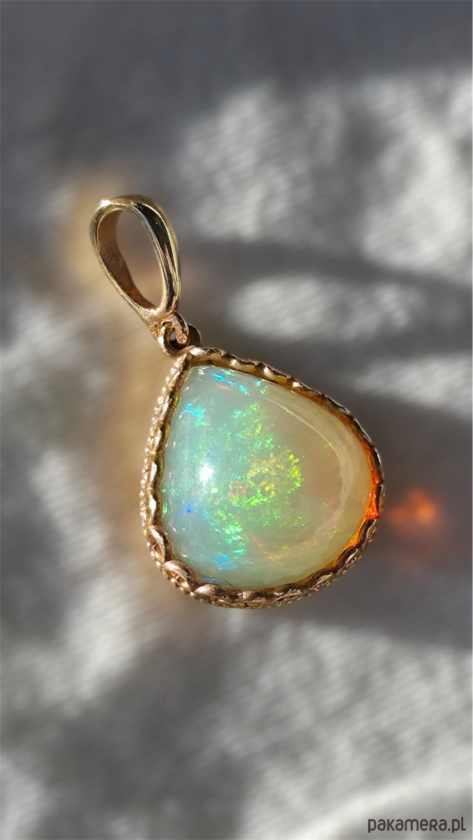 Ten złoty wisiorek z etiopskim opalem przyciąga wzrok swoim hipnotyzującym blaskiem. Kropla opalu rozświetla się wewnętrzną grą barw — od świetlistych zieleni, przez błękity, aż po ciepłe, ogniste refleksy. Kamień wygląda, jakby zatrzymywał w sobie promienie słońca i odbijał je w miękkiej, mlecznej poświacie.