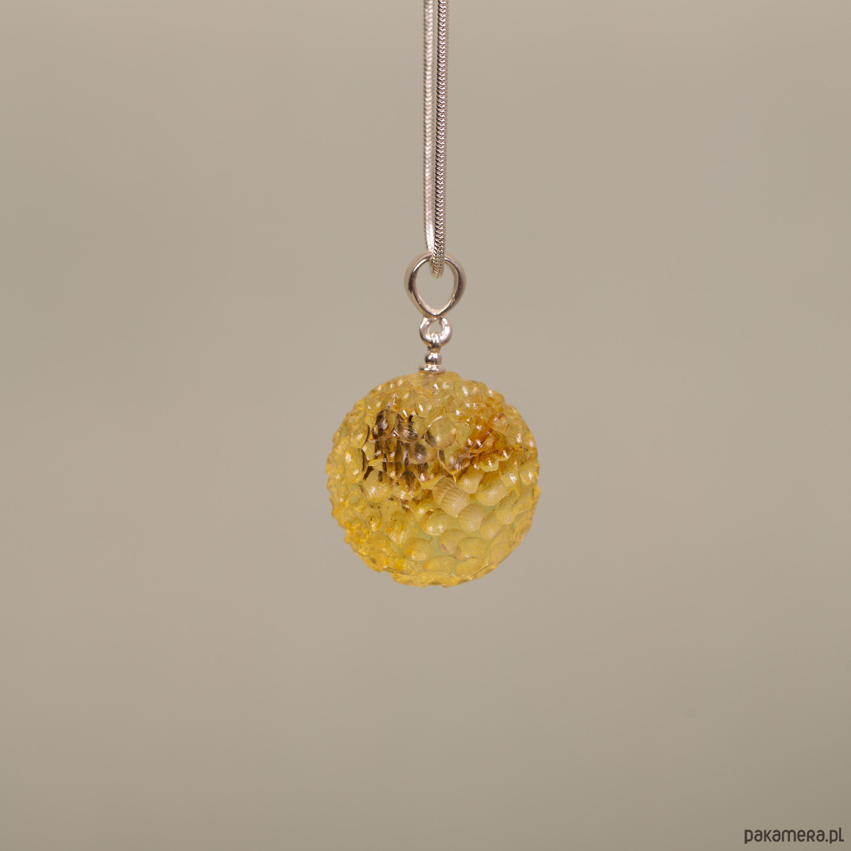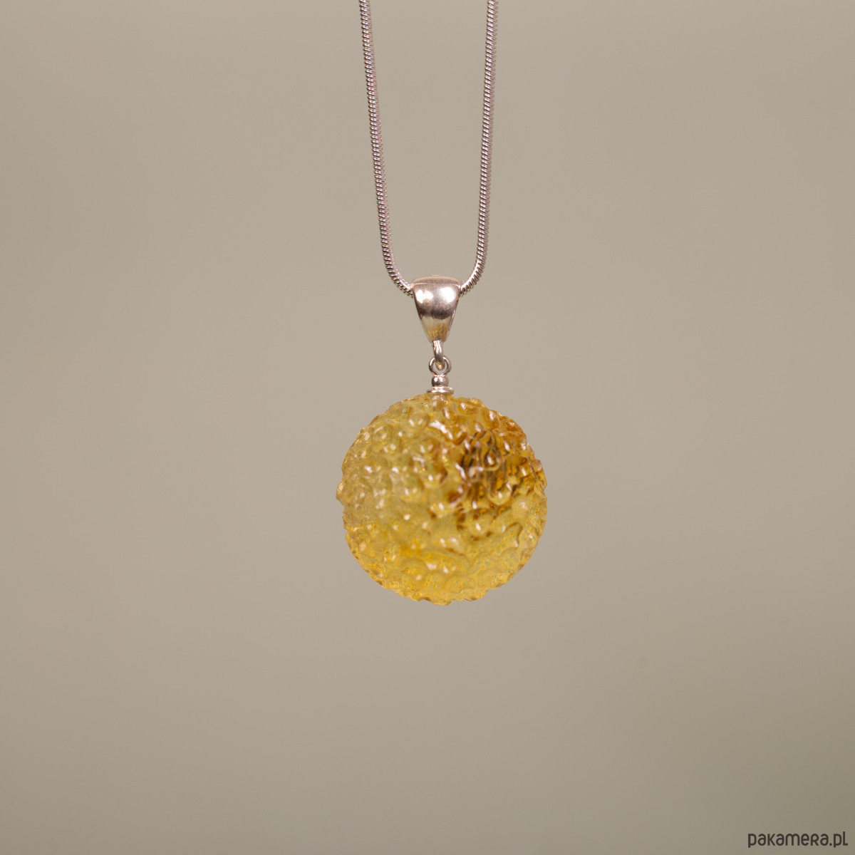 Srebro próby 925 · bursztyn bałtycki cytrynowy (rzeźbiony) · waga: 5,6 g · średnica kulki: ok. 2,2 cm · bez łańcuszka · ręczna praca autorska