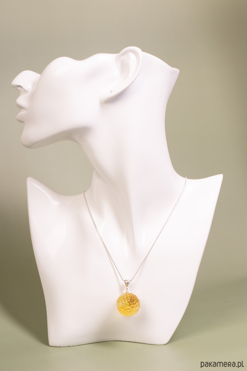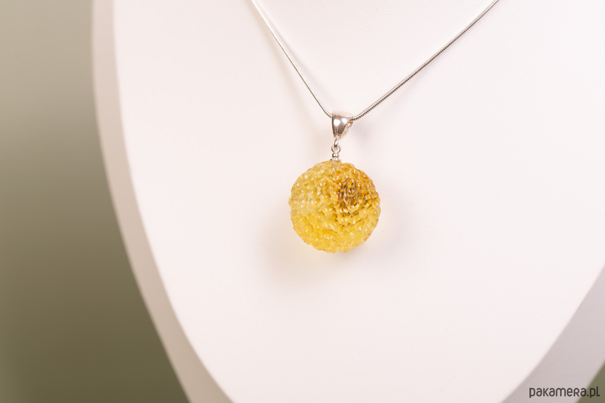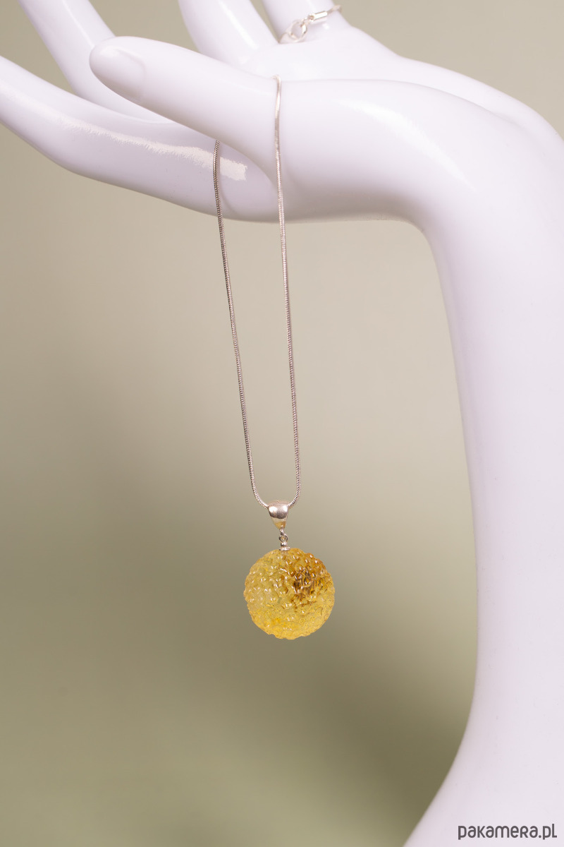 Artystyczny wisiorek wykonany z bursztynu bałtyckiego w rzadkim, jasnym kolorze cytrynowym. Bursztyn otrzymał unikatową, ręcznie rzeźbioną formę kuli o fakturowanej powierzchni, która efektownie rozprasza światło. To nowoczesny i oryginalny dodatek, który łączy minimalistyczną formę z bogatą, naturalną strukturą.