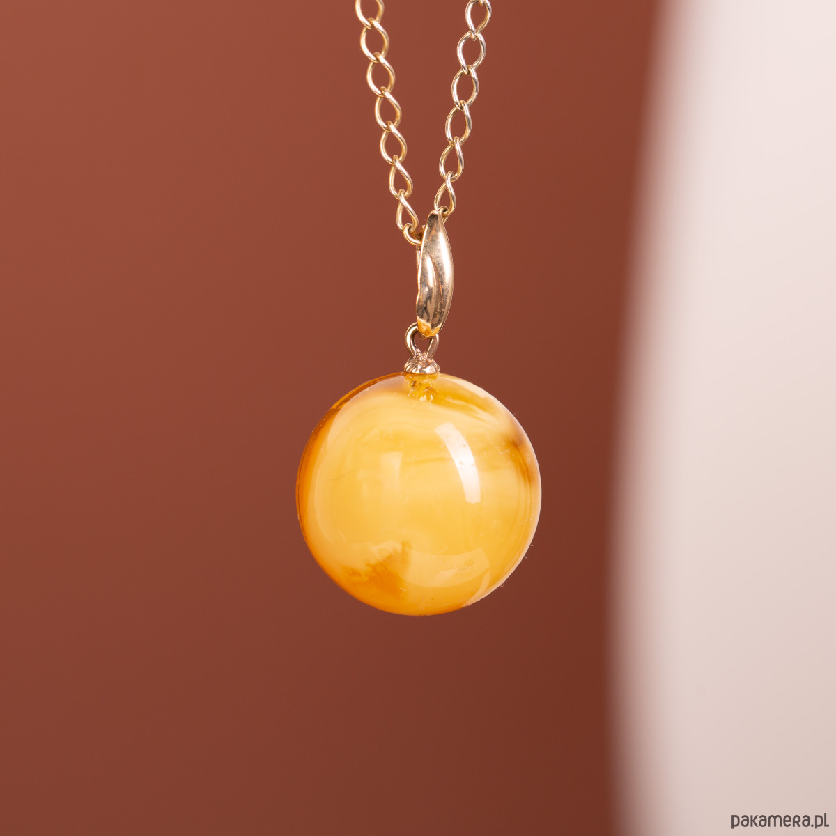 Elegancki i ponadczasowy wisiorek, którego sercem jest idealnie oszlifowana kula z naturalnego bursztynu bałtyckiego. Bursztyn o ciepłym, mleczno-żółtym odcieniu charakteryzuje się unikatowymi, naturalnymi smugami, które nadają mu głębi. Minimalistyczna zawieszka wykonana z 14-karatowego złota (próba 585) podkreśla luksusowy charakter biżuterii, tworząc harmonijne połączenie z organicznym pięknem bursztynu.