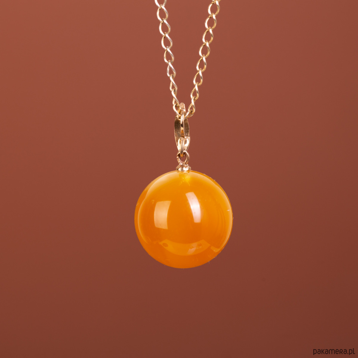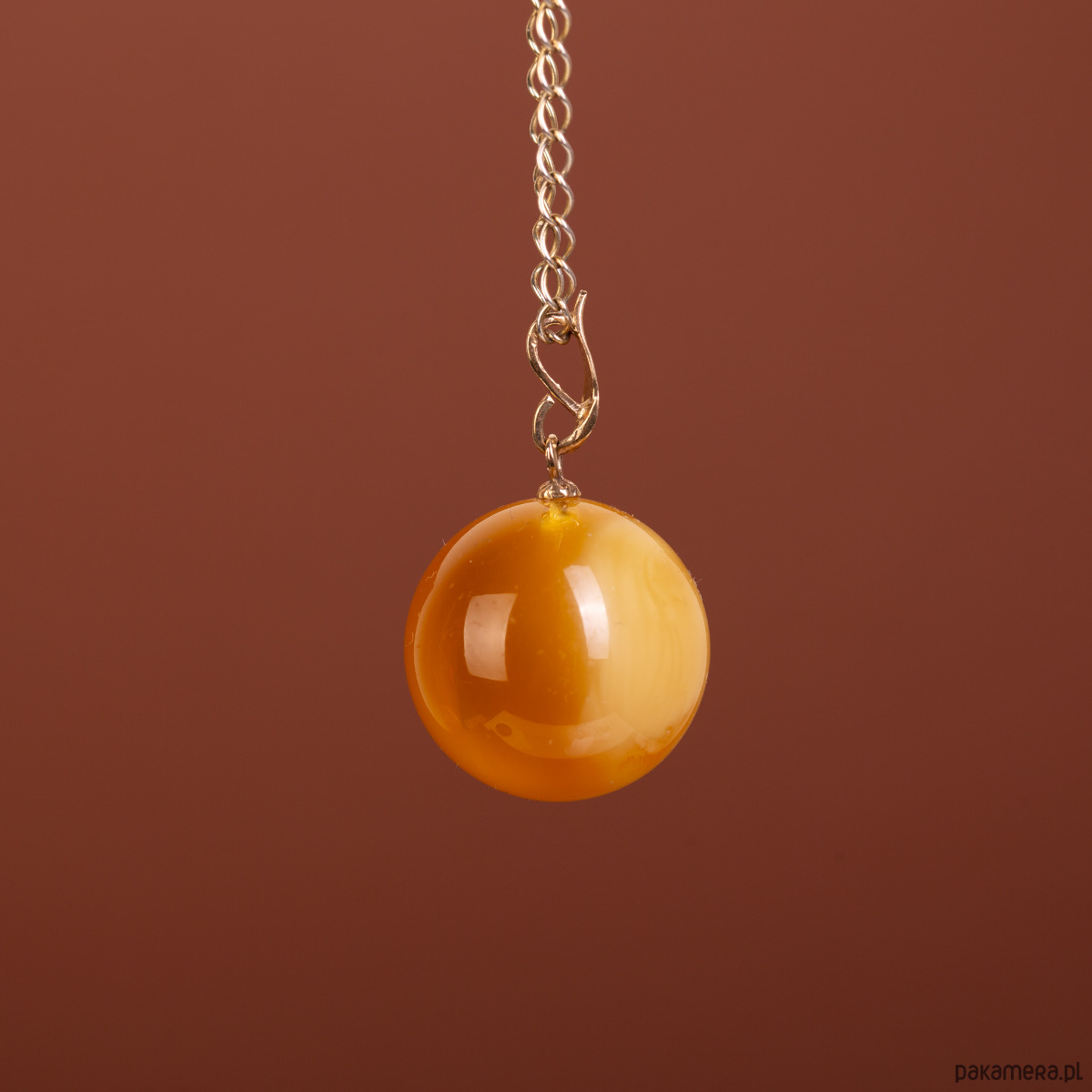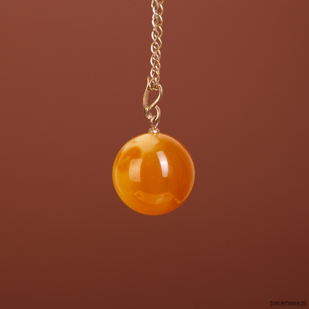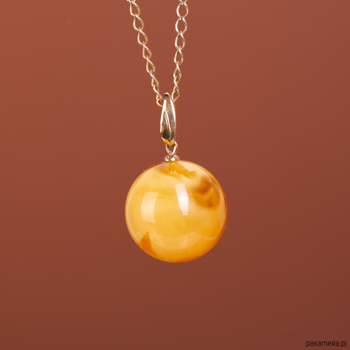 Rozmiar i skala: Średnica bursztynowej kulki wynosi 2,2 cm, co wielkością niemal idealnie odpowiada monecie 5-złotowej (2,4 cm). Całkowita długość wisiorka wraz ze złotą krawatką to 3,5 cm. To forma zwarta, geometryczna i bardzo wyrazista, która doskonale prezentuje się na dekolcie.