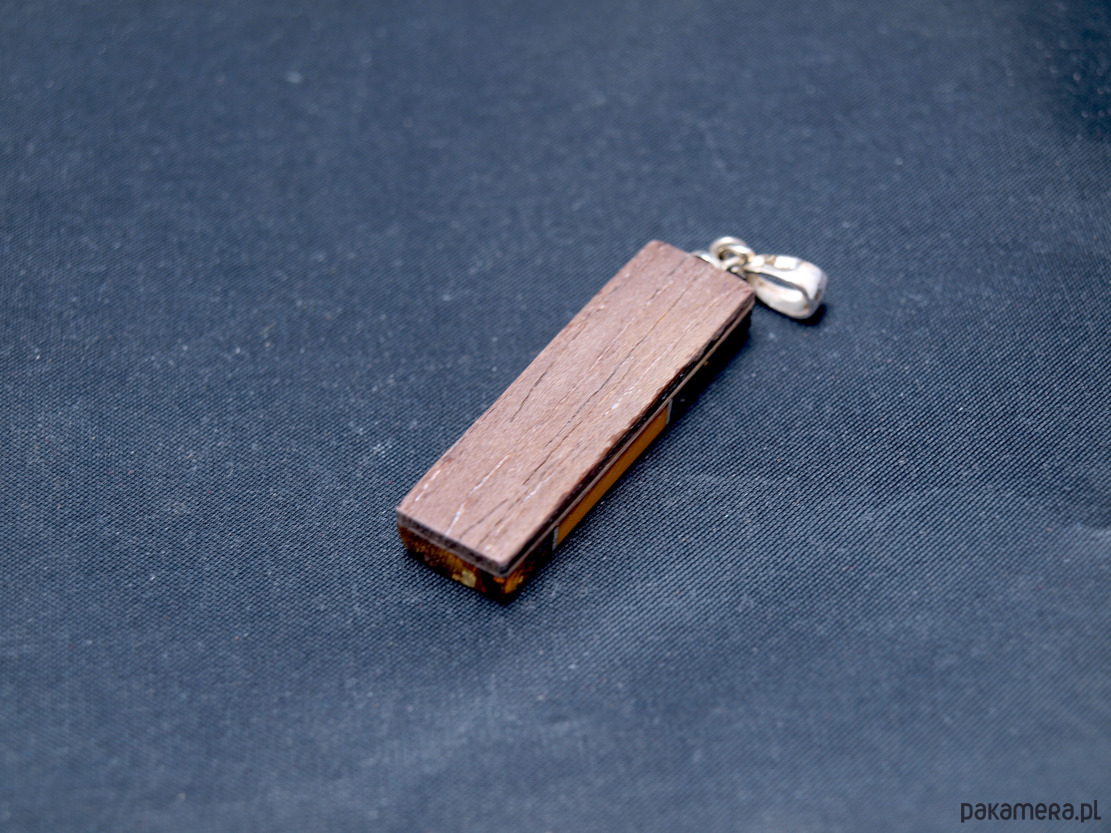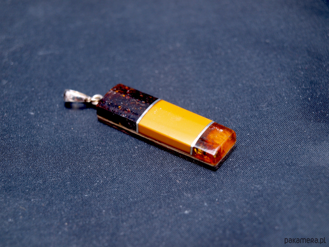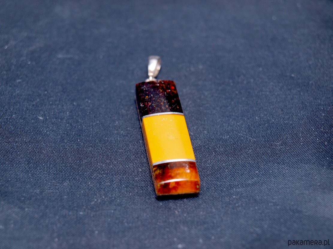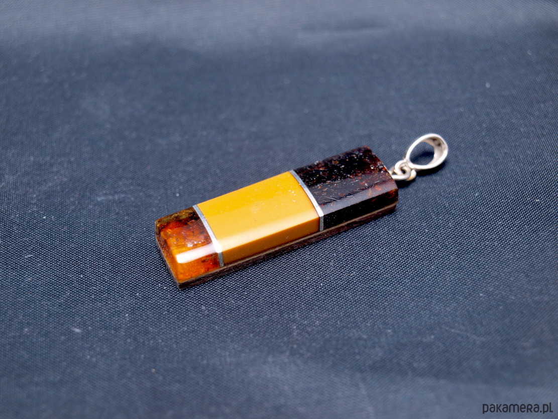 Ręcznie wykonany wisiorek z naturalnego bursztynu. Produkt wykonano ze srebra próby 925 i polskiego bursztynu. Wisiorek przypomina mozaikę. Kawałki bursztynu przedzielono srebrnymi ramkami. Całość umieszczono na kawałku drewna - dębu z kanału panamskiego.