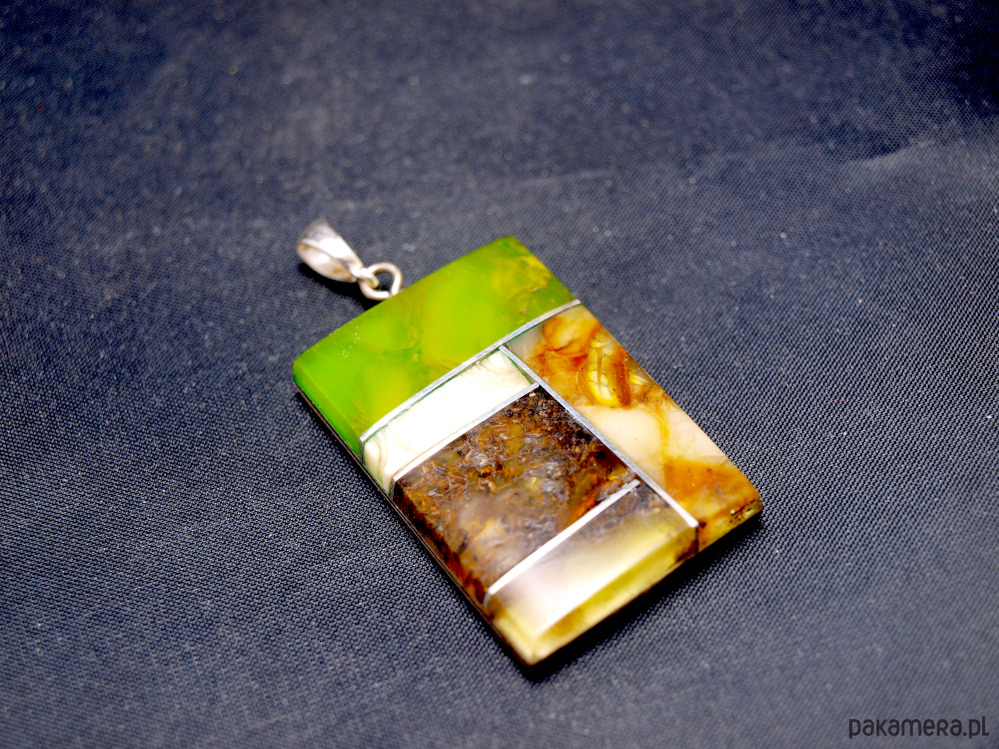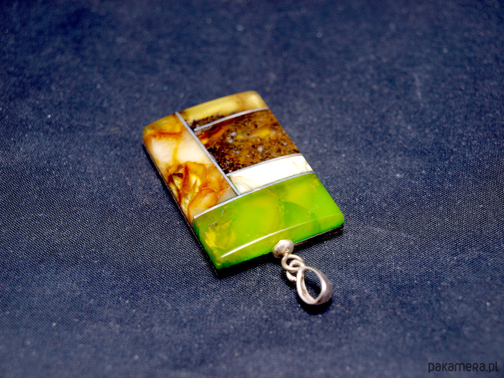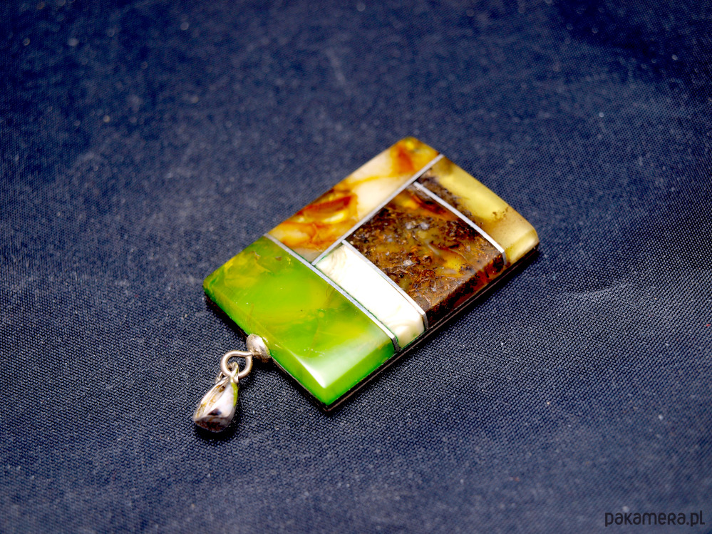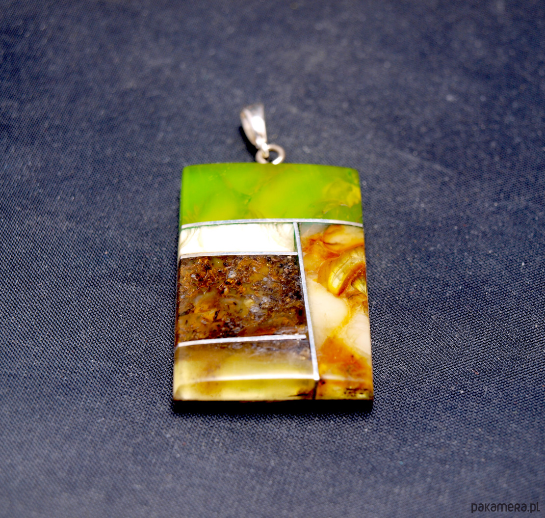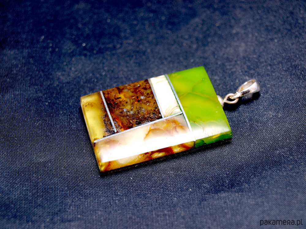 Ręcznie wykonany wisiorek z naturalnego bursztynu. Produkt wykonano ze srebra próby 925 i polskiego bursztynu. Wisiorek przypomina mozaikę. Kawałki bursztynu przedzielono srebrnymi ramkami. Całość umieszczono na kawałku drewna - dębu z kanału panamskiego.