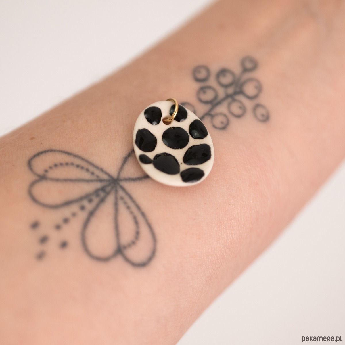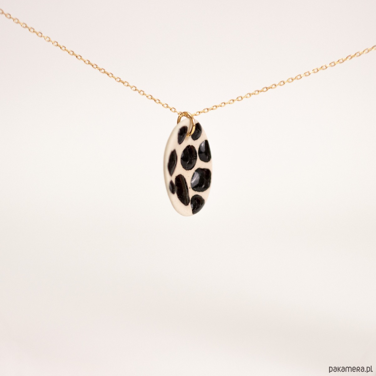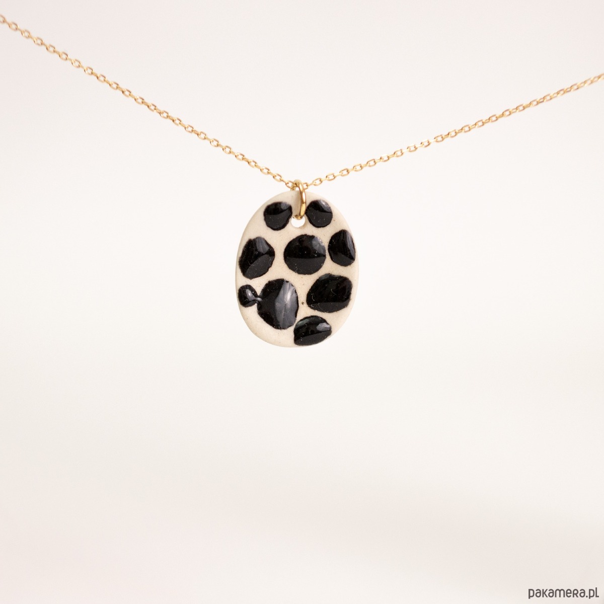 Wisiorek ceramiczny z zawieszką w kolorze złotym. Ceramiczna część z czarnymi kropkami ze szkliwa błyszczącego. Element ceramiczny wypalony w wysokiej temperaturze 1250 st.C