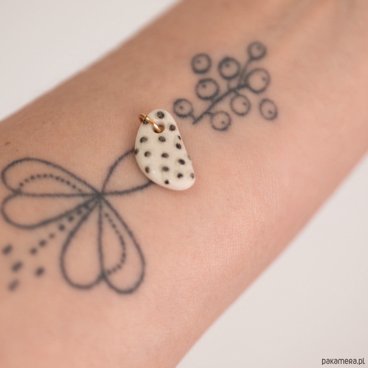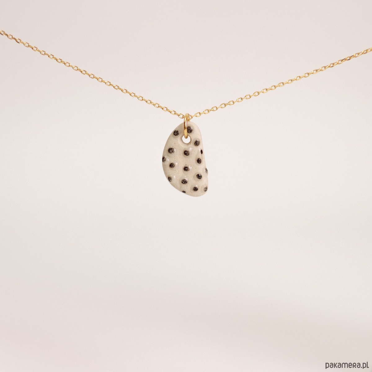 Wisiorek ceramiczny z zawieszką w kolorze złotym. Ceramiczna część z malowanymi czarnymi kropeczkami pokrytymi transparentnym szkliwem błyszczącym. Element ceramiczny wypalony w wysokiej temperaturze 1250 st.C