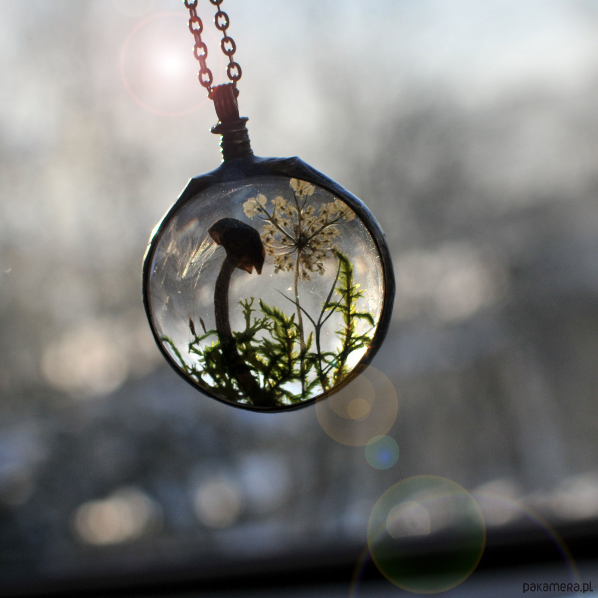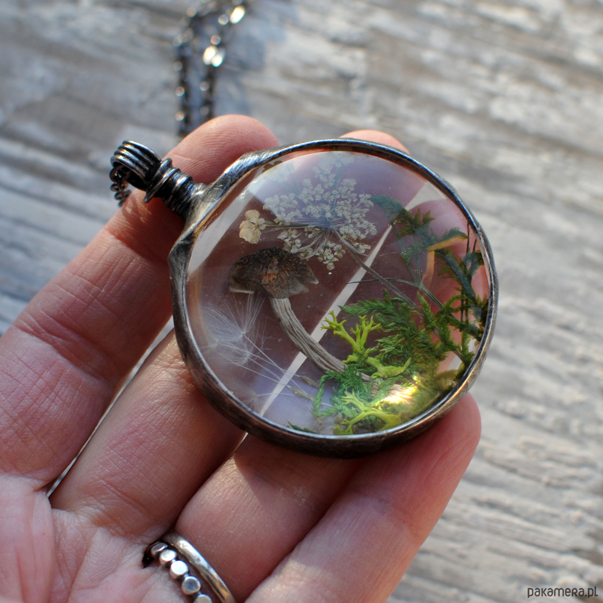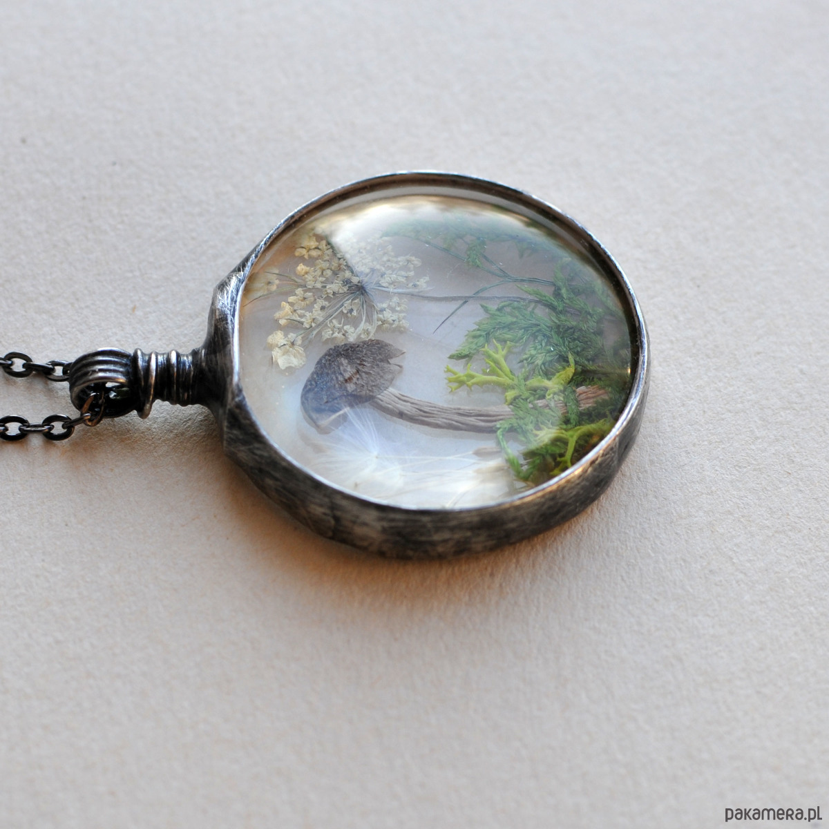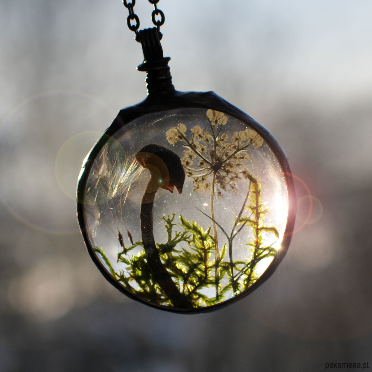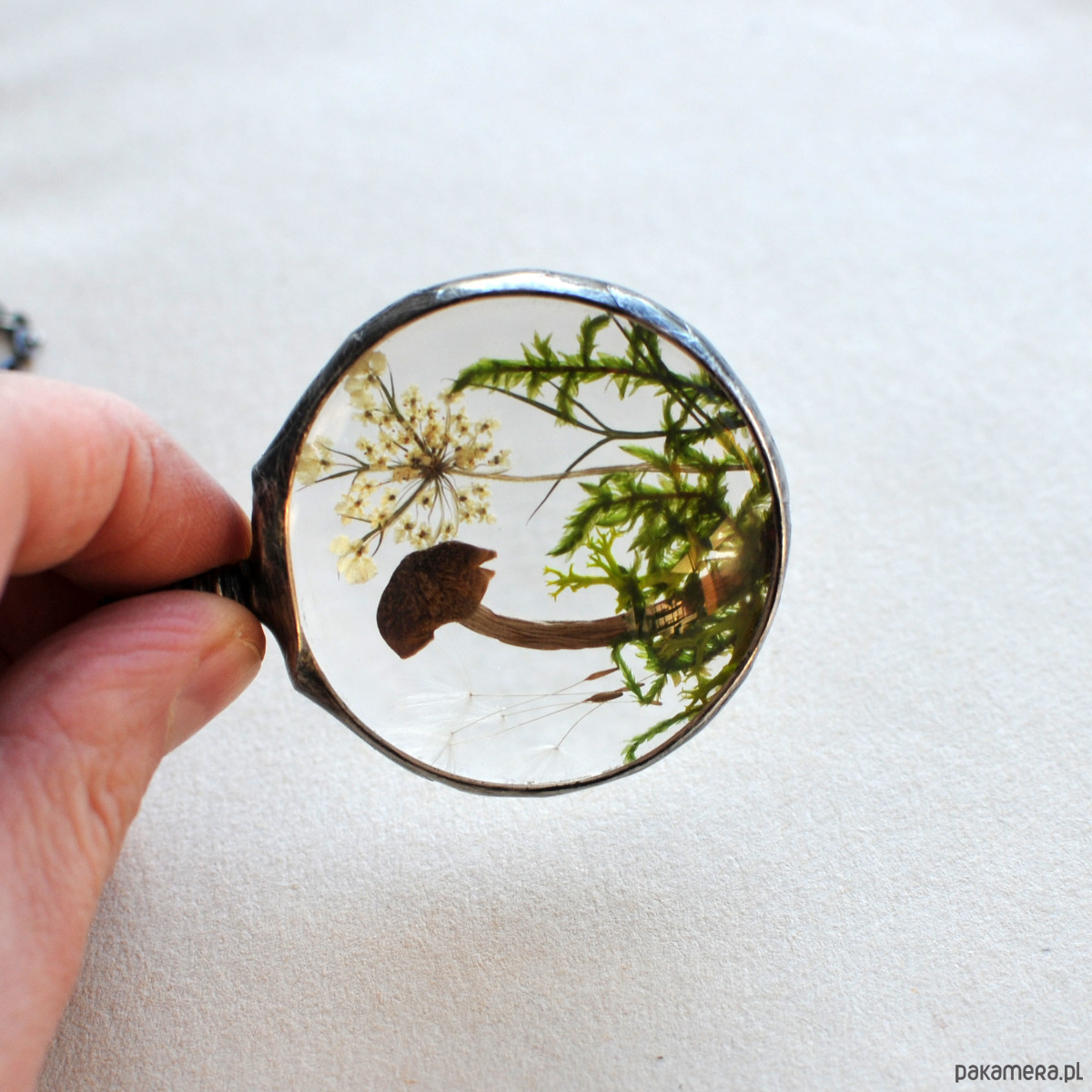 Wisiorek z zasuszonym roślinami umieszczonymi w szkle, oprawiony w artystyczną ramę