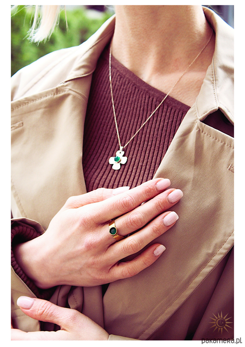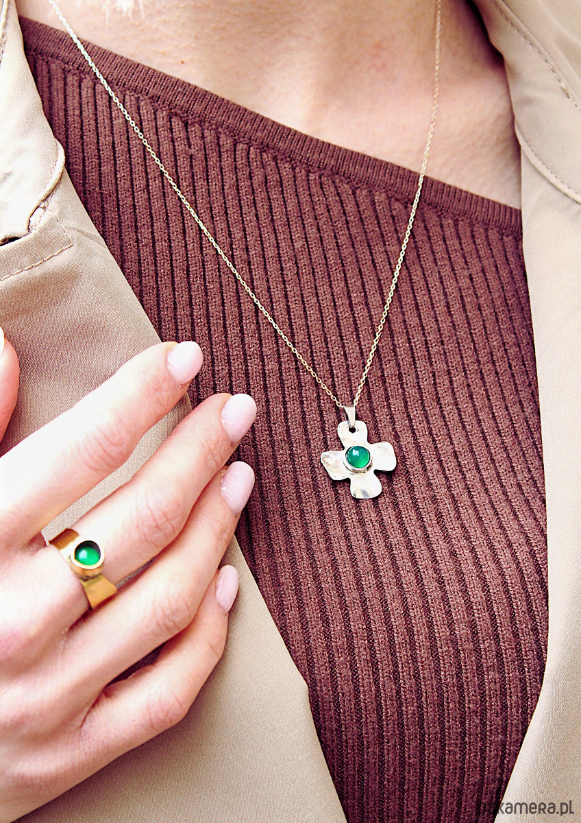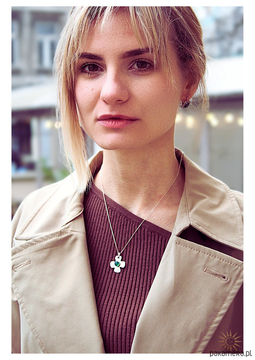 Ręcznie wykonany wisiorek ze srebra próby 925. Zawieszka o kształcie koniczyny, której sercem jest naturalny kamień Agatu. Zawieszka została stworzona metodą rzemieślniczą.