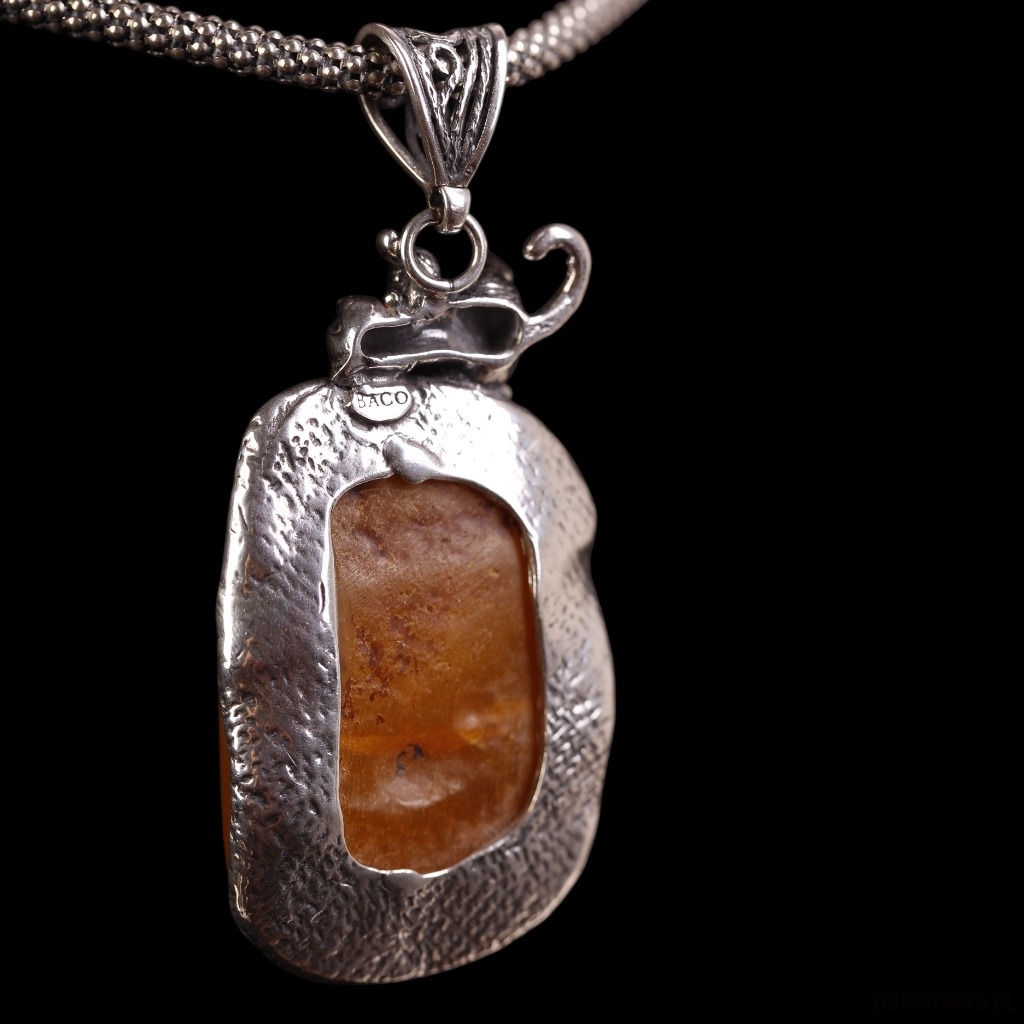 Wisiorek z naturalnym bursztynem bałtyckim, nad którym siedzi uroczy srebrny kotek. Ciepły, mleczno‑miodowy bursztyn pięknie kontrastuje z chłodnym srebrem, a dopracowana w szczegółach figurka kota dodaje całości lekkości i charakteru. To biżuteria, która przyciąga wzrok i świetnie dopełnia zarówno codzienne, jak i bardziej eleganckie stylizacje.