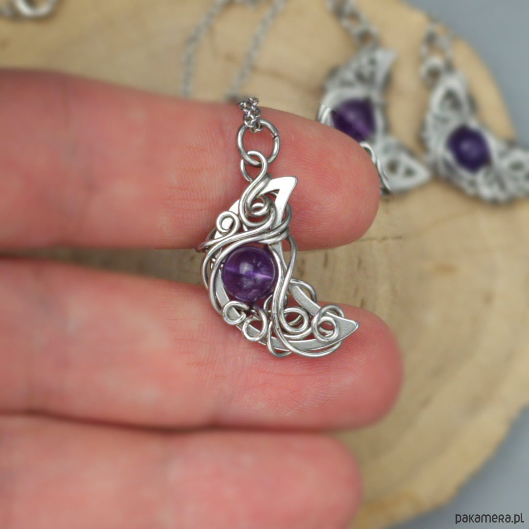 Ręcznie robiony wisiorek księżyc z fioletowym ametystem, wykonany techniką wire wrapping z drutów ze stali chirurgicznej.