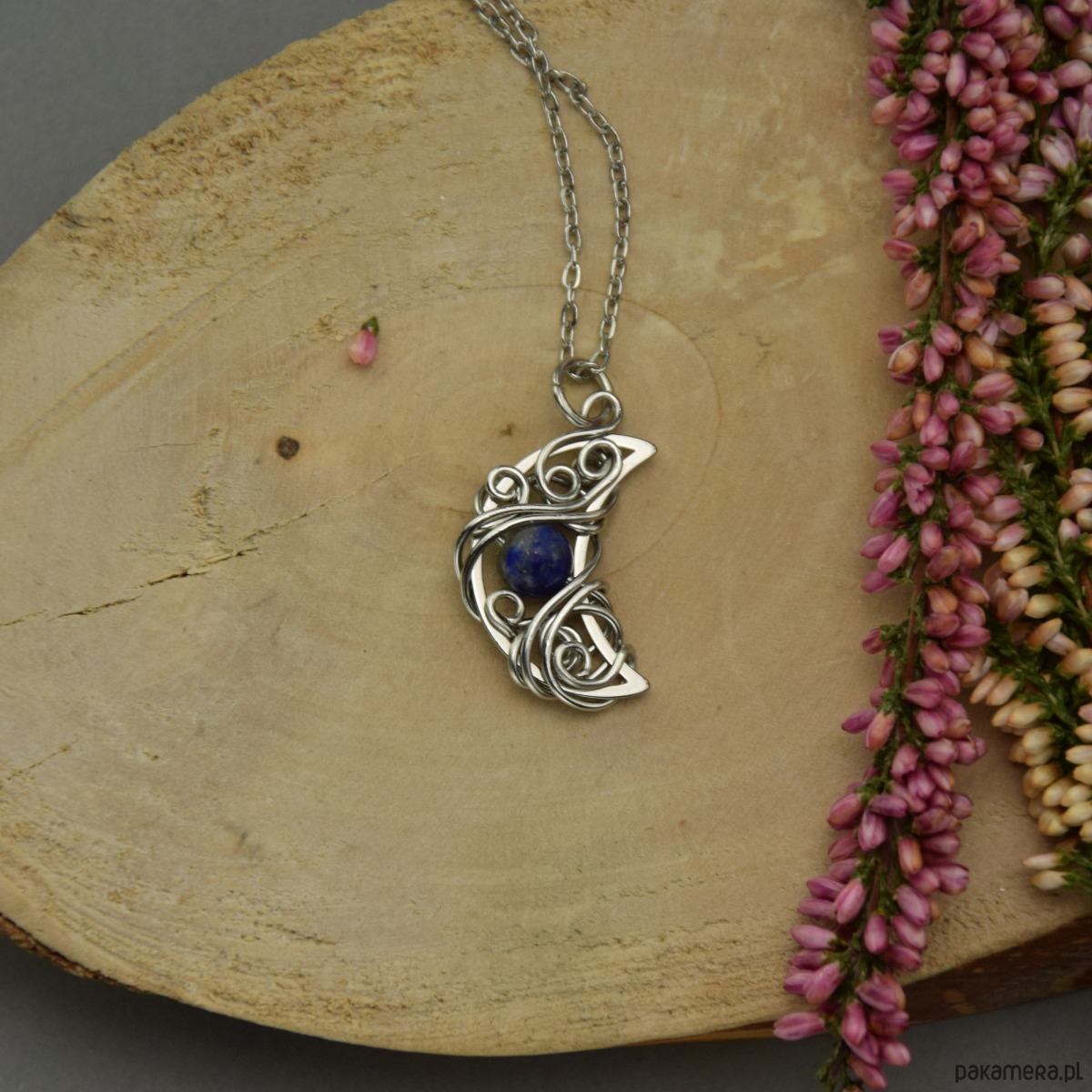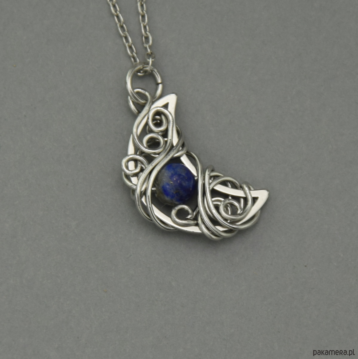 Ręcznie robiony wisiorek księżyc z lapis lazuli, wykonany techniką wire wrapping z drutów ze stali chirurgicznej. Długość całkowita wisiorka (z kółeczkiem) 2,9 cm. Sam księżyc ma wymiary około 2,1x1,6cm. Zawieszony został na łańcuszku o długości 50 cm - na życzenie mogę go dowolnie skrócić lub przedłużyć.