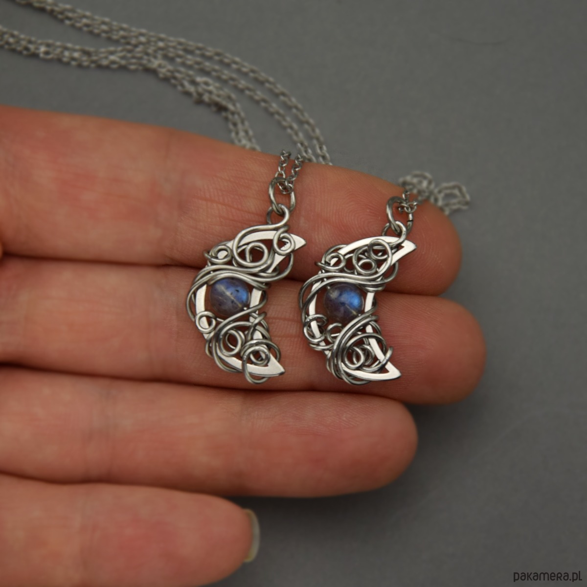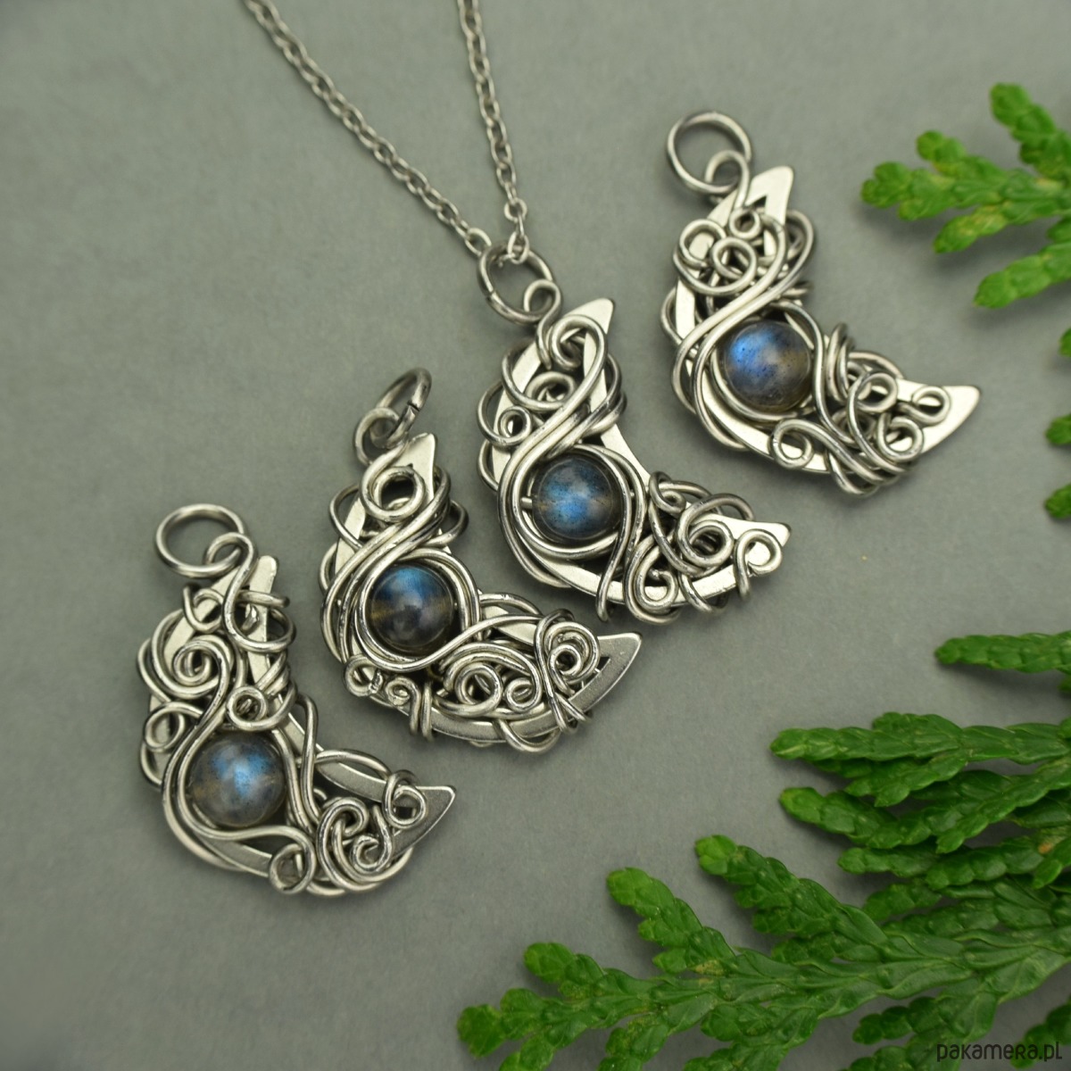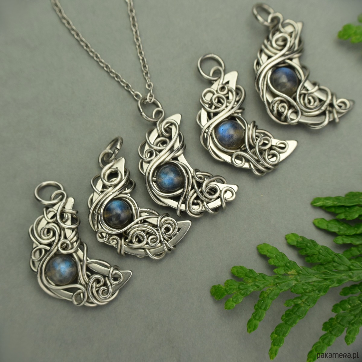 Wisiorek księżyc z labradorytem połyskującym na niebiesko, wykonany techniką wire wrapping z drutów ze stali chirurgicznej. Księżyce są ręcznie robione i różnią się od siebie. Każdy z nich jest unikatowy- wzory z drutów są niepowtarzalne. Zdjęcia przedstawiają przykładowe wisiorki. Wisiorek wysyłany jest losowo.