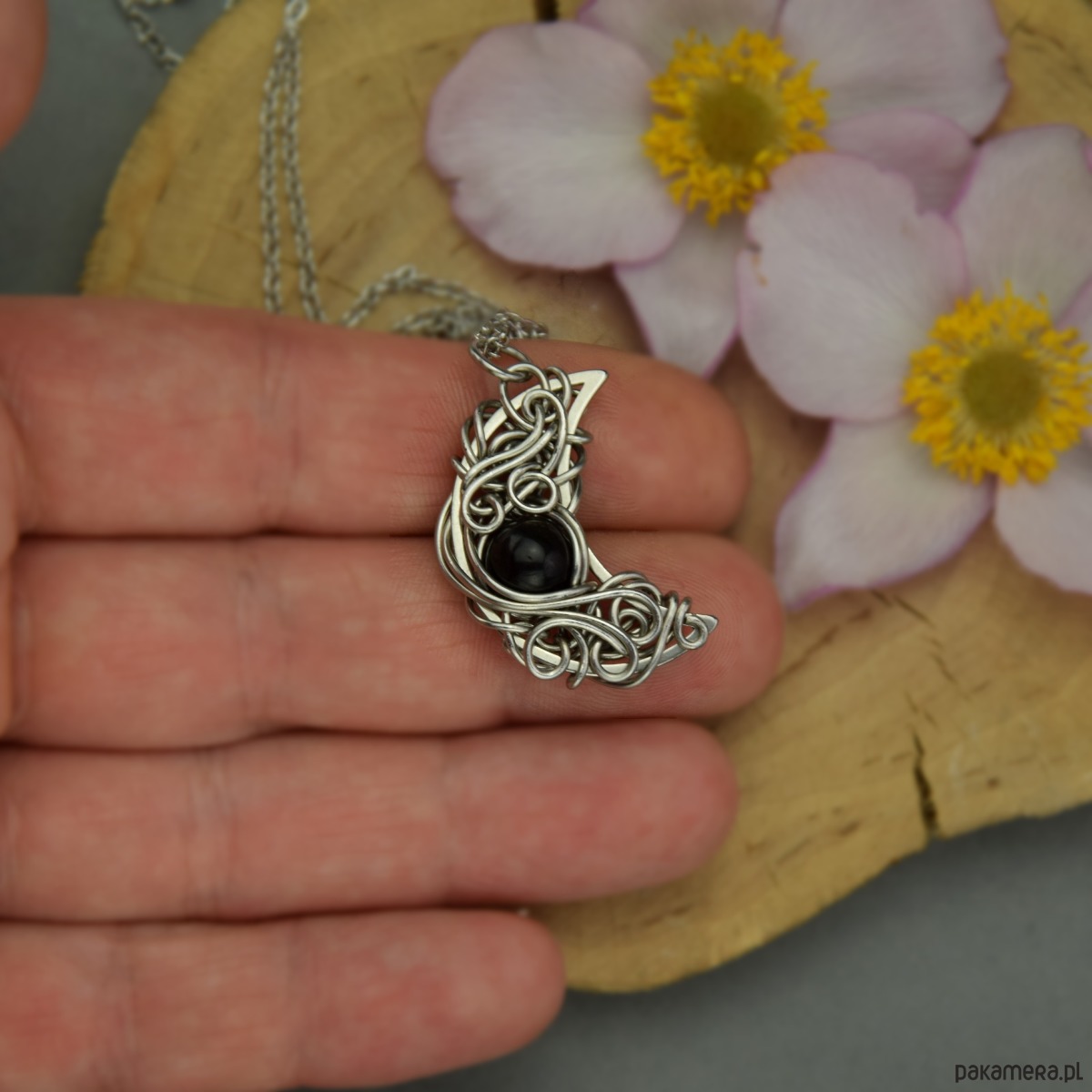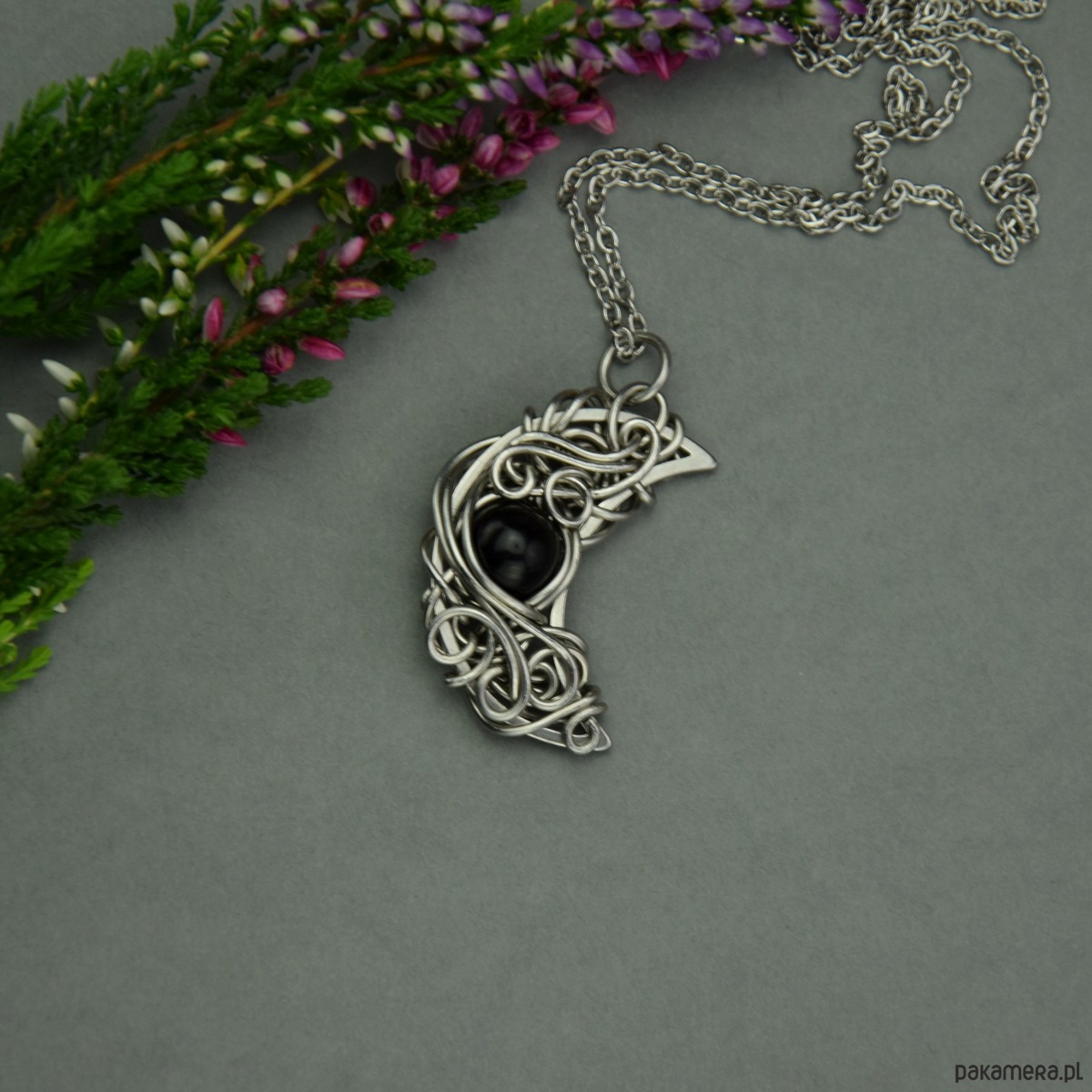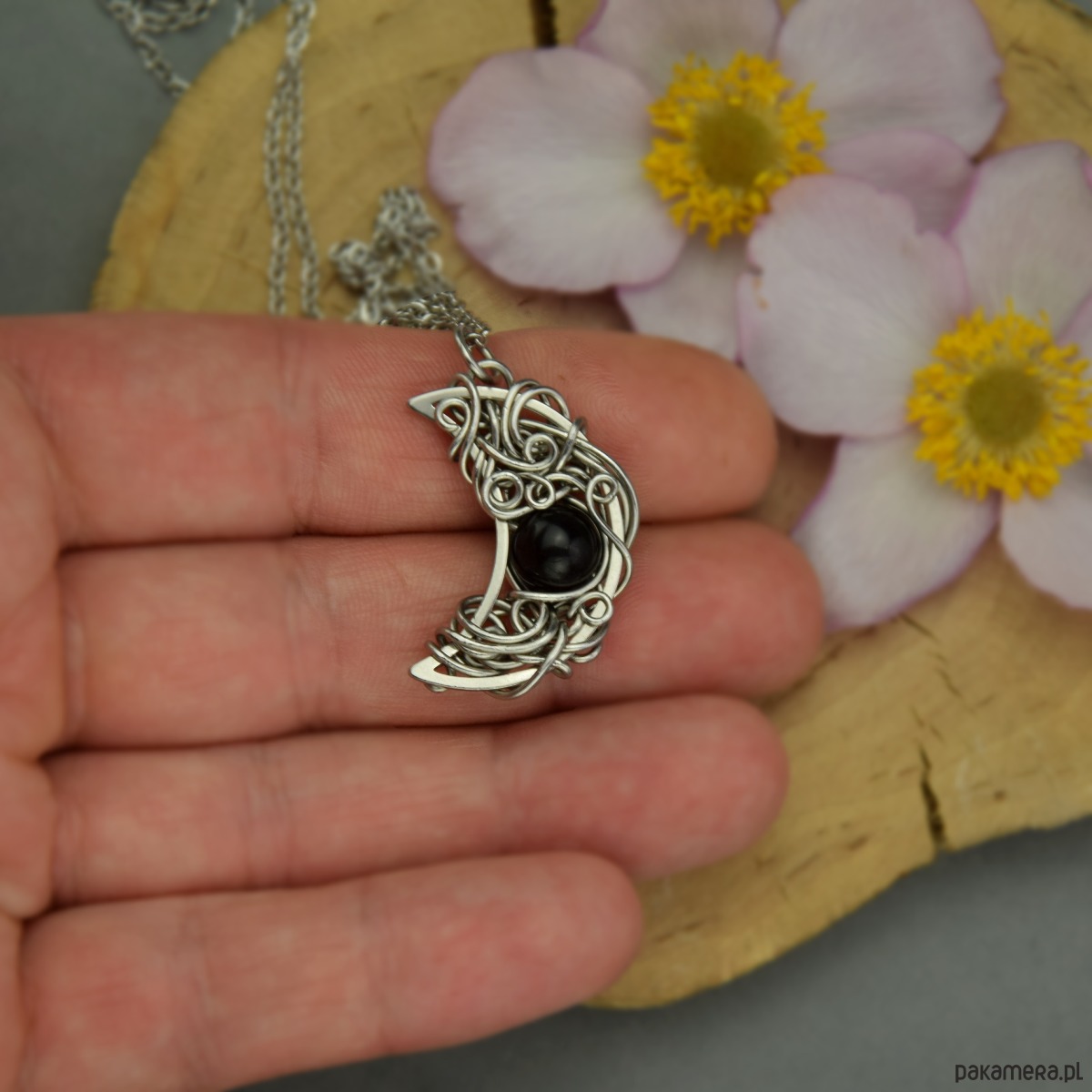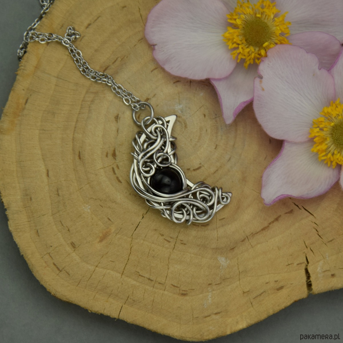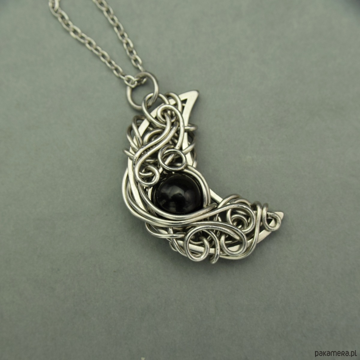 Ręcznie robiony wisiorek księżyc z obsydianem, wykonany techniką wire wrapping z drutów ze stali chirurgicznej.